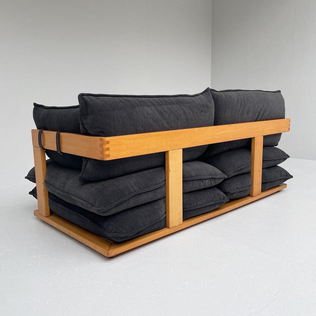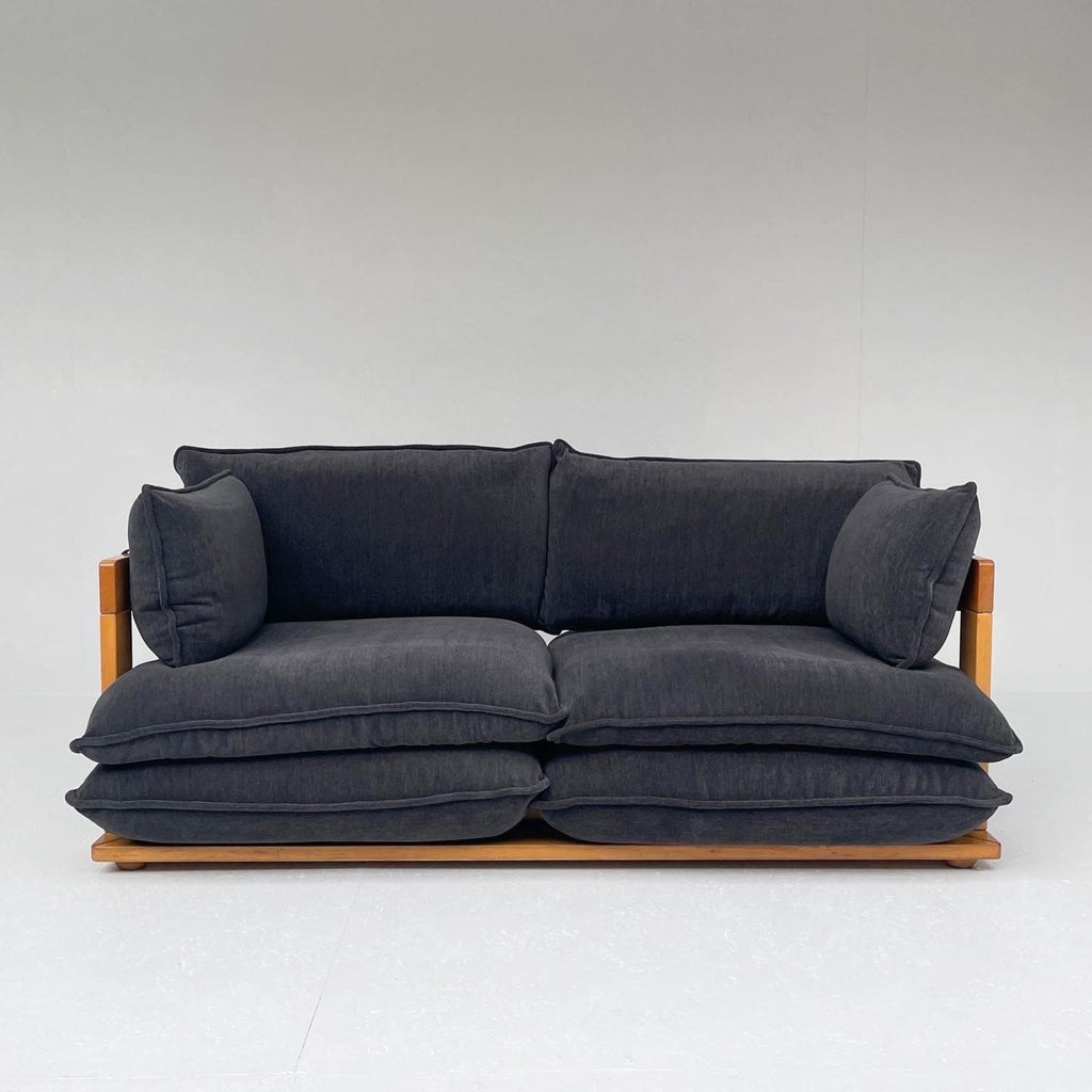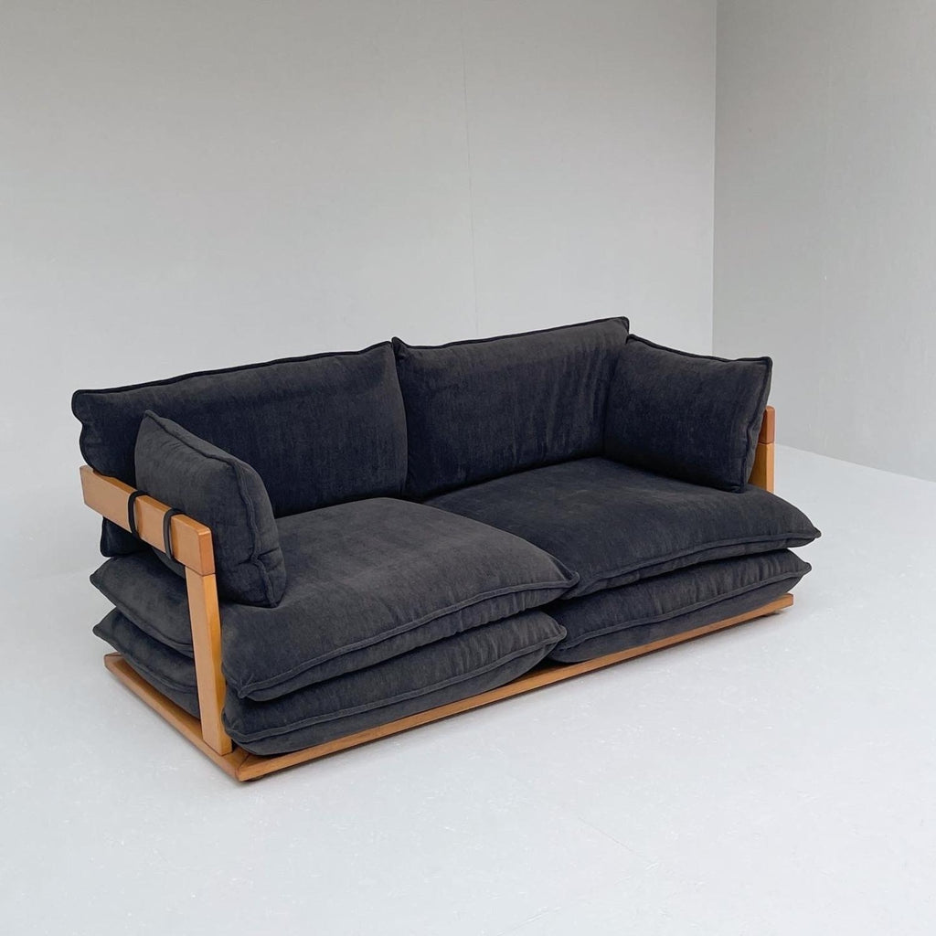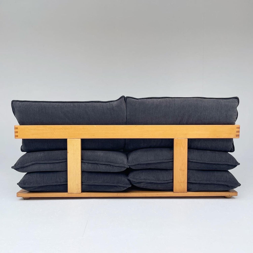 Italian design sofa, in wood and dark blue fabric