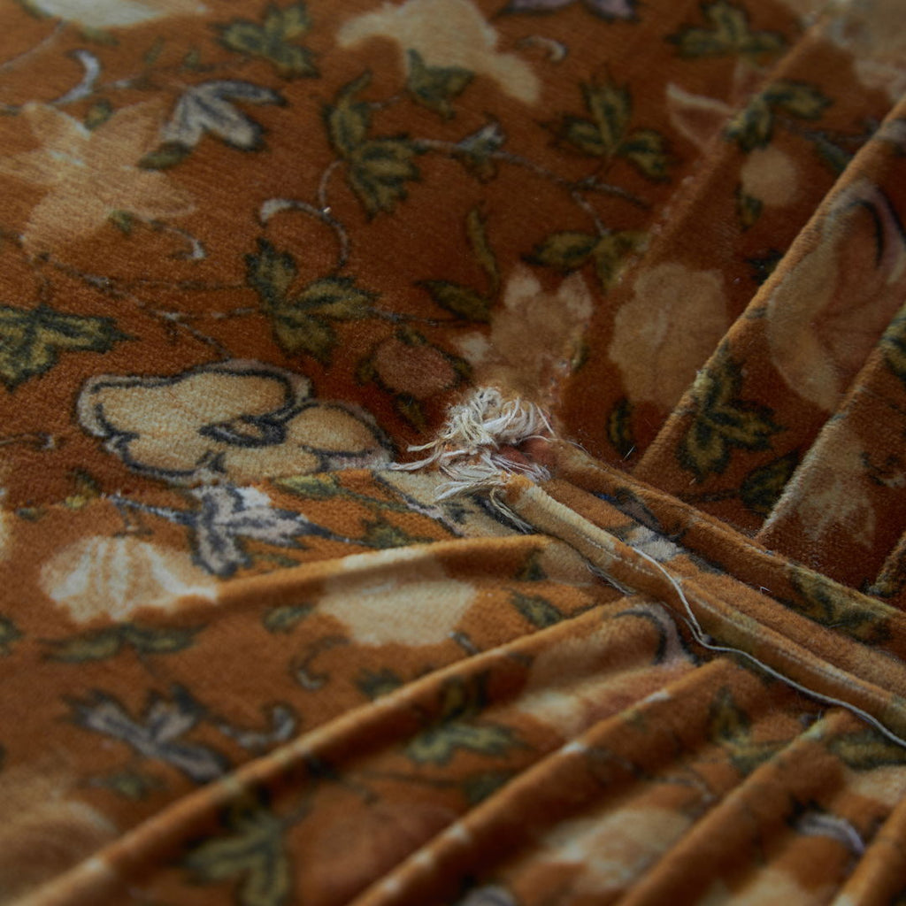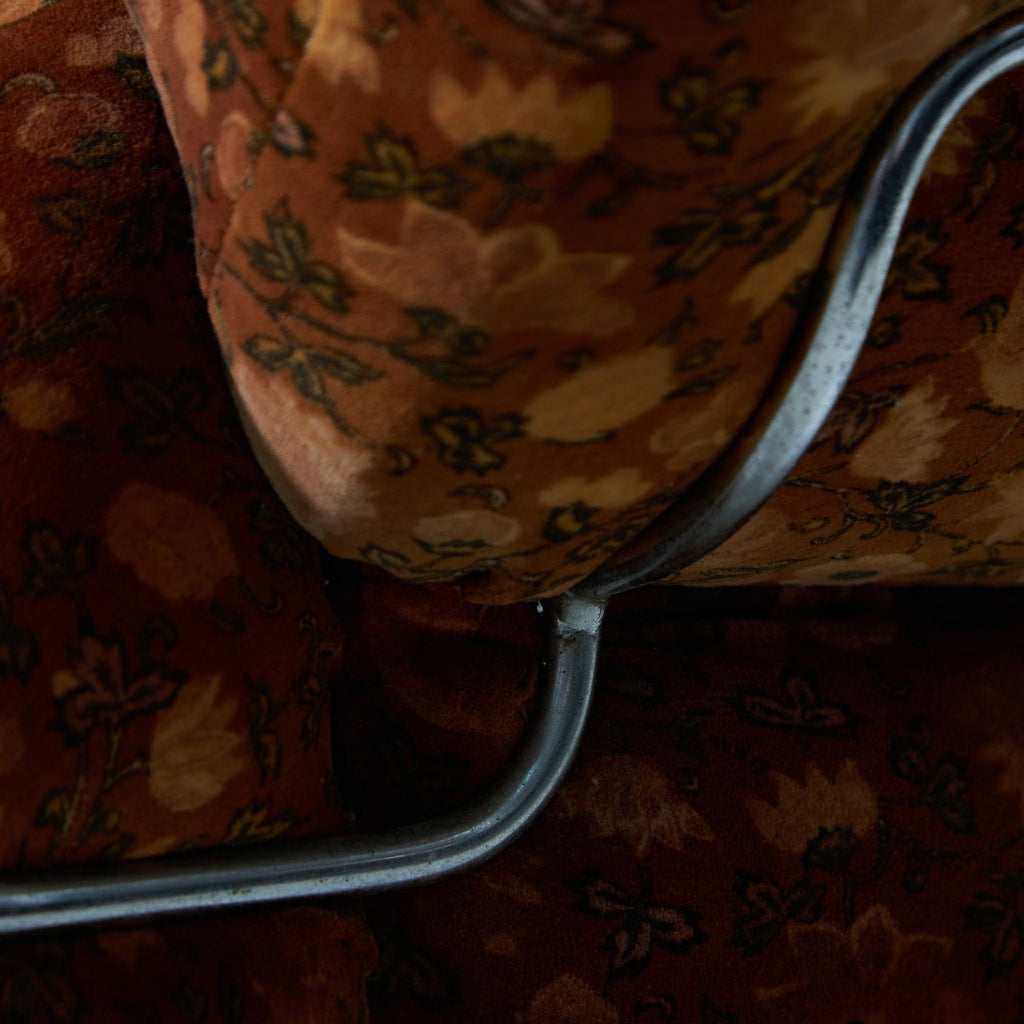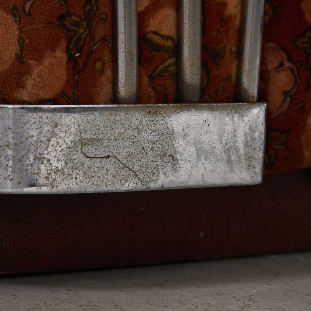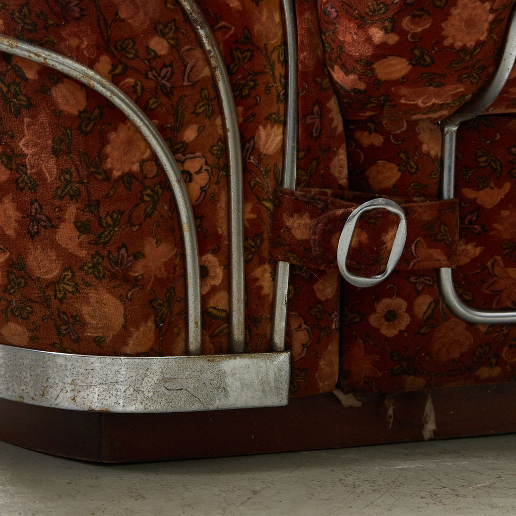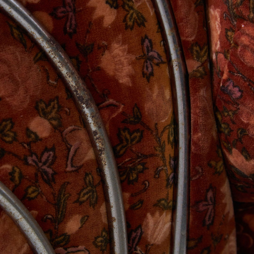 매우 편안한 이탈리안 푸프 안락의자입니다. 귀여운 꽃무늬 장식으로 장식되어 있으며 하단의 크롬 프레임으로 고정되어 있습니다. 커버에는 세월과 사용에 따른 마모 흔적이 보이고 크롬 부분에는 녹과 마모가 있습니다. 2개 구매 가능/개당 가격