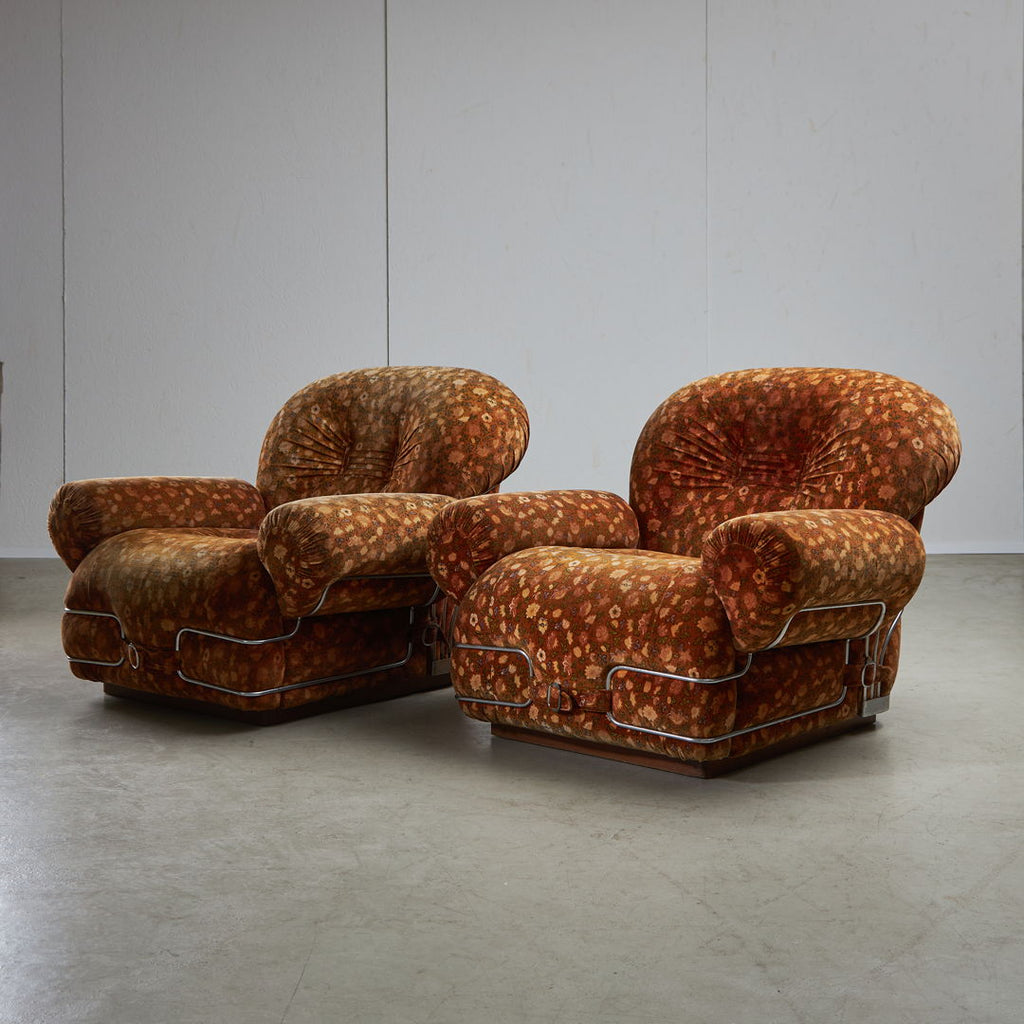 Very comfortable Italian, pouffe armchair with pulled upholstery in a cute, flower pattern, held together by a chrome frame at the bottom. The upholstery shows signs of wear and tear consistent with age and use and the chrome part has rust and abrasion. Two pieces available/price per item
