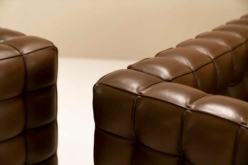부에노스 아이레스 전시회를 위해 1910년 Josef Hoffmann이 디자인한 소파와 클럽 의자로 구성된 상징적인 세트입니다. 이것은 아르헨티나의 독립을 기념하기 위해 조직되었습니다. 1960년부터 이 모델은 오스트리아 제조업체 Wittmann에서 생산되었습니다. Kubus 모델은 오스트리아 디자이너이자 건축가가 만든 가장 유명한 작품 중 하나입니다. 그의 작품은 20세기 초, 두 가지 중요한 미학 운동 사이의 중요한 분기점에 만들어졌습니다. 건축 및 디자인 작업의 생산에 영향을 미친 두 가지 예술 운동은 꽃 장식과 풍부한 선으로 표현된 아르누보와 초기 운동을 갑자기 깨고 더 단순한 선의 필요성을 선언한 모더니즘이었습니다. 그리고 귀중품. 그리고 Hoffmann은 큐브 의자를 사용하여 모더니즘 신조에 접근했습니다. 이 예는 70년대 후반부터 시작되었으며 검은색 다리와 회색 발이 있는 매우 부드러운 갈색 아닐린 가죽으로 만들어졌습니다. 레이블이 표시되어 있지 않습니다. 발에는 가벼운 표면 긁힌 자국만 가까이서 볼 수 있습니다. 그렇지 않으면 세트의 상태가 우수합니다. 명시된 가격은 소파 1개와 의자 1개 세트 가격입니다. 소파 너비: 165cm / 65" | 의자 너비: 95cm / 37.4" | 깊이: 80/31.5" | 높이: 70/29.2" | 좌석 높이: 40cm / 15.7"