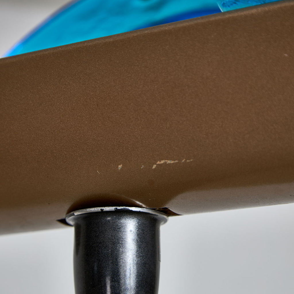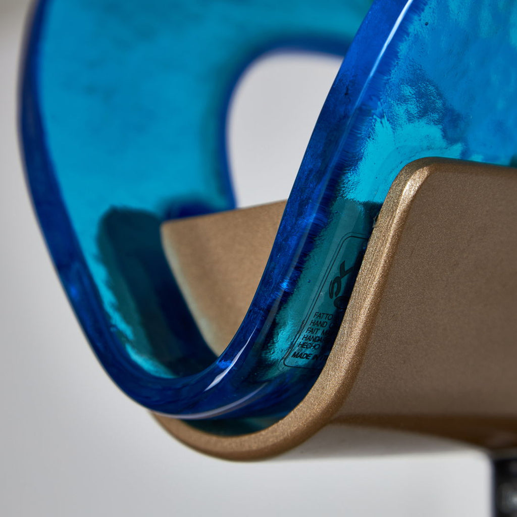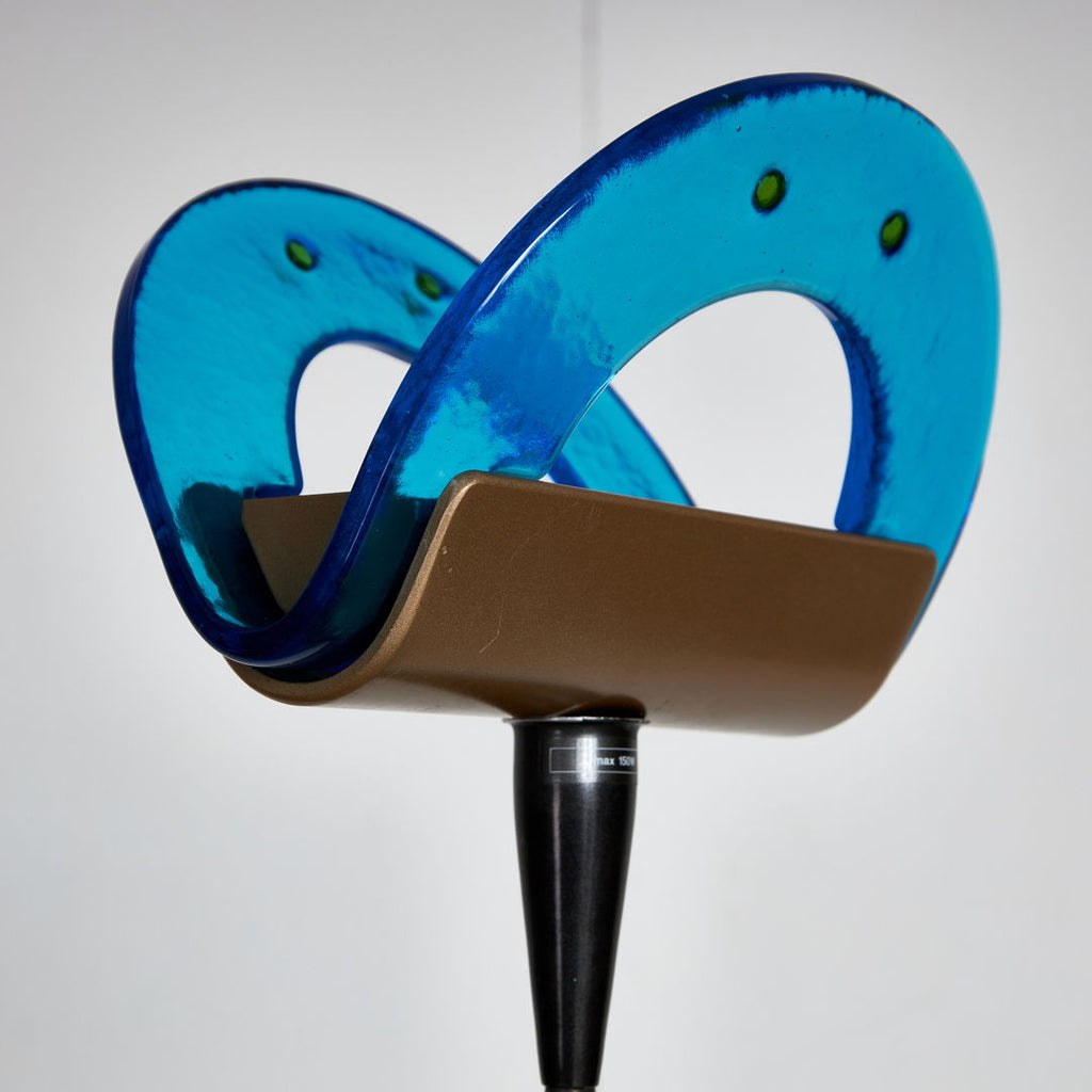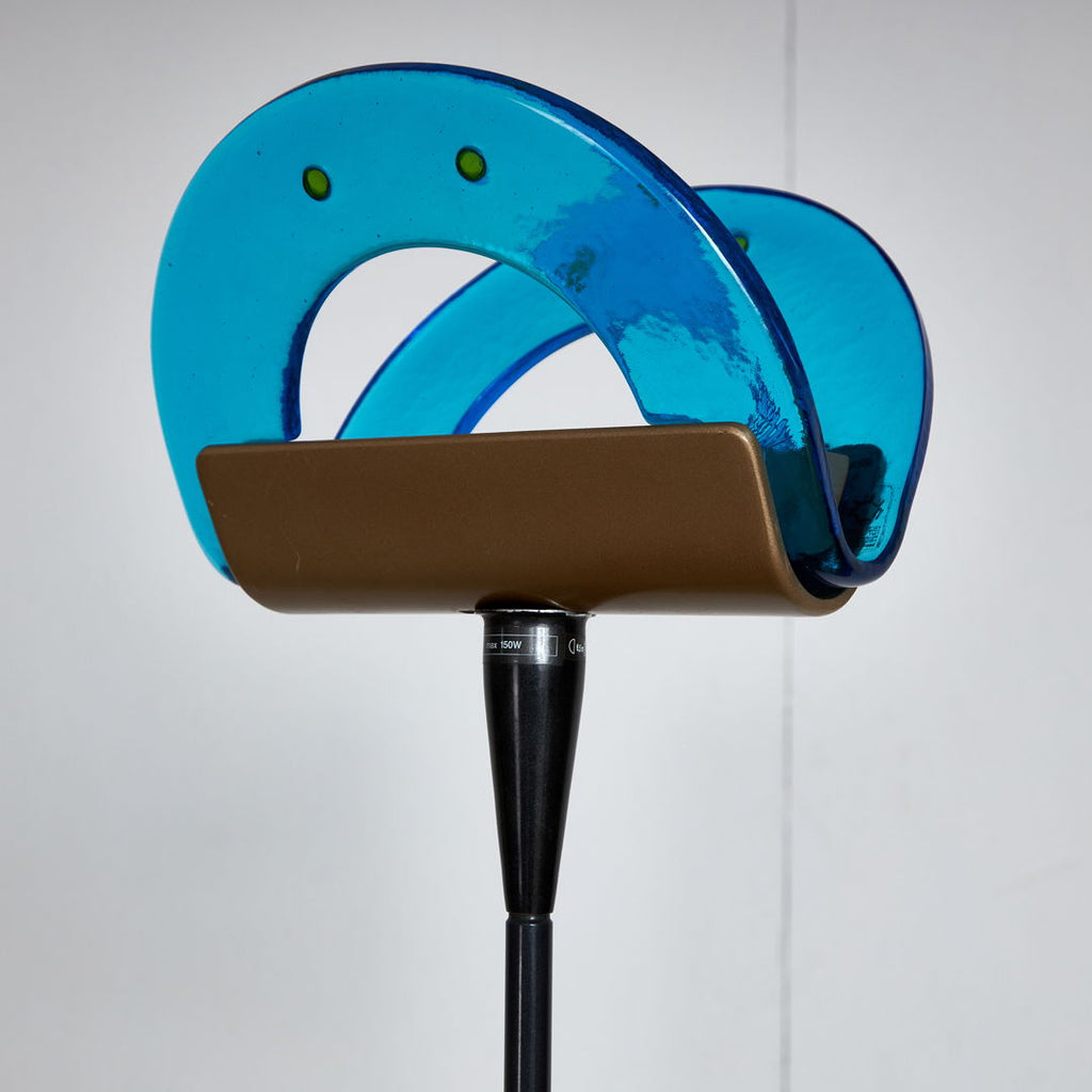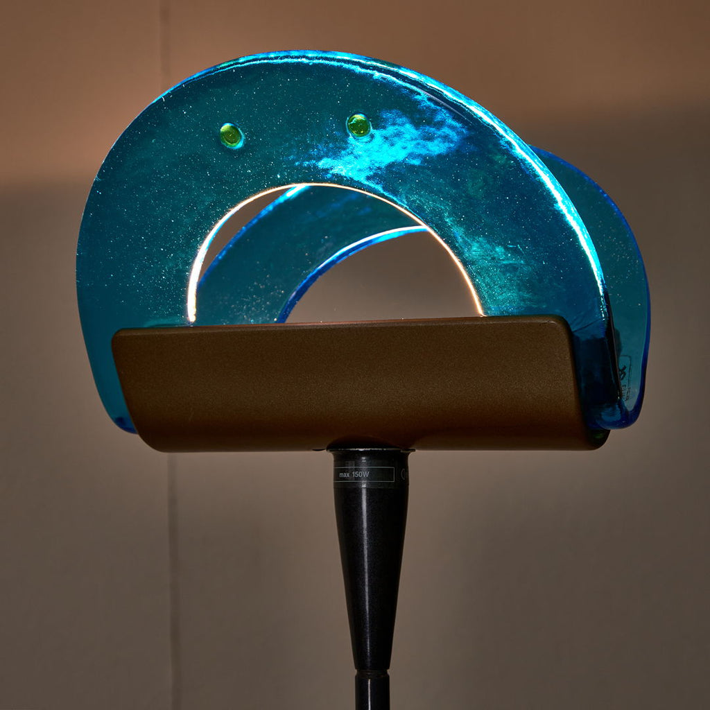 This 1980s Leucos floor lamp in Memphis style design showcases a turquoise blue glass shade adorned with yellow dots. Bearing the prestigious labels of "VM Vetri Murano" and "Leucos, handcrafted Made In Italy," this unique piece displays the craftsmanship and quality that is synonymous with the Leucos brand. Founded in 1962 in Venice, Italy, Leucos has built a solid reputation for their vast selection of intricately designed lighting fixtures. Collaborating with top architects and designers, Leucos continually pushes the boundaries of lighting design through their own innovative research and experimentation. This item is in excellent vintage condition.