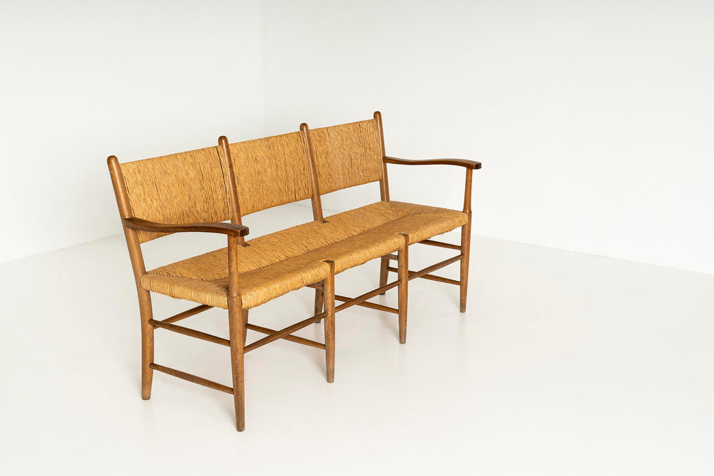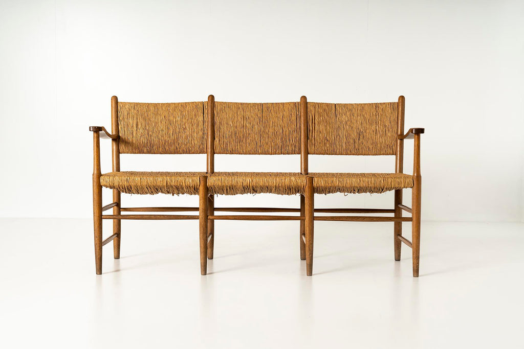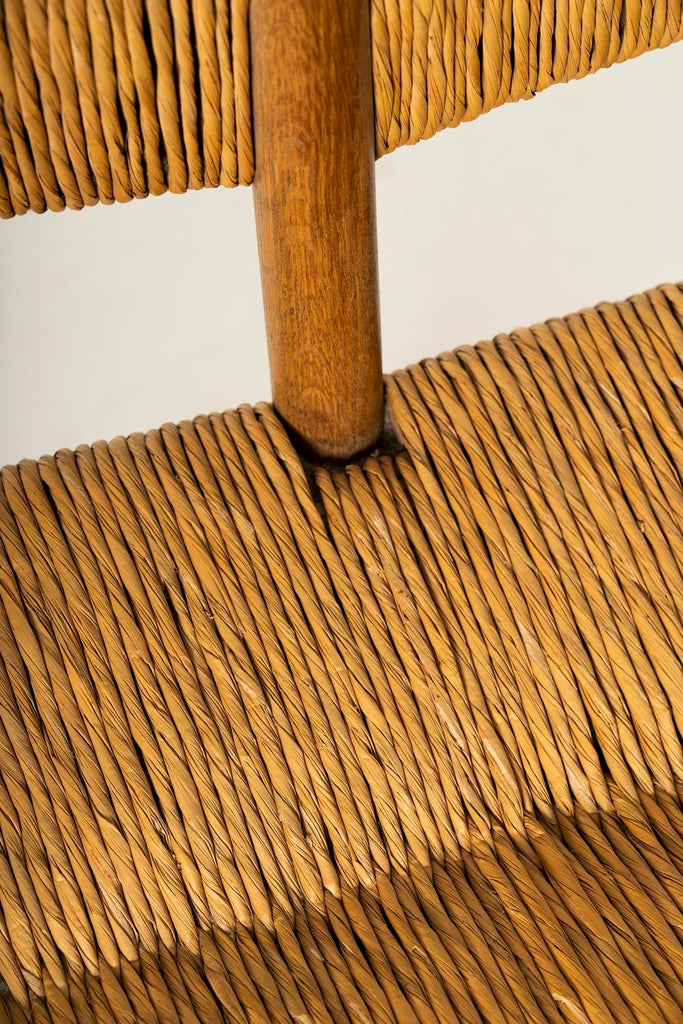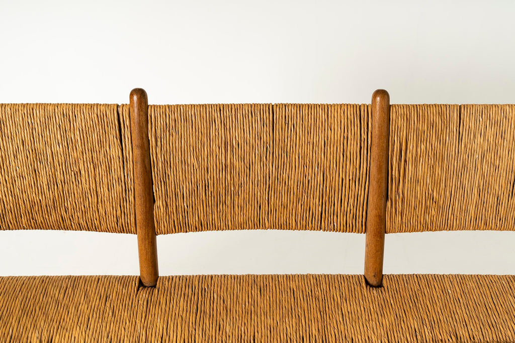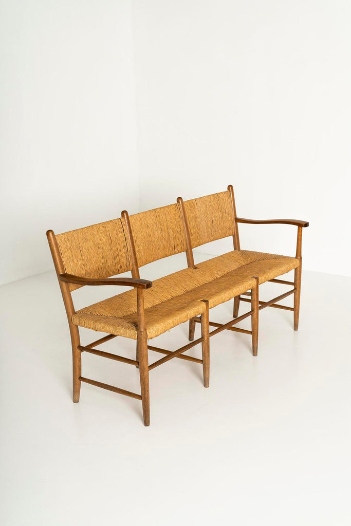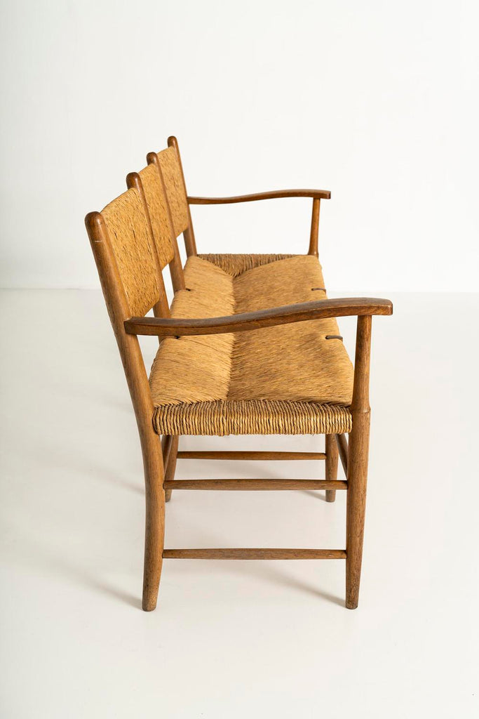 오크와 짚으로 만든 멋진 빈티지 벤치. 이 벤치는 소박하고 지방적인 디자인이 우아함과 아름답게 조화를 이루고 있습니다. 짚으로 만든 좌석은 전원적인 시골 느낌을 주지만 슬림한 다리는 우아한 느낌을 줍니다. 어울리는 의자 세트가 있습니다. 벤치는 노후된 관계로 정상적인 사용감이 있는 양호한 상태입니다.