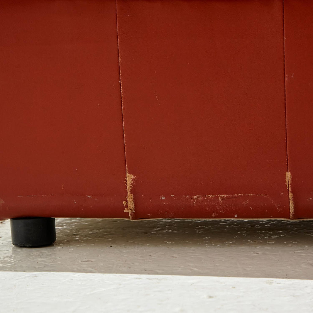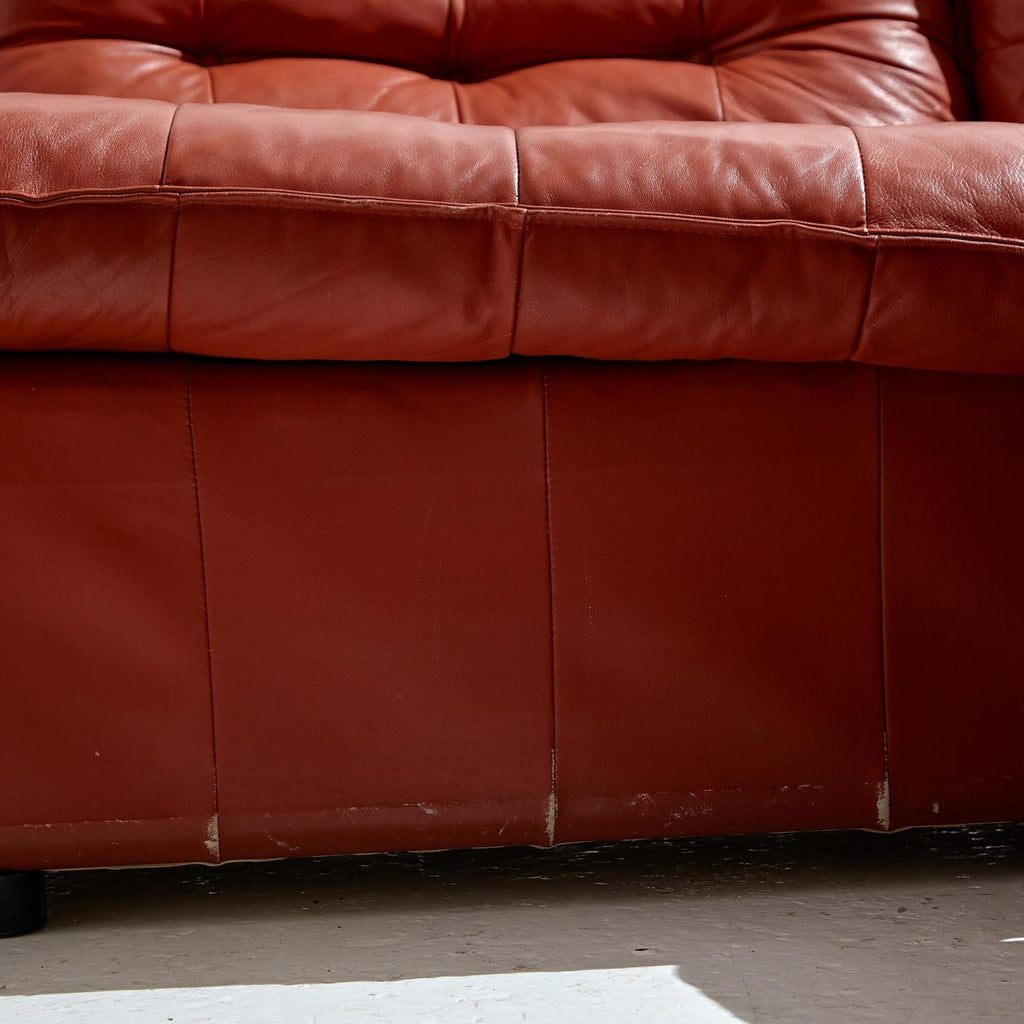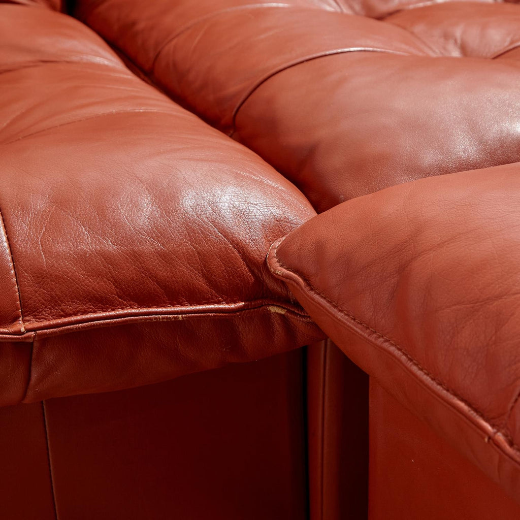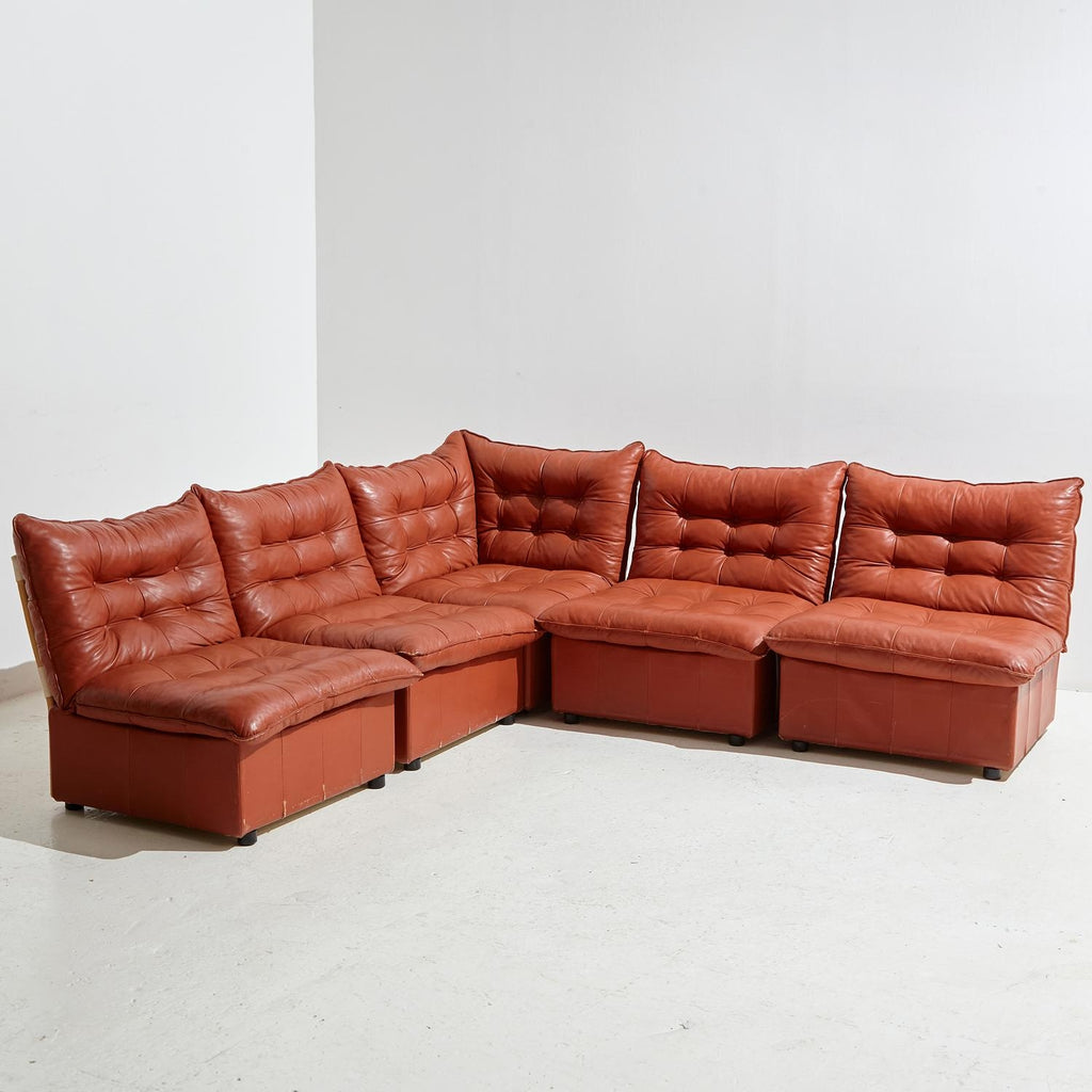 1970년대의 5인용 모듈식 가죽 소파 세트. 가죽과 너도밤나무 부분에 약간의 표면 긁힘, 얼룩 및 마모가 있습니다. 약간의 사용 흔적이 있는 빈티지 상태입니다.