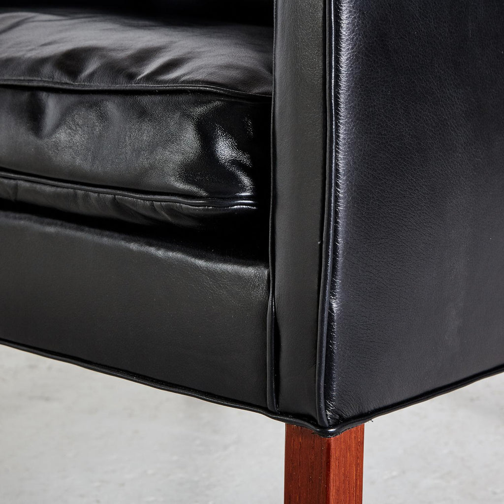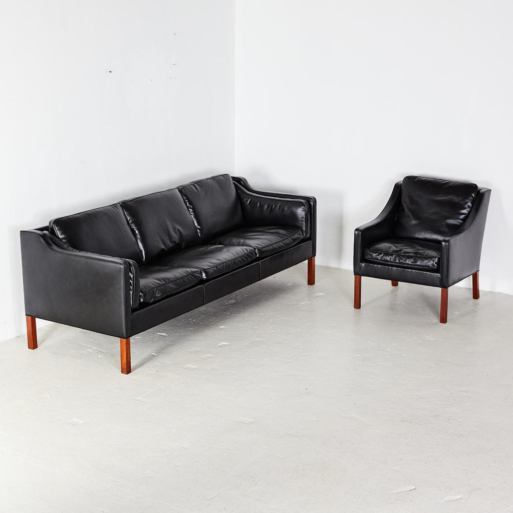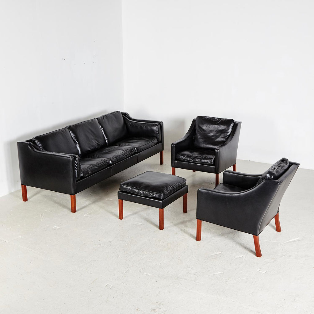Børge Mogensen 새로 덧씌워진 검정 가죽 3인용 소파와 발판이 있는 안락의자 2개, Fredericia Stolefabrik 덴마크 제작(1962)