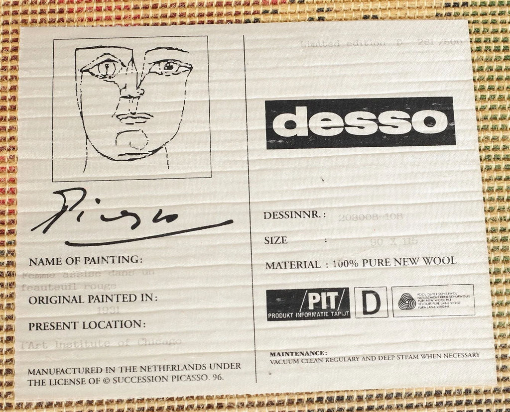 1931년 피카소의 그림 "Femme assise dans un fauteuil rouge"를 그린 후 1996년 Desso가 제작한 순수한 고품질 울 러그입니다. 이것은 No. 261/500입니다. 포함. 러그를 벽에 걸 수 있는 서스펜션 시스템. 상태가 매우 좋습니다.