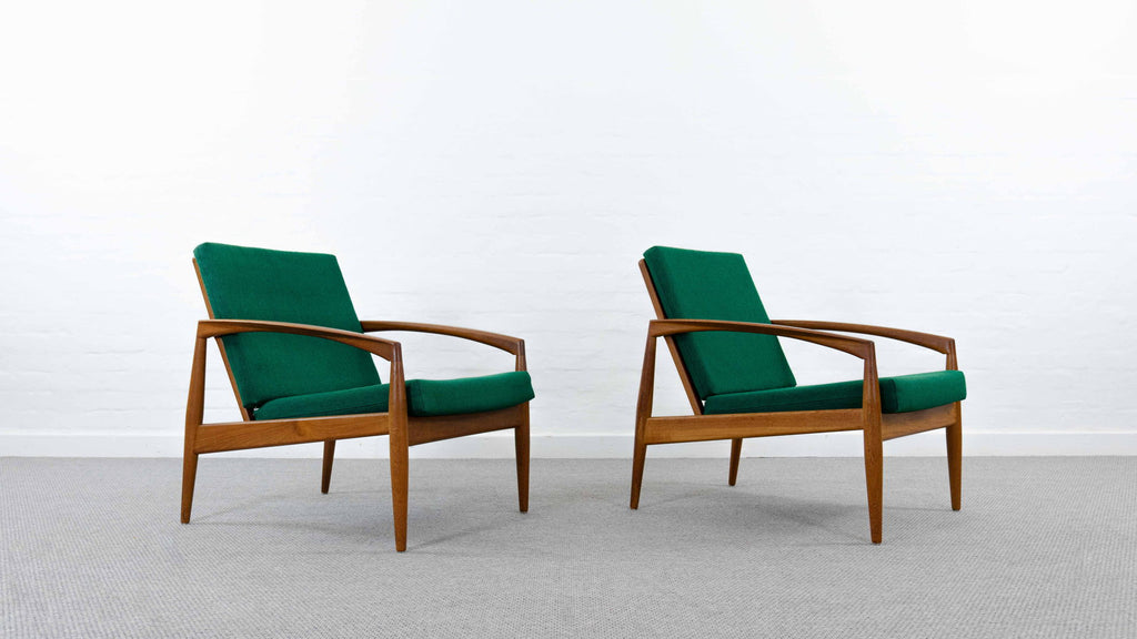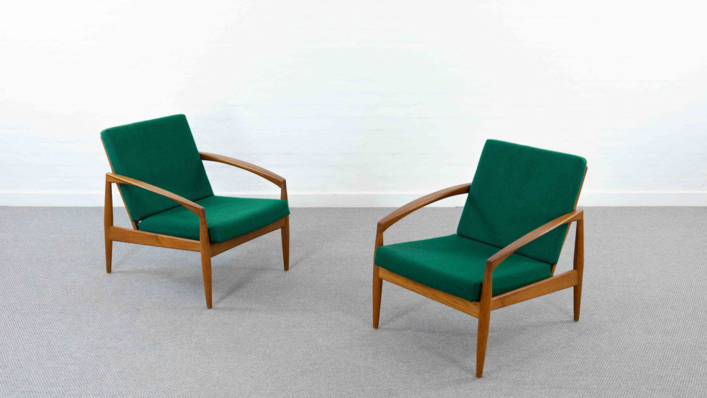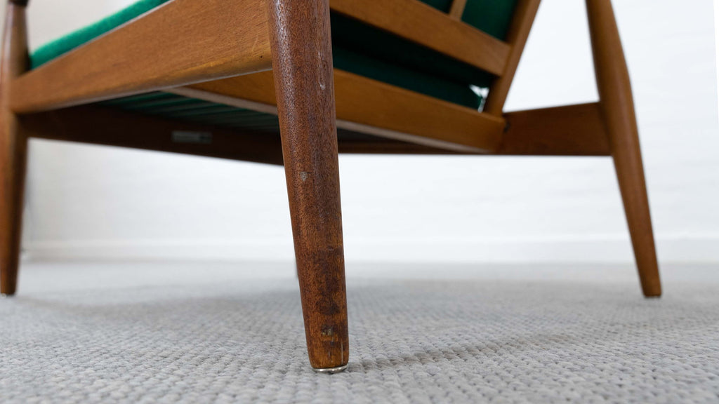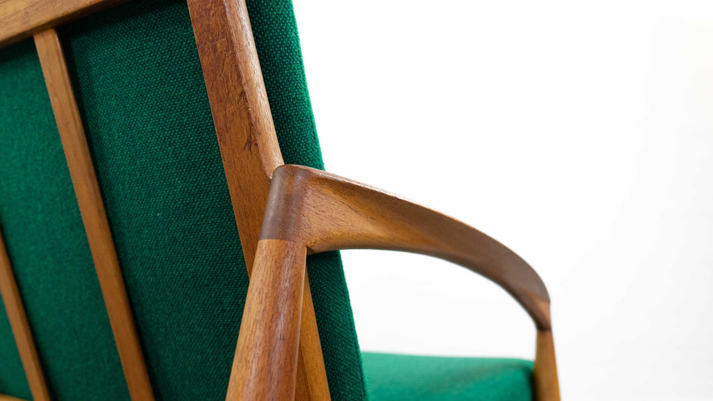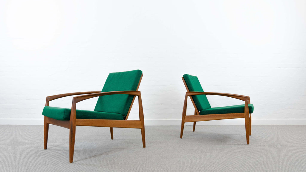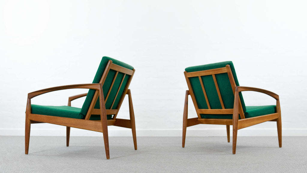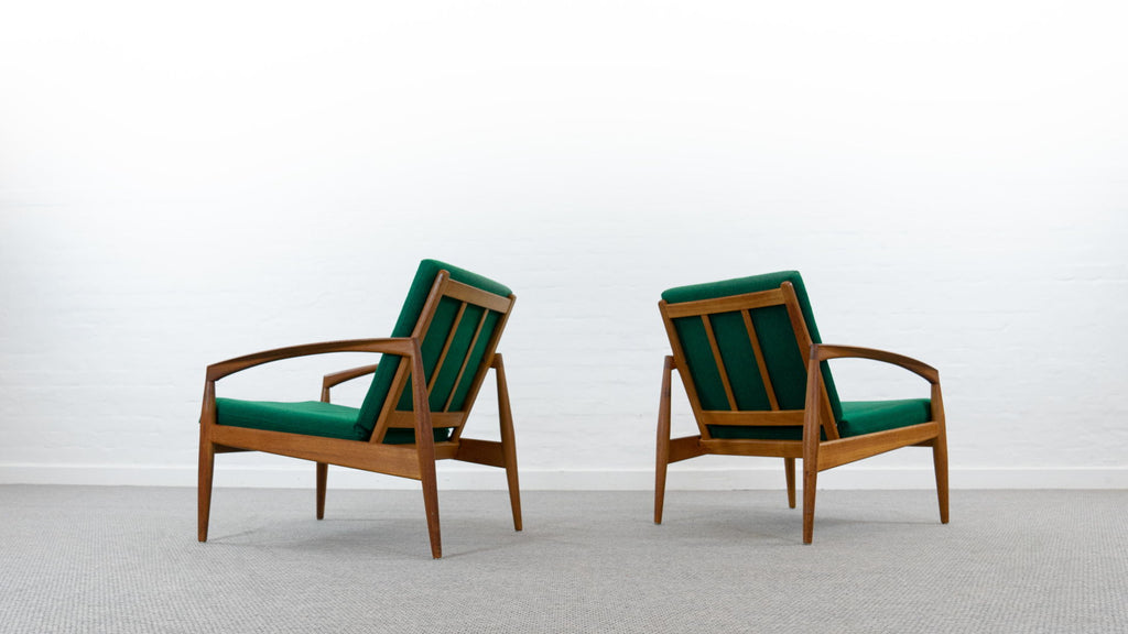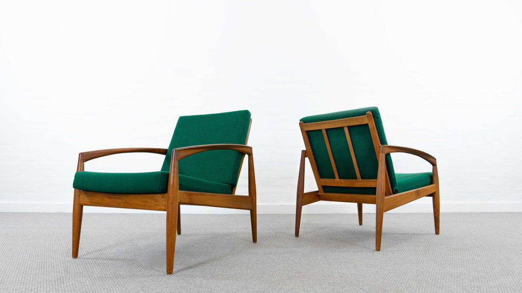 Pair of Danish armchairs, designed 1955 by Kai Kristiansen for Magnus Olesen. Model Nr. 121. So called „Paper Knive Chairs“. Executed in Teakwood with original green fabrics. Both chairs with manufacturers label. Wear consistent with age and use. Signs of use at the legs. One chair shows a darkend spot on right front leg. One spiral-string shows small thinned part. Non-smoking Objects.