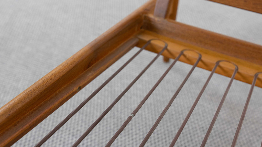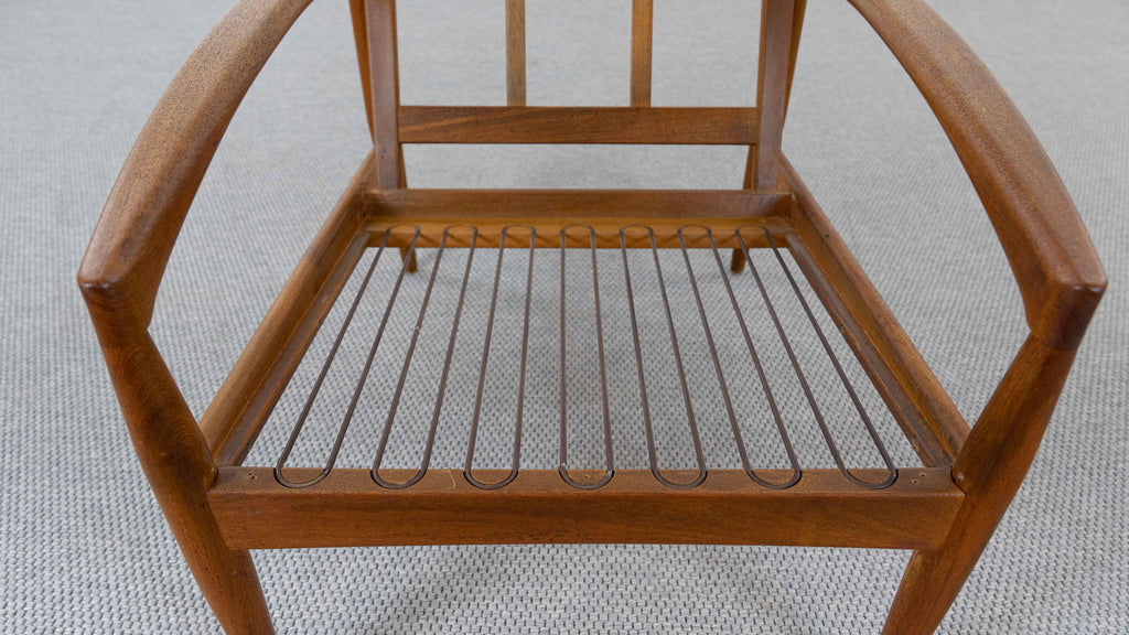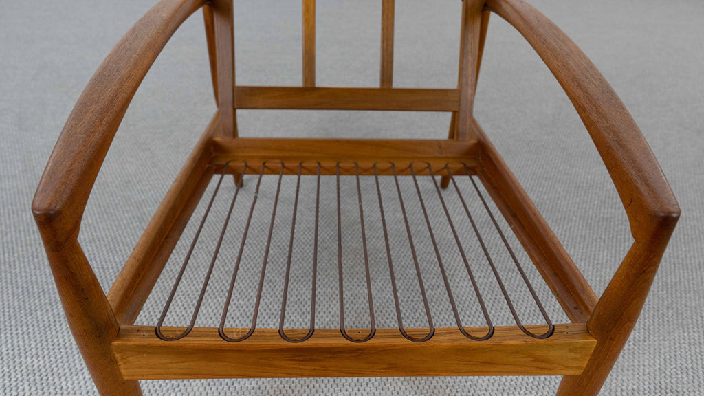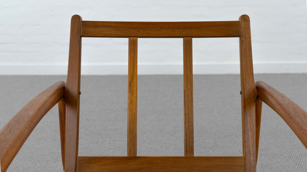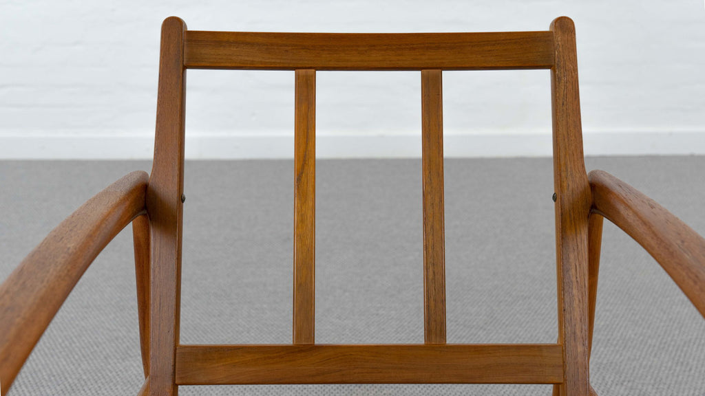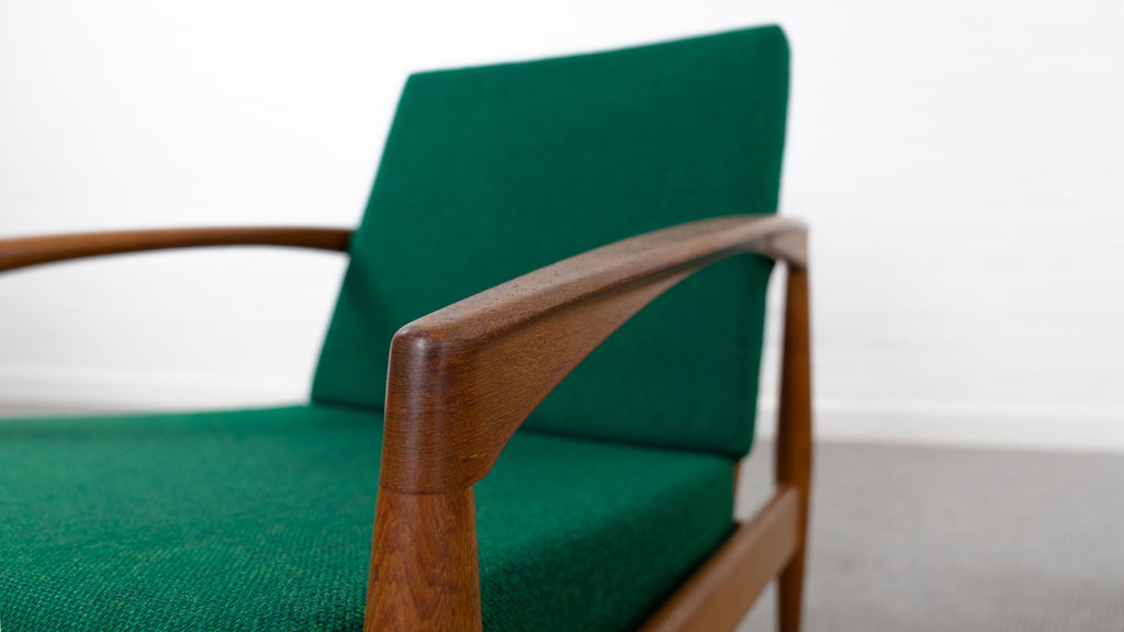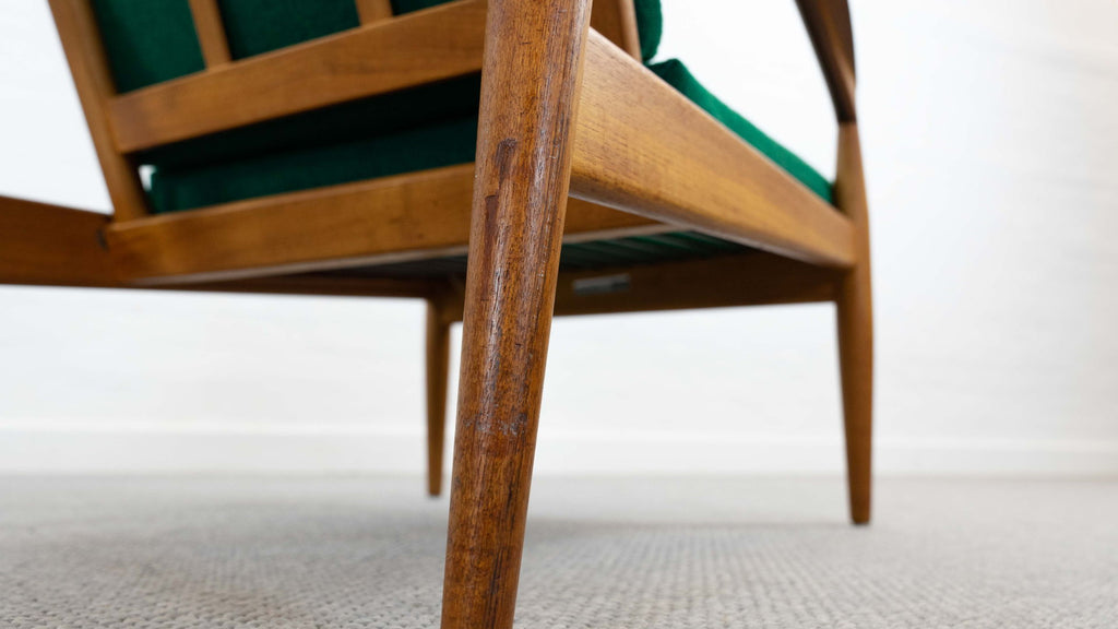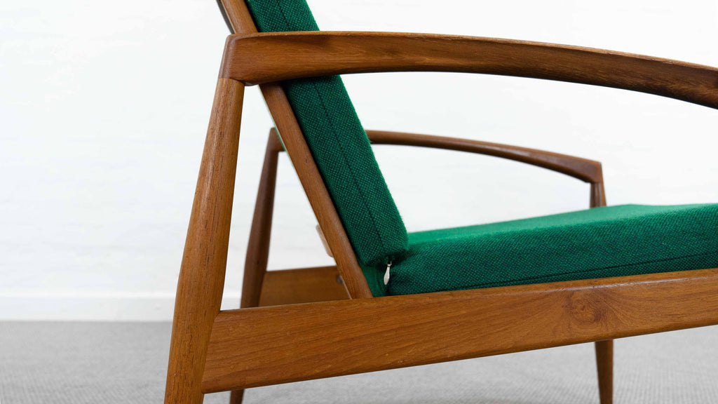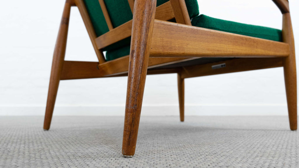 Pair of Danish armchairs, designed 1955 by Kai Kristiansen for Magnus Olesen. Model Nr. 121. So called „Paper Knive Chairs“. Executed in Teakwood with original green fabrics. Both chairs with manufacturers label. Wear consistent with age and use. Signs of use at the legs. One chair shows a darkend spot on right front leg. One spiral-string shows small thinned part. Non-smoking Objects.