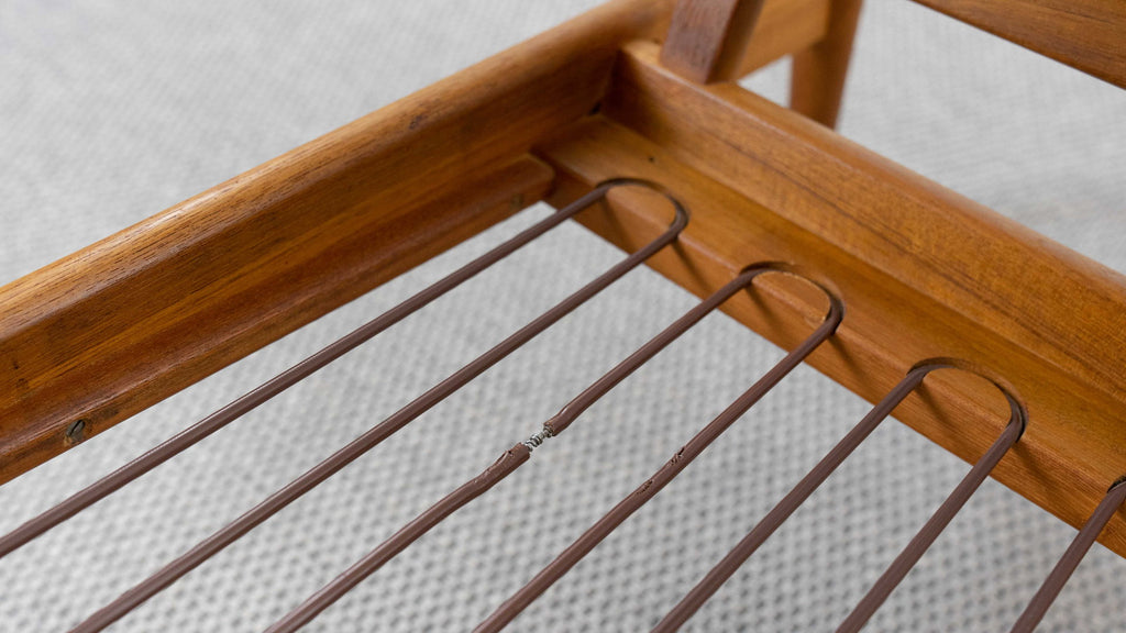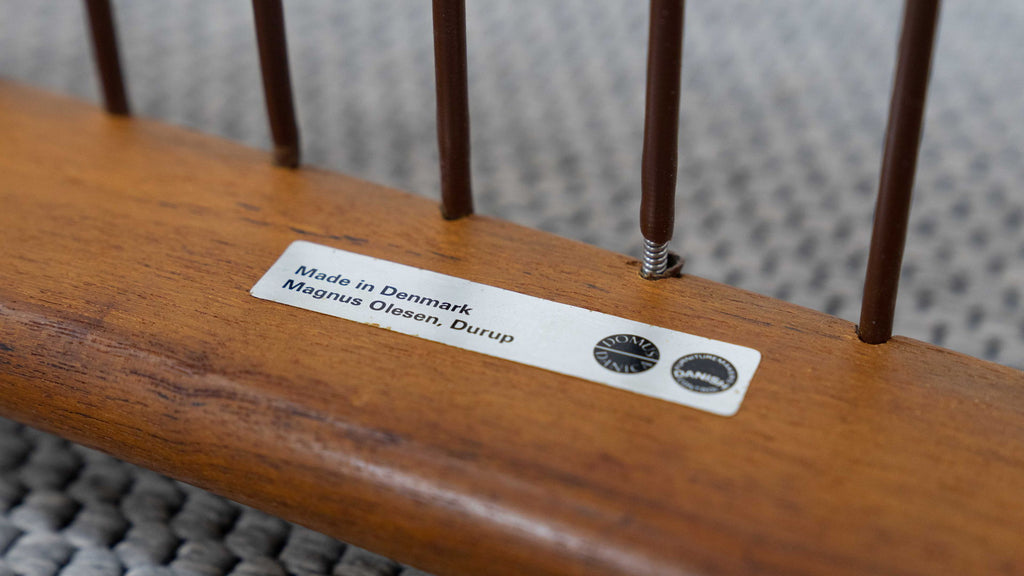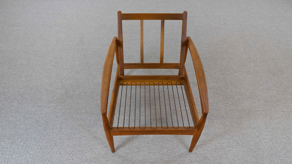 Magnus Olesen을 위해 Kai Kristiansen이 1955년 디자인한 덴마크식 안락의자 한 쌍. 모델번호 121. 소위 "종이칼 의자"라고 불립니다. 오리지널 그린 패브릭을 사용하여 티크우드에서 제작되었습니다. 두 의자 모두 제조업체 라벨이 붙어 있습니다. 연령과 용도에 맞게 착용하십시오. 다리에 사용 흔적이 있습니다. 한 의자의 오른쪽 앞다리에 어두운 점이 보입니다. 하나의 나선형 끈은 작고 얇은 부분을 보여줍니다. 금연 개체.