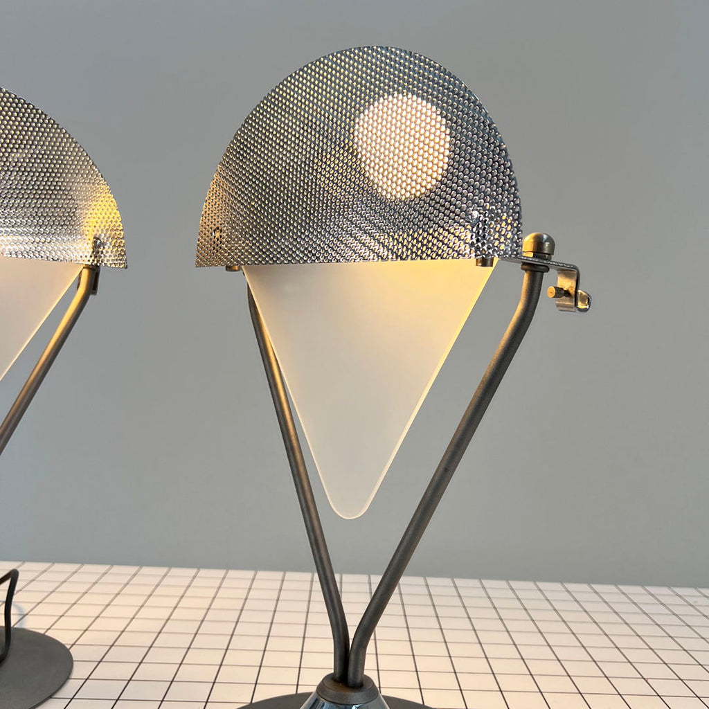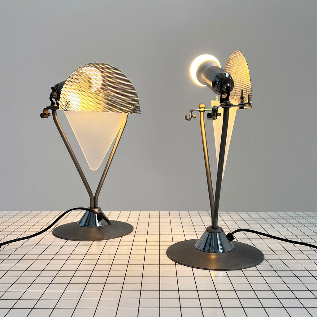Stilux Milano의 천공 금속 및 유리 테이블 램프 쌍, 1980년대 생산자 - Stilux Milano 디자인 기간 - 80년대 측정 - 폭 20cm x 깊이 20cm x 높이 41cm 재질 - 금속 색상 - 은색 전기적 특성 - 유럽식 플러그(최대 240V) ) / 전구 E27 상태 - 좋은 코멘트 - 연식 및 사용감에 따른 가벼운 마모.