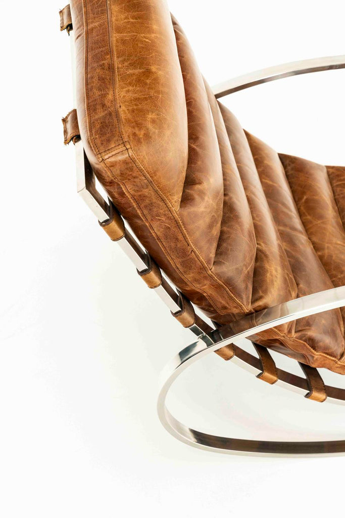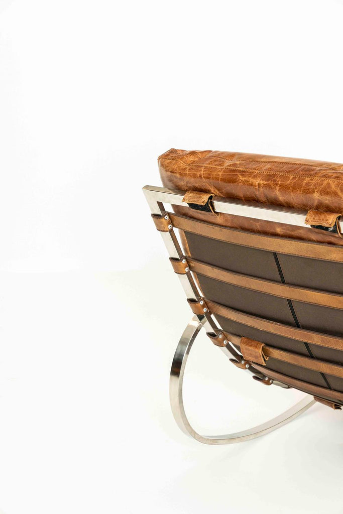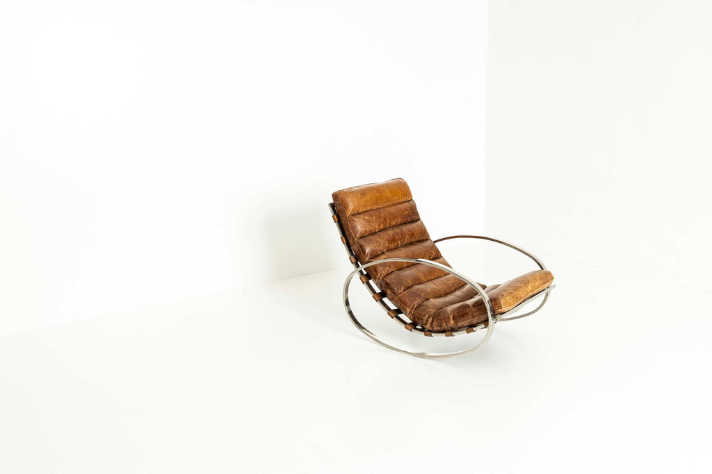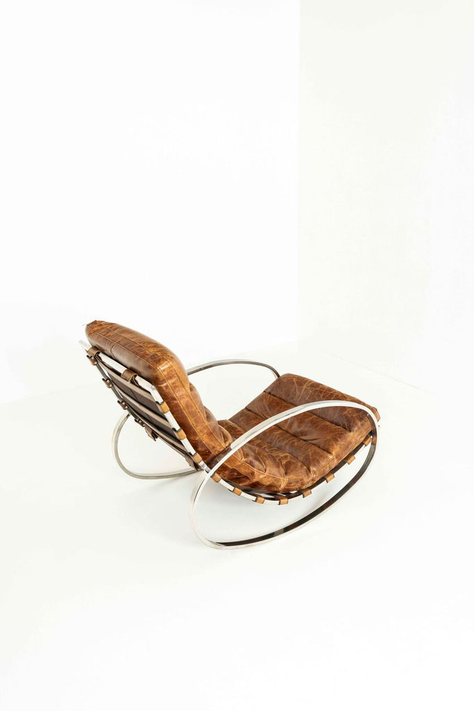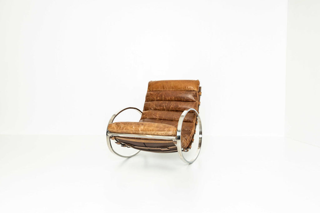 1970년대 이탈리아 브라운 가죽과 크롬 소재의 Renato Zevi의 흔들의자 'Ellipse'.