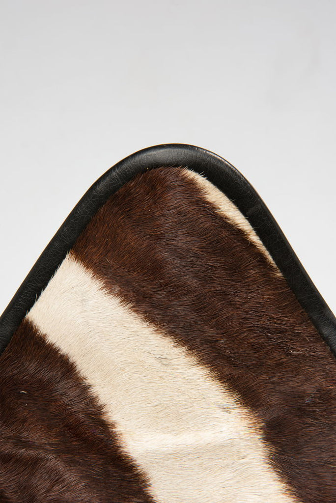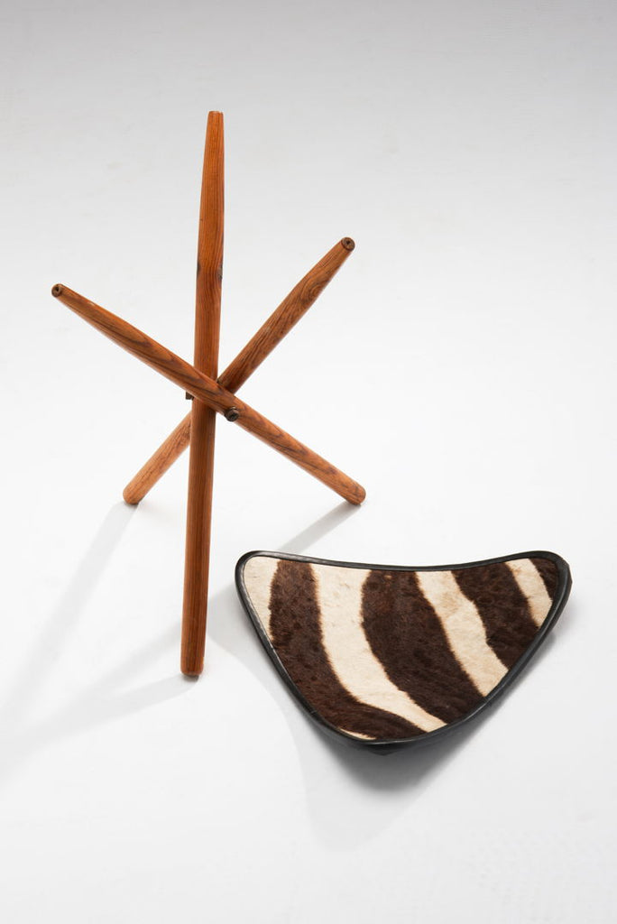 A zebra hide folding hunting stool or camp stool from the 50ties. The tripod base is made in oak wood and has a beautiful patine. The stool can also be used as a side table. After more then 60 years the chairs shows some signs of use.