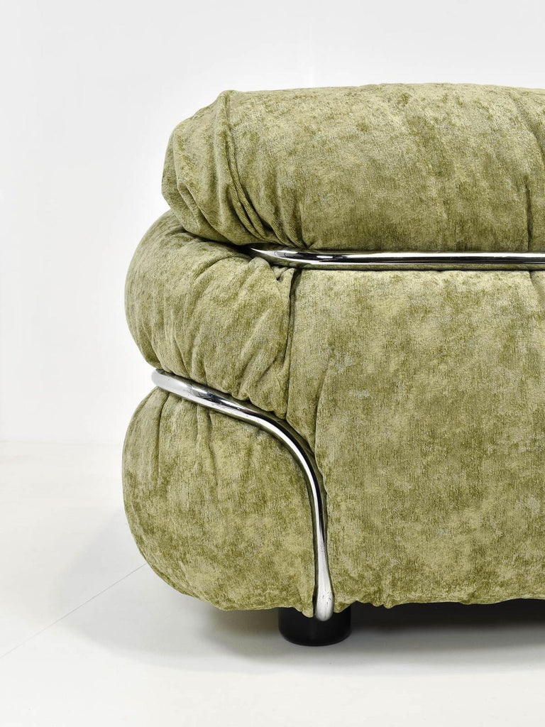 전문 장인에 의해 고품질 세이지 그린 벨벳 패브릭으로 새롭게 업홀스터리되었습니다. 폼, 패브릭 및 크롬 도금된 관형 금속 프레임이 최상의 상태를 유지하고 있습니다.