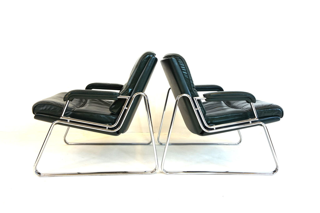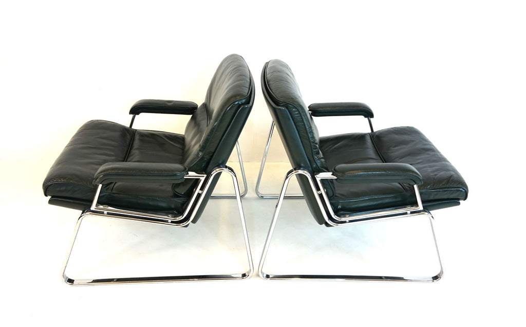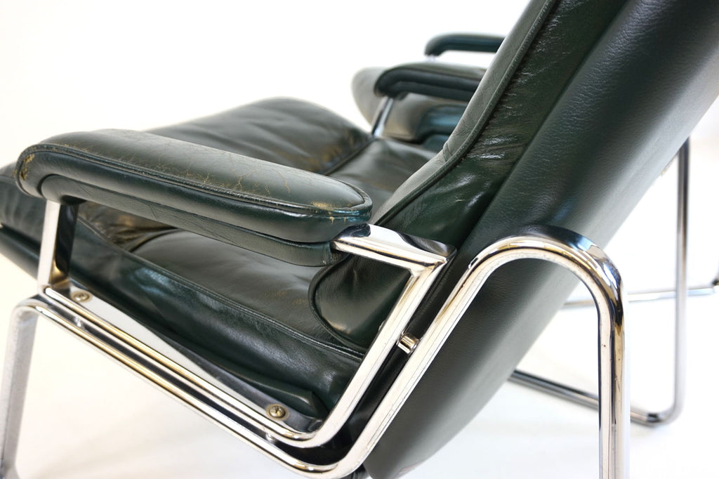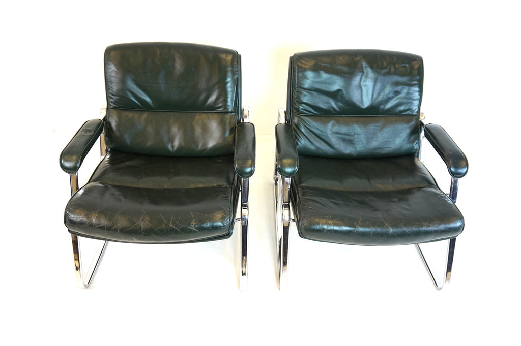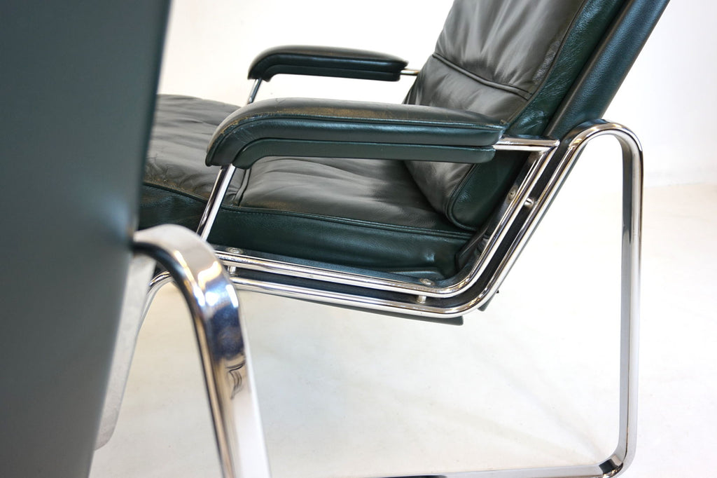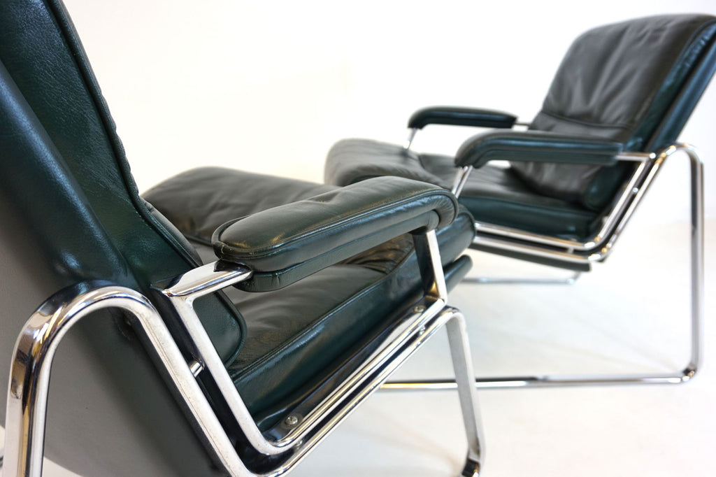 녹색 시트 쉘이 있는 뛰어난 녹색 가죽 소재의 Drabert 라운지 의자 한 쌍입니다. 의자의 상태는 매우 좋으며, 시트 쉘과 시트 및 등받이 쿠션의 가죽 상태는 양호하며 팔걸이 및 시트 쿠션에 녹청이 있습니다. 곡선형 크롬 프레임은 두 안락의자 모두에 완벽하게 어울립니다. 이 모델은 팔걸이가 있는 버전을 찾기가 어렵습니다. Gerd Lange는 1970년대 독일 제조업체 Drabert를 위해 명확하고 매우 역동적인 디자인으로 이 라운지 의자를 디자인했습니다. Gerd Lange는 현재 구겐하임 미술관에 전시되어 있는 Drabert를 위한 SM 400 의자도 디자인했습니다. Drabert는 60~70년대 가장 중요한 사무용 가구 제조업체 중 하나로 최고 품질의 사무용 가구를 생산했습니다.