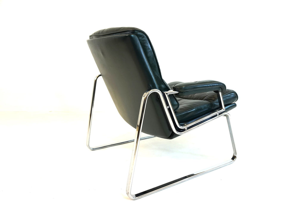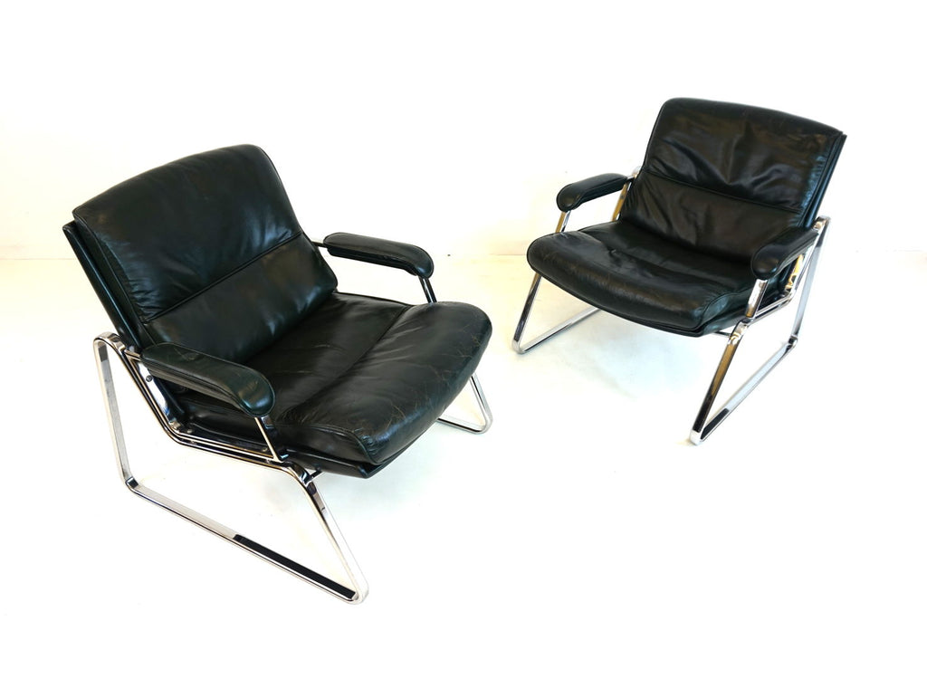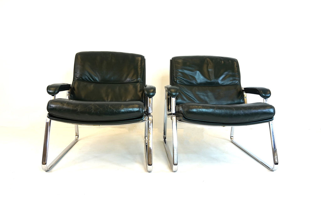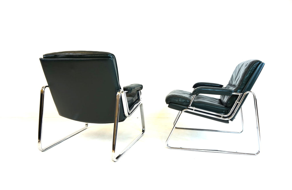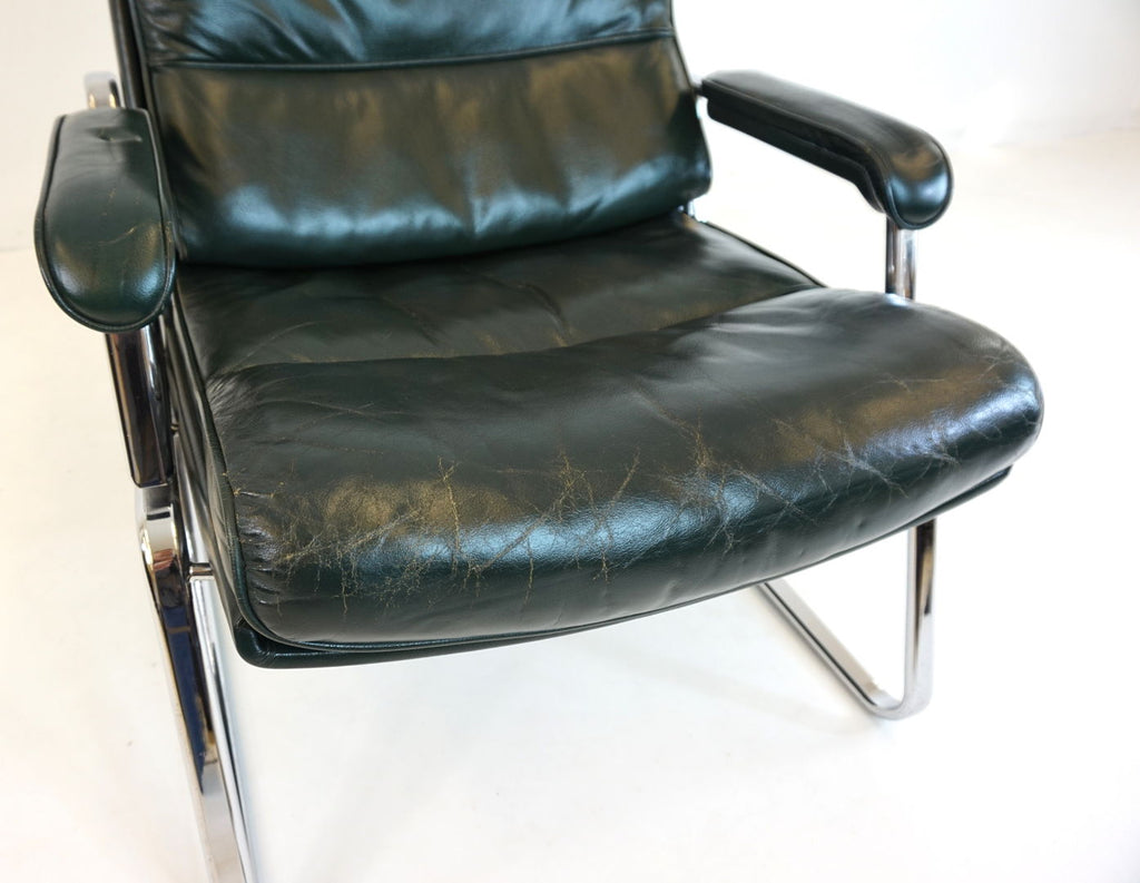 녹색 시트 쉘이 있는 뛰어난 녹색 가죽 소재의 Drabert 라운지 의자 한 쌍입니다. 의자의 상태는 매우 좋으며, 시트 쉘과 시트 및 등받이 쿠션의 가죽 상태는 양호하며 팔걸이 및 시트 쿠션에 녹청이 있습니다. 곡선형 크롬 프레임은 두 안락의자 모두에 완벽하게 어울립니다. 이 모델은 팔걸이가 있는 버전을 찾기가 어렵습니다. Gerd Lange는 1970년대 독일 제조업체 Drabert를 위해 명확하고 매우 역동적인 디자인으로 이 라운지 의자를 디자인했습니다. Gerd Lange는 현재 구겐하임 미술관에 전시되어 있는 Drabert를 위한 SM 400 의자도 디자인했습니다. Drabert는 60~70년대 가장 중요한 사무용 가구 제조업체 중 하나로 최고 품질의 사무용 가구를 생산했습니다.