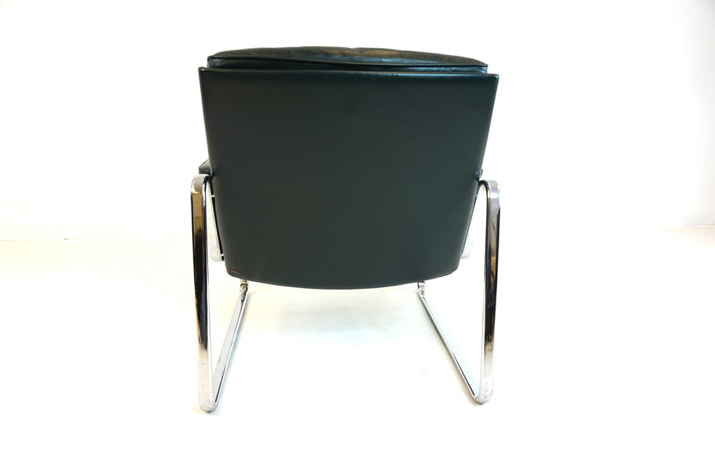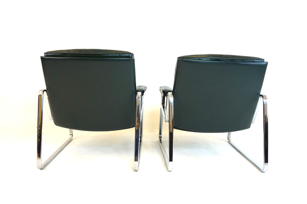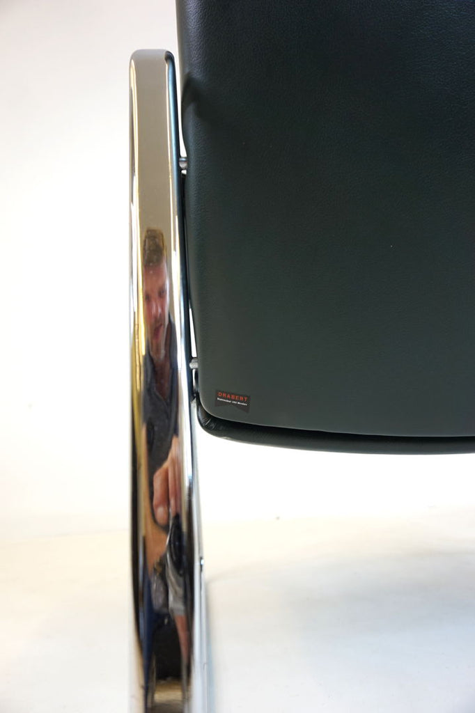 A pair of Drabert lounge chairs in an exceptional green leather with green seat shells. The condition of the chairs is very good, the seat shells and the leather of the seat and back cushions are in good condition with patina on the armrests and the seat cushions. The curved chrome frame is flawless on both armchairs. This model is the hard to find version with armrests.