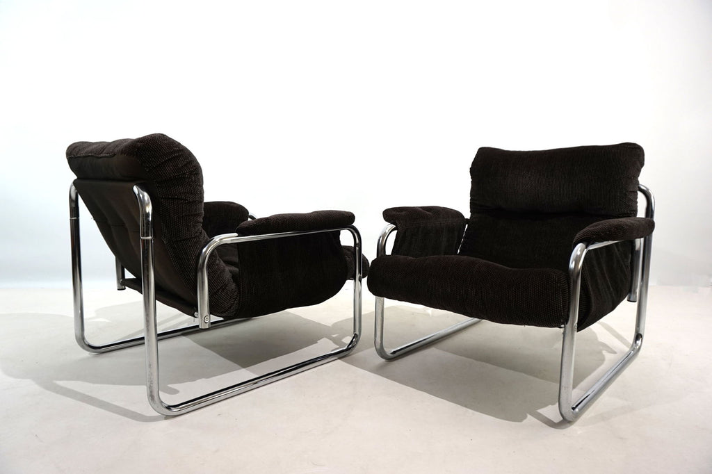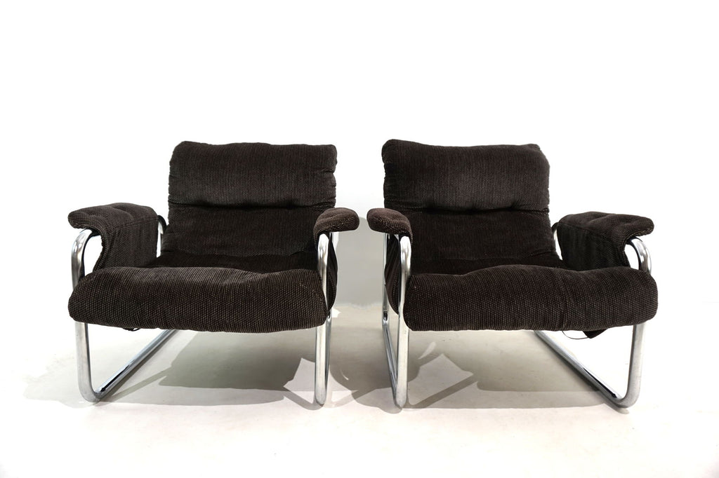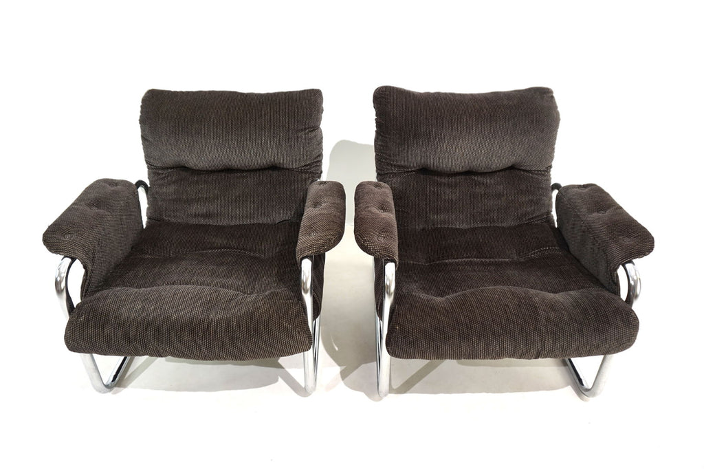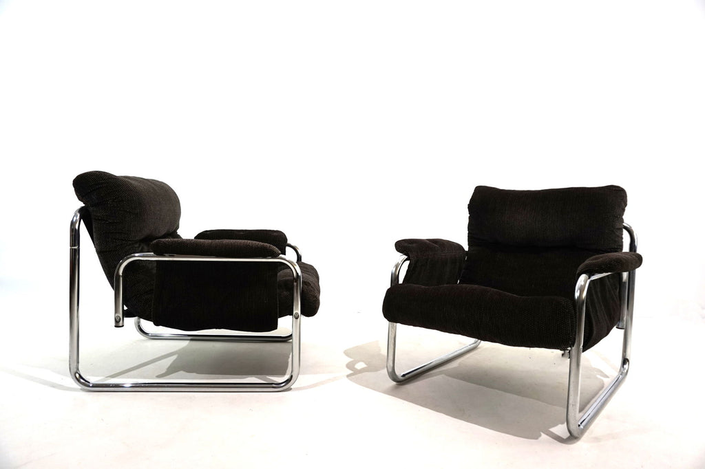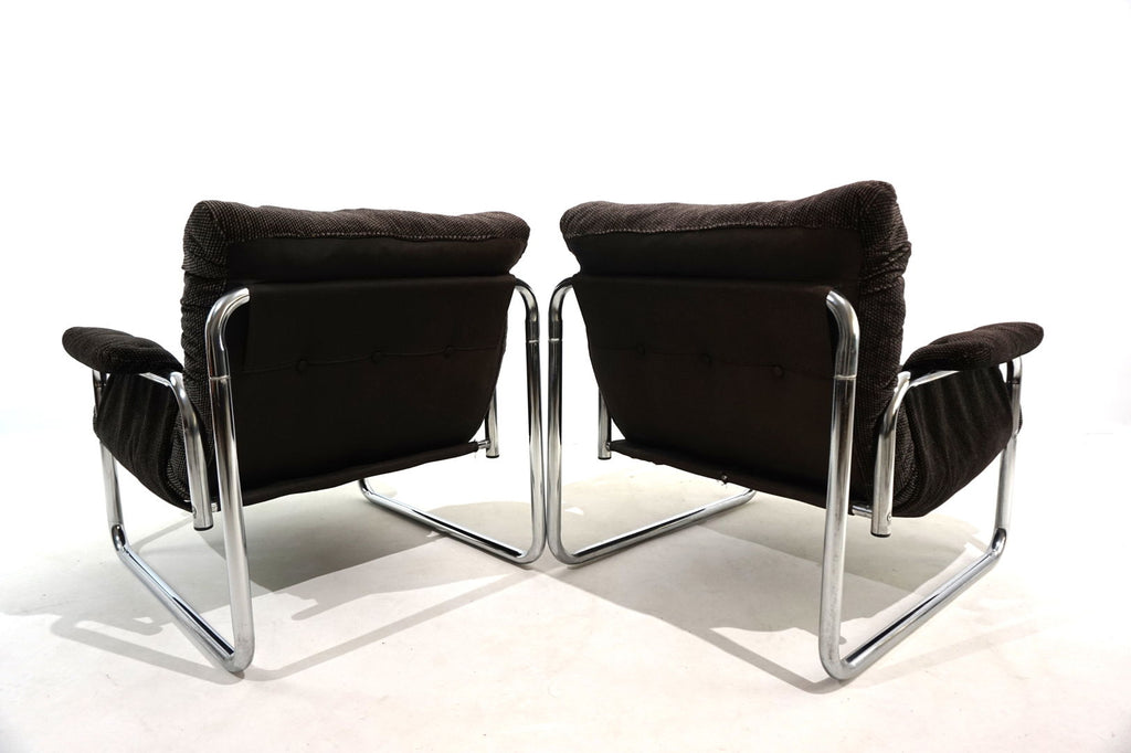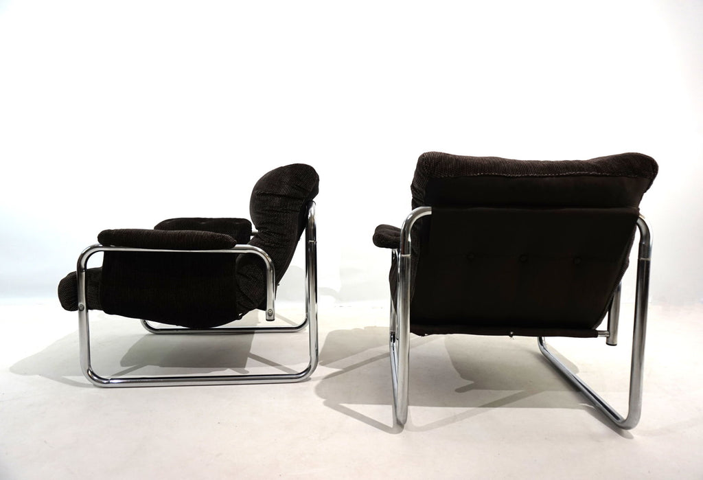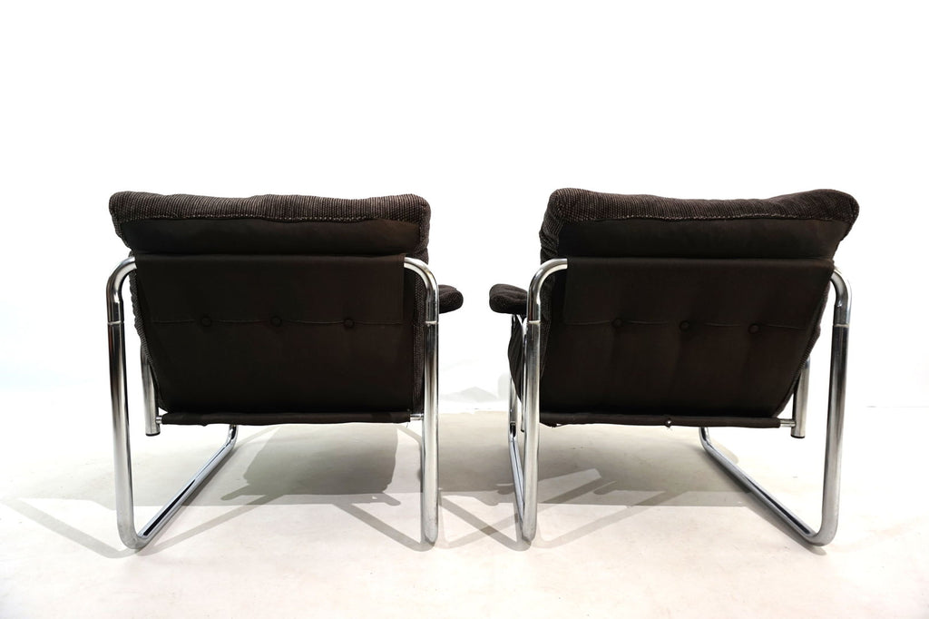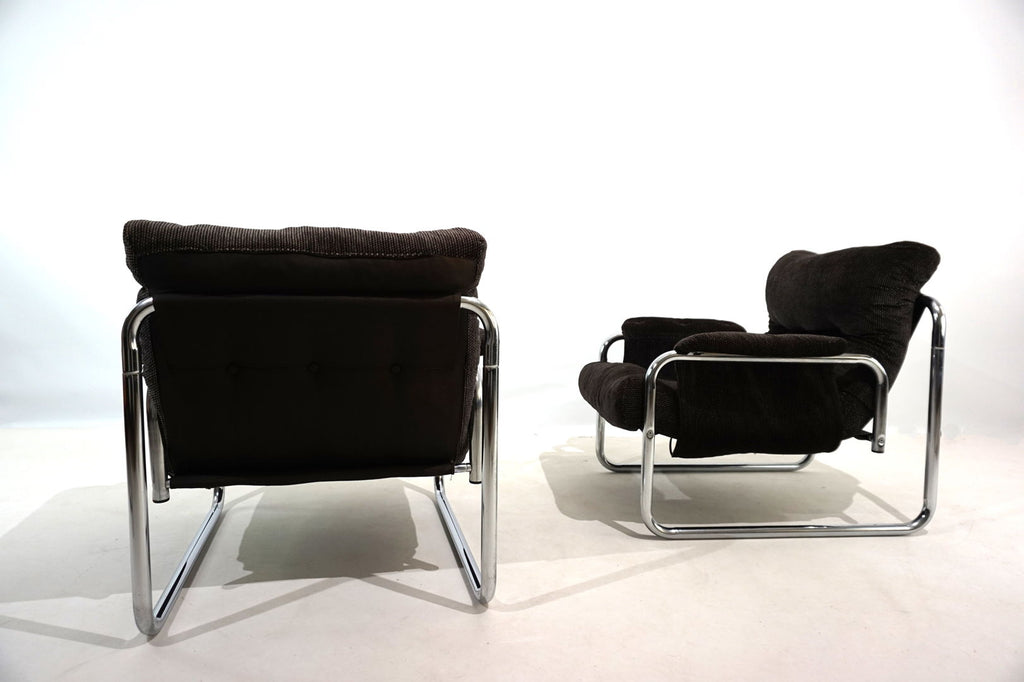 This pair of chrome cantilever chairs from Häggström comes in excellent condition. The frames made of solid chrome tubes are in very good condition with minimal signs of wear. The brown/beige mottled velor fabric shows almost no wear and tear, and the thick cushions offer good seating comfort. The upholstery has a brown canvas covering which has a small area of damage in the back of an armchair. The Swedish designer Johan Bertil Häggstöm designed these armchairs in the 70s. The German furniture manufacturer Herlag made them, among others. After working for several manufacturers, Häggstöm set up his own studio. Classic design from the late 60s/early 70s.