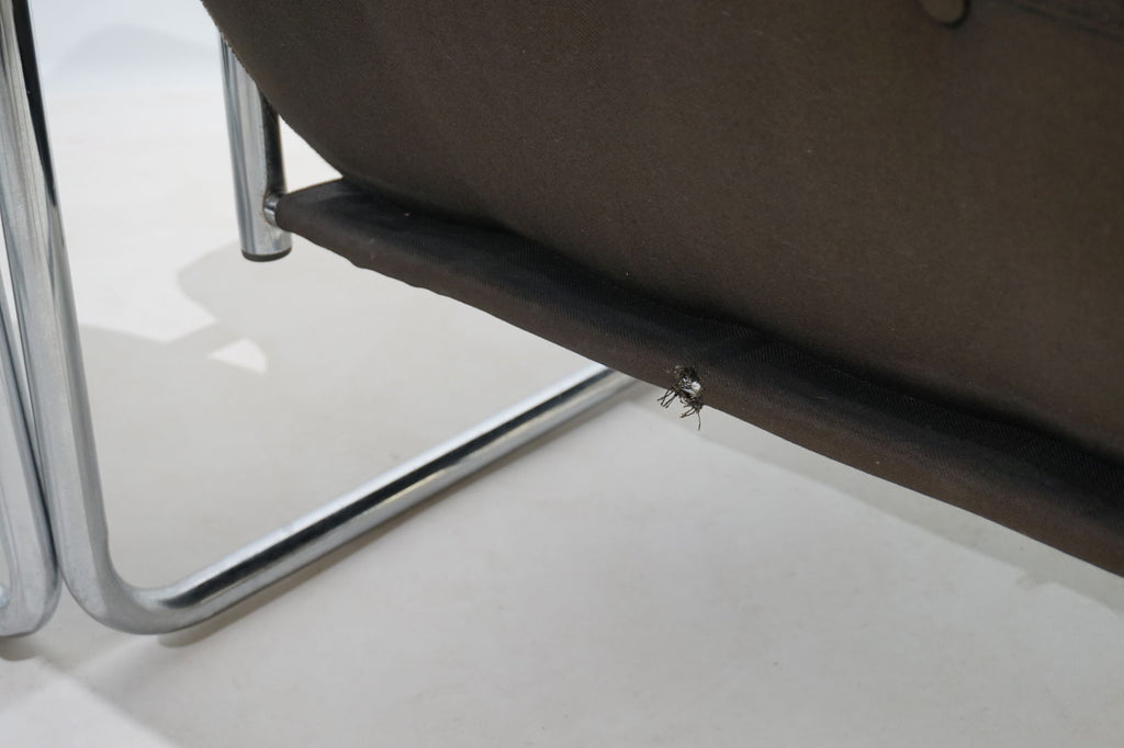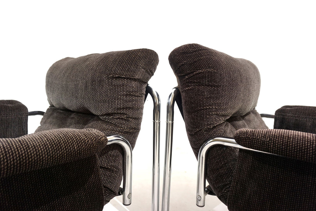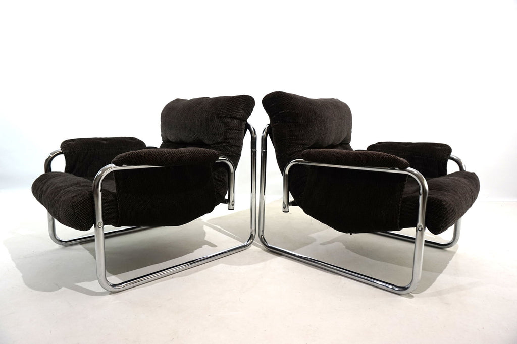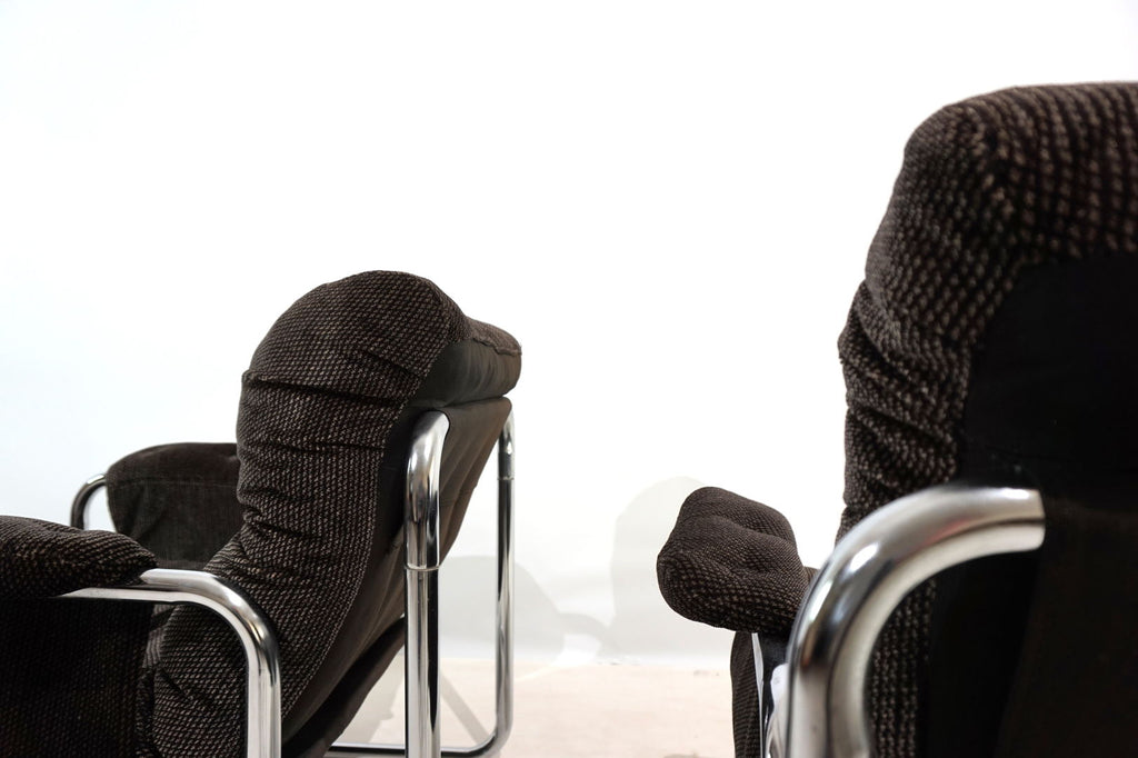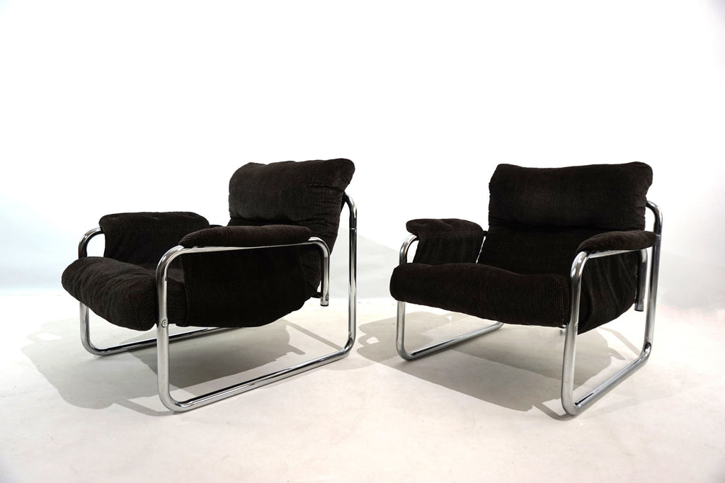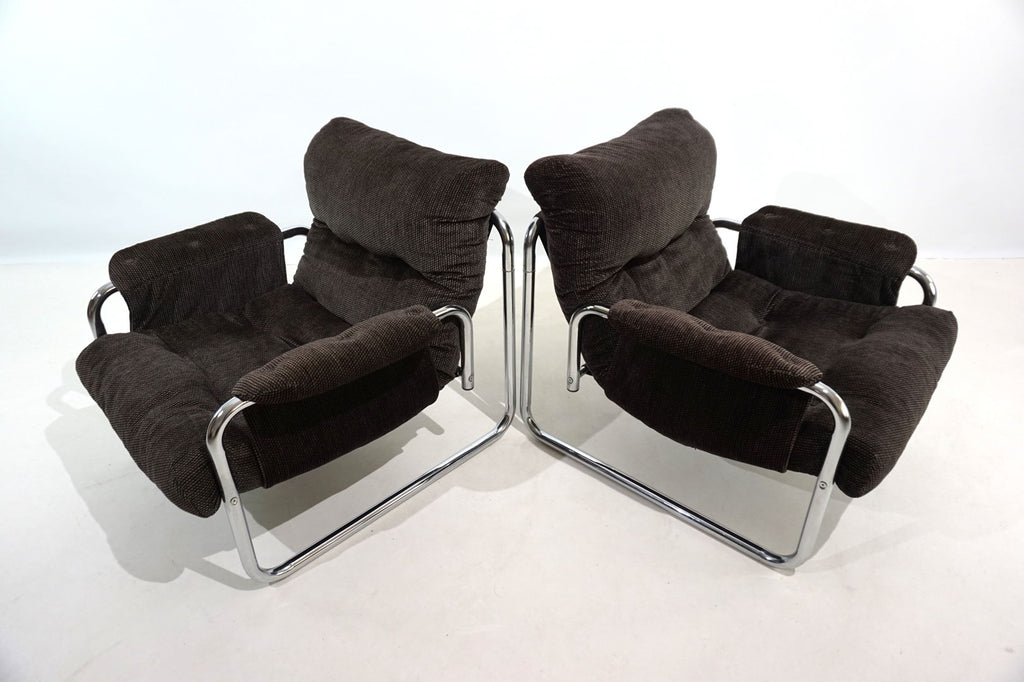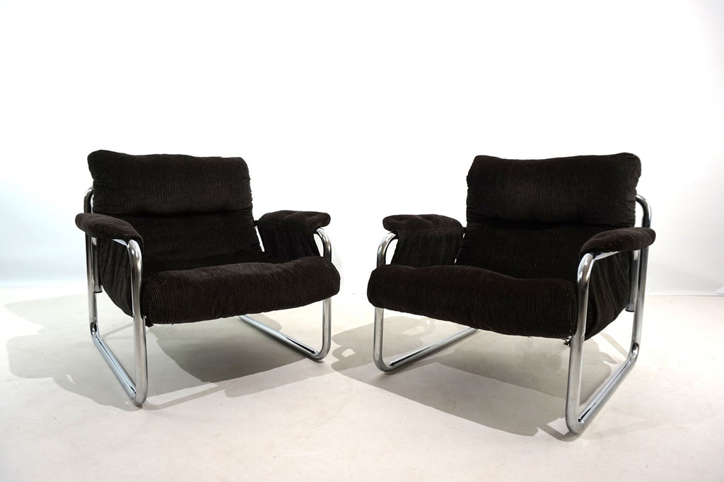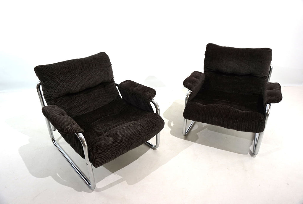 This pair of chrome cantilever chairs from Häggström comes in excellent condition. The frames made of solid chrome tubes are in very good condition with minimal signs of wear. The brown/beige mottled velor fabric shows almost no wear and tear, and the thick cushions offer good seating comfort. The upholstery has a brown canvas covering which has a small area of damage in the back of an armchair. The Swedish designer Johan Bertil Häggstöm designed these armchairs in the 70s. The German furniture manufacturer Herlag made them, among others. After working for several manufacturers, Häggstöm set up his own studio. Classic design from the late 60s/early 70s.