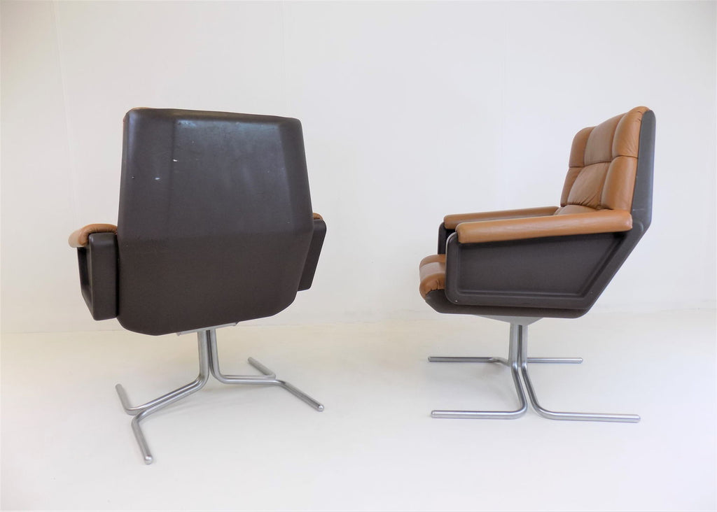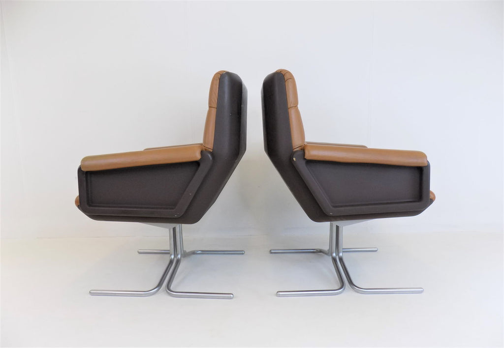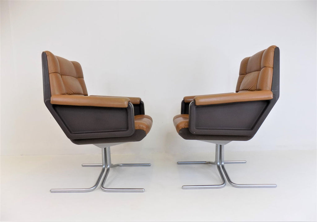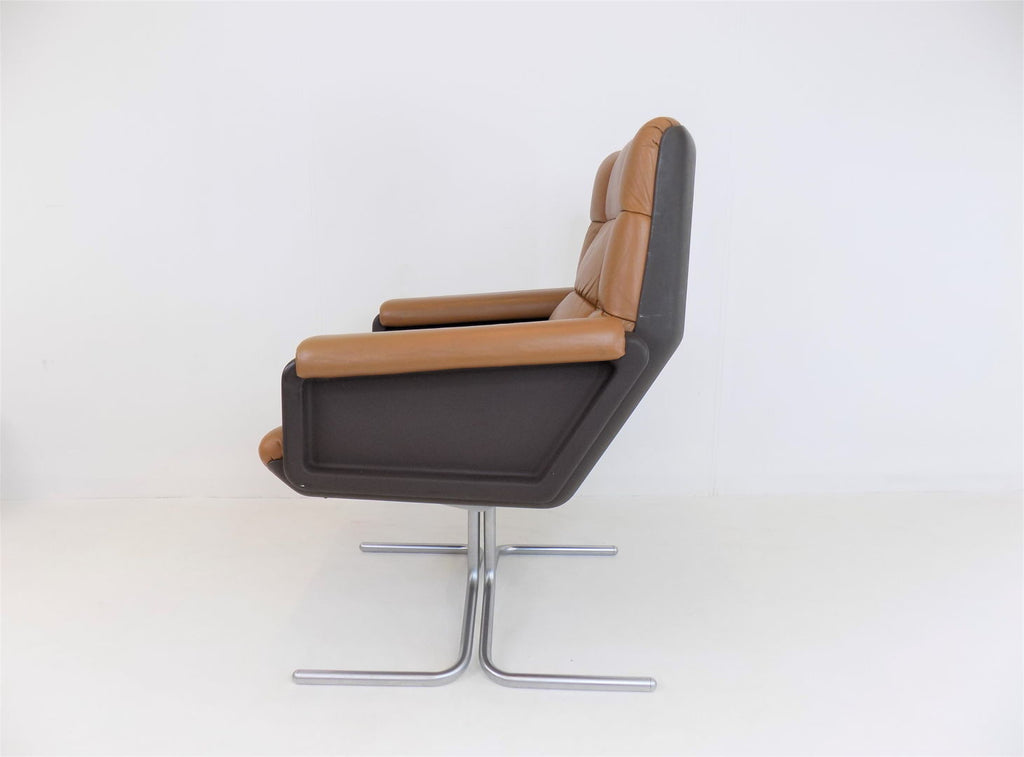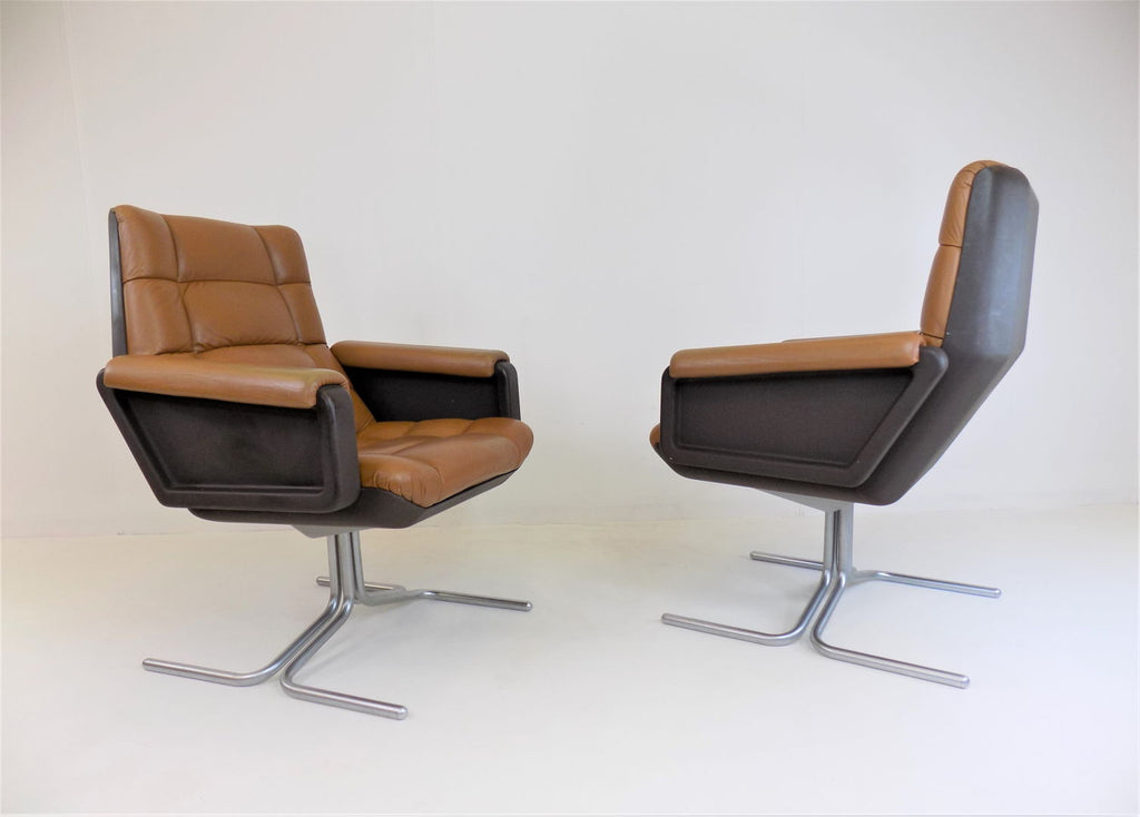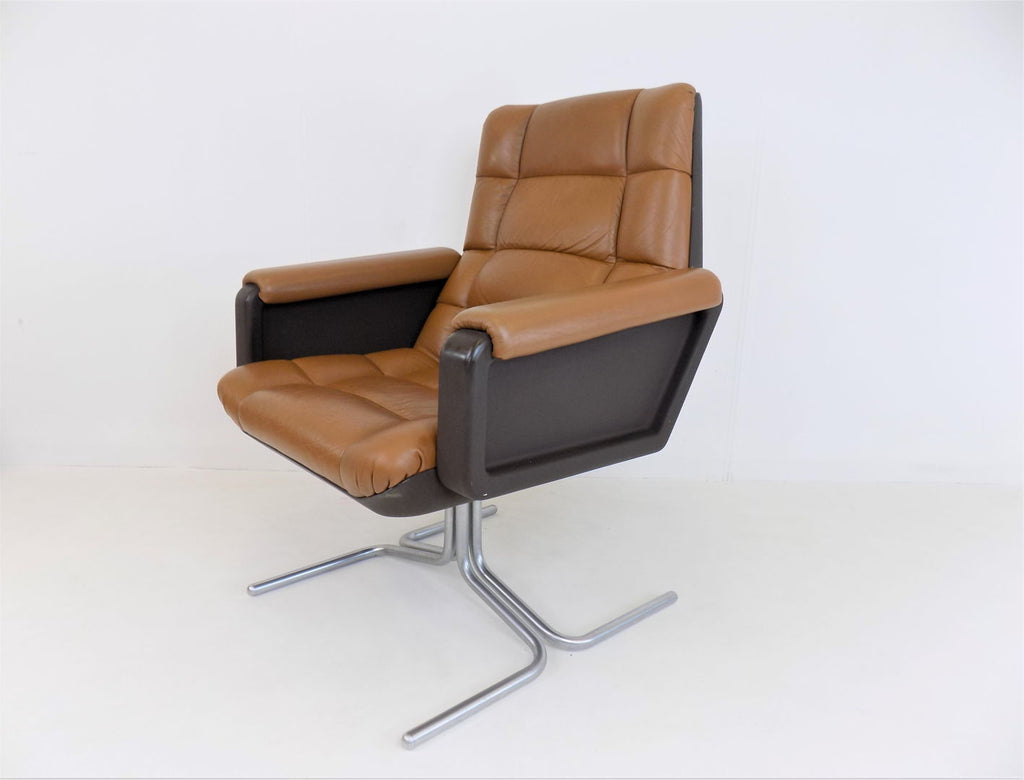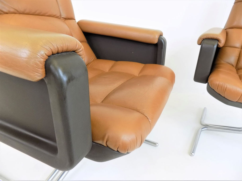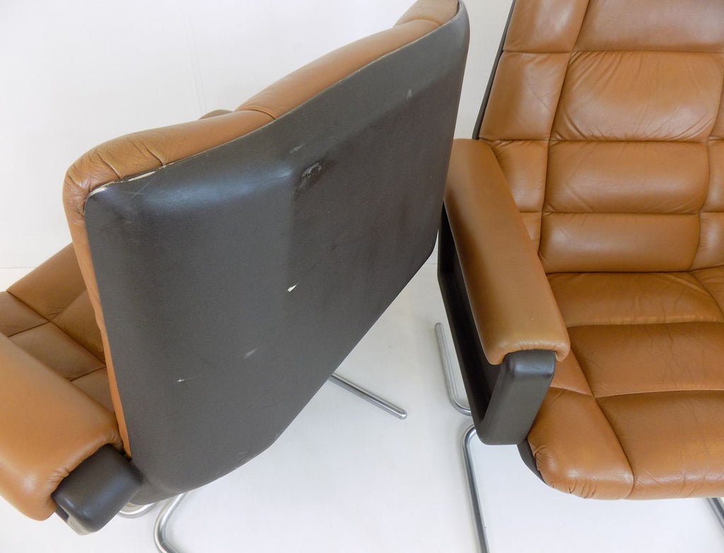 These two Seat 150 leather armchairs are fantastic representatives of the Space Age. The soft, cognac-colored and quilted leather is in very good condition. The brown plastic shells of the backrests show slight signs of wear. The metal base typical of Hirche is in perfect condition on both armchairs. These absolute classics of the 70s Space Age also offer excellent seating comfort.