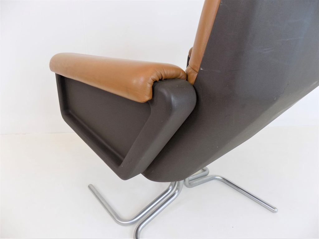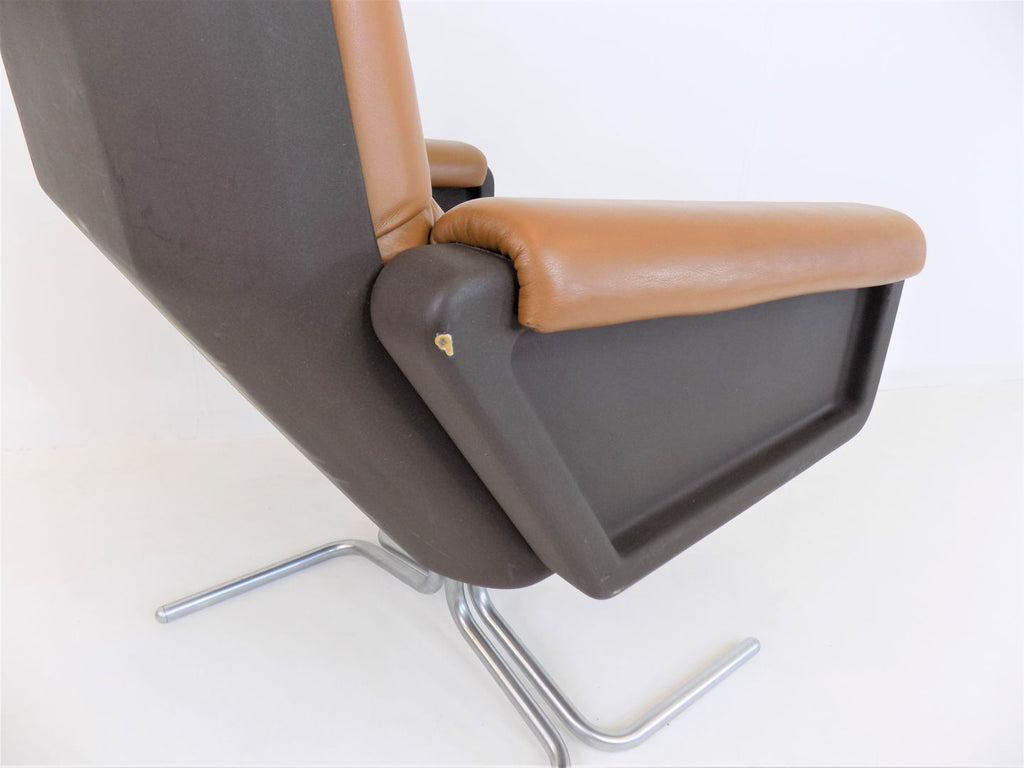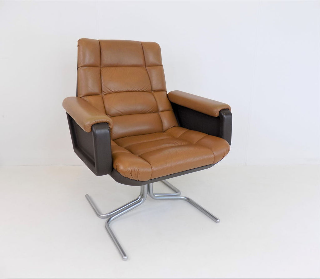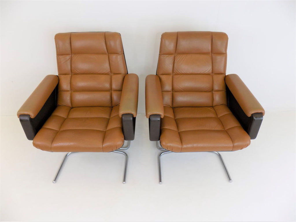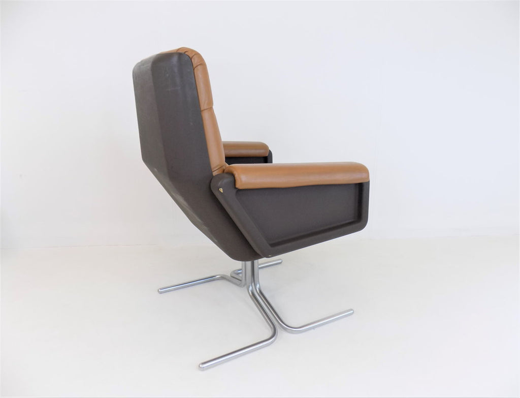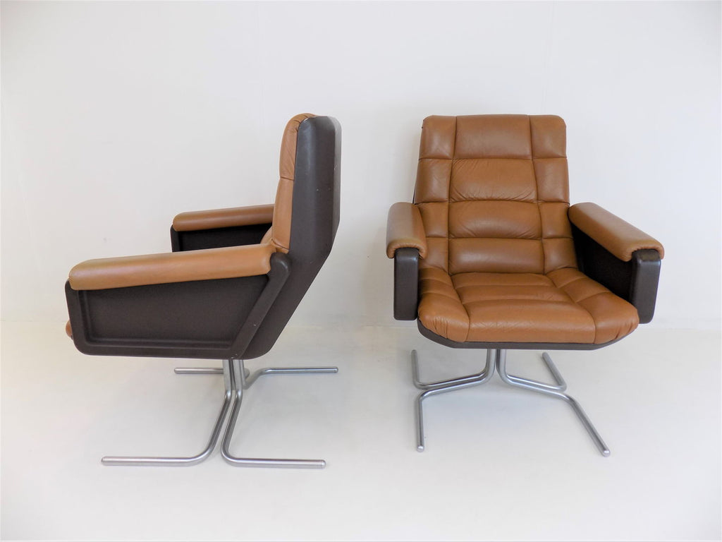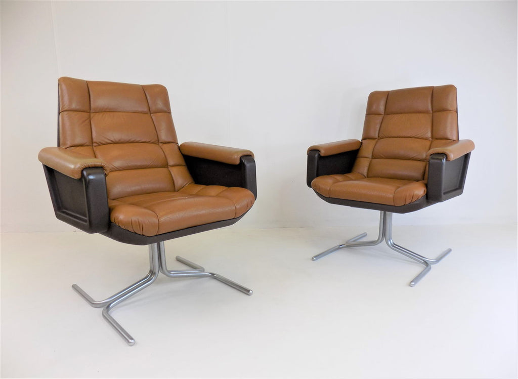 These two Seat 150 leather armchairs are fantastic representatives of the Space Age. The soft, cognac-colored and quilted leather is in very good condition. The brown plastic shells of the backrests show slight signs of wear. The metal base typical of Hirche is in perfect condition on both armchairs. These absolute classics of the 70s Space Age also offer excellent seating comfort.