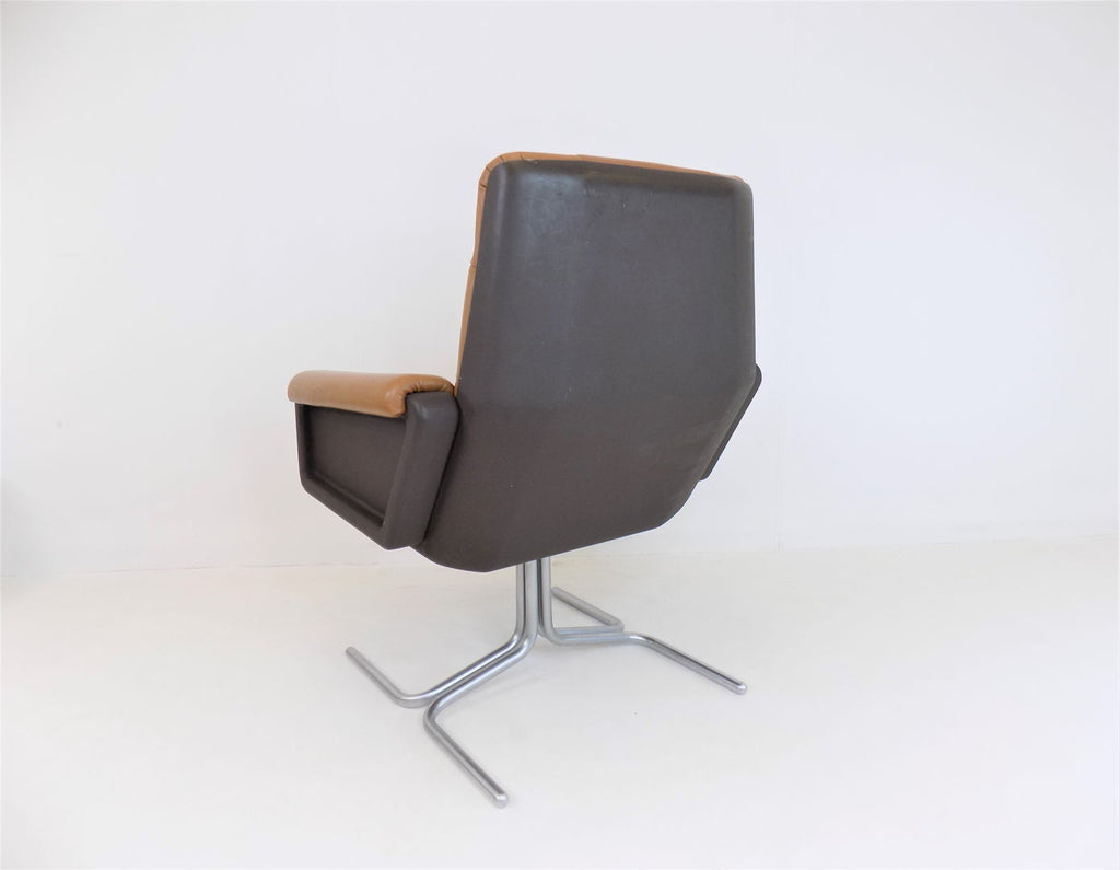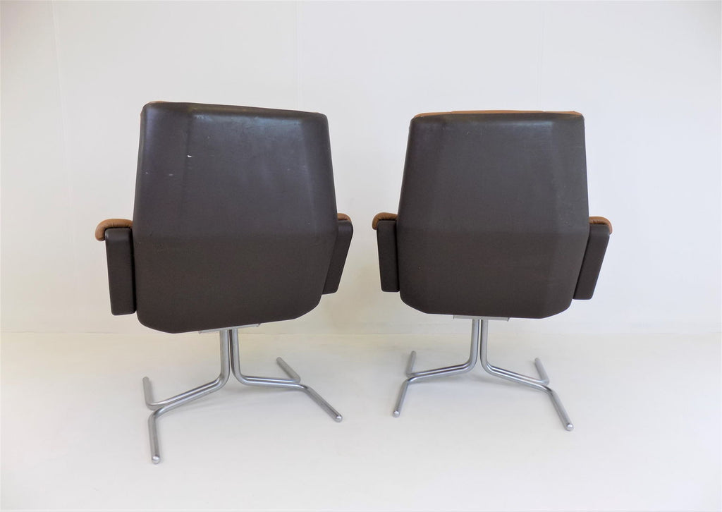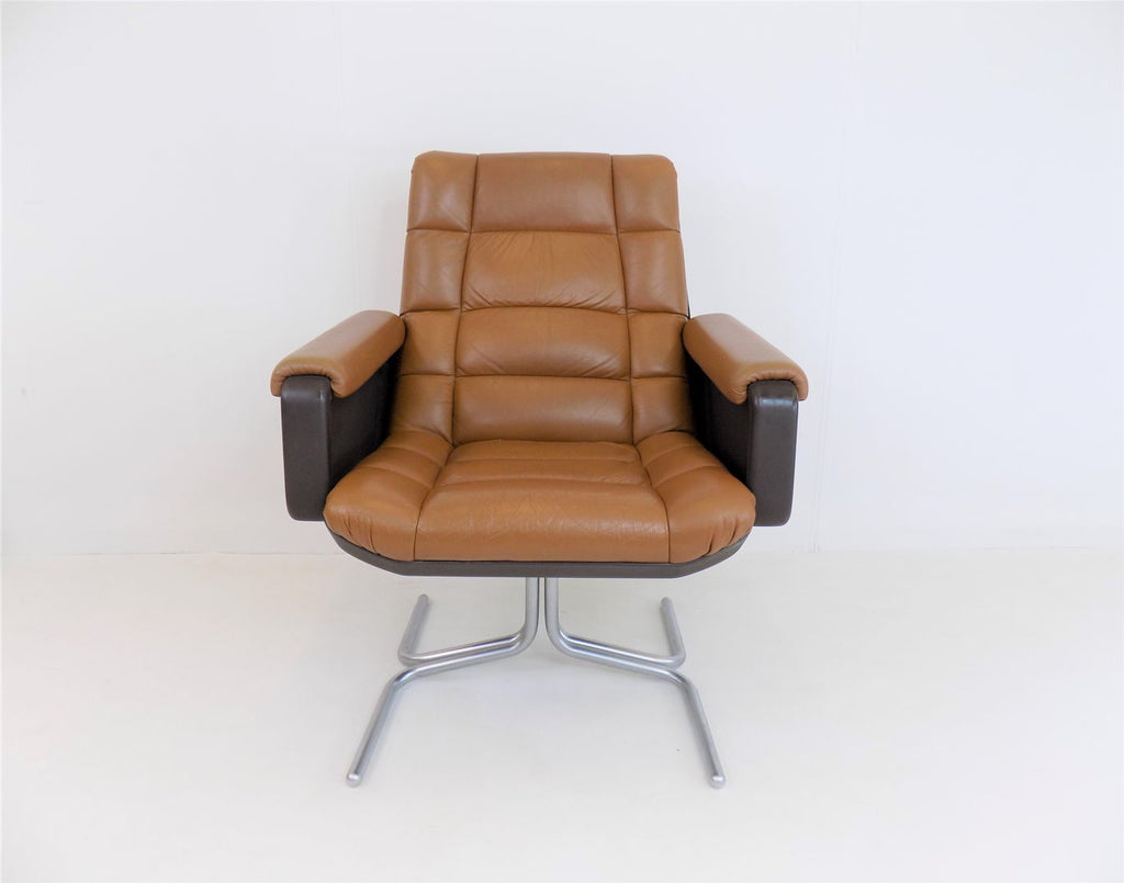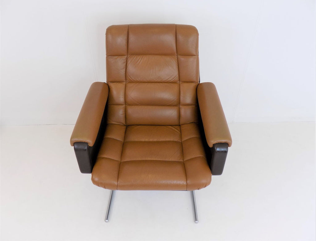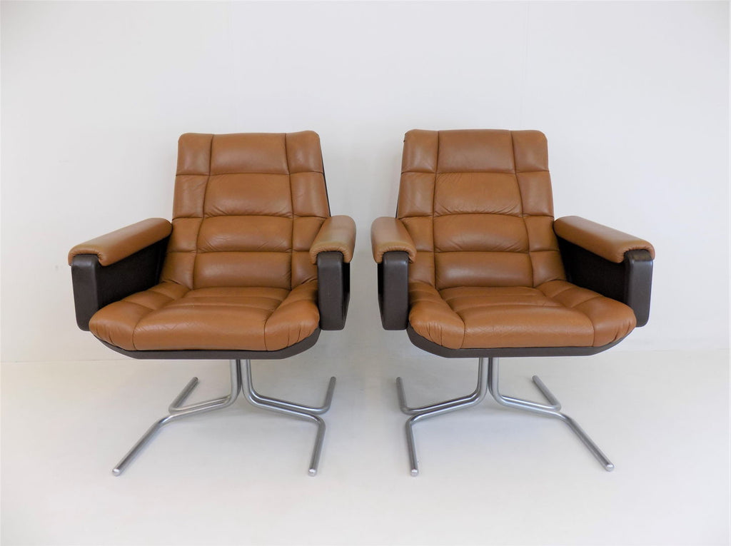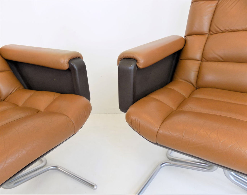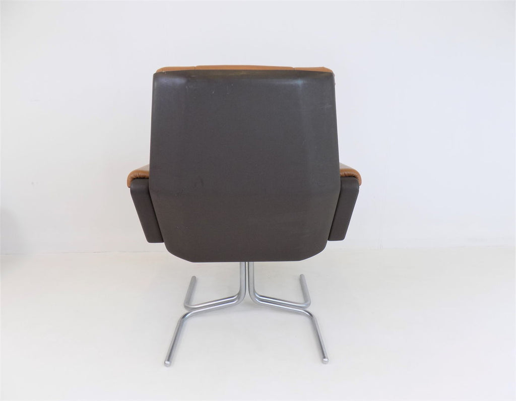 These two Seat 150 leather armchairs are fantastic representatives of the Space Age. The soft, cognac-colored and quilted leather is in very good condition. The brown plastic shells of the backrests show slight signs of wear. The metal base typical of Hirche is in perfect condition on both armchairs. These absolute classics of the 70s Space Age also offer excellent seating comfort.