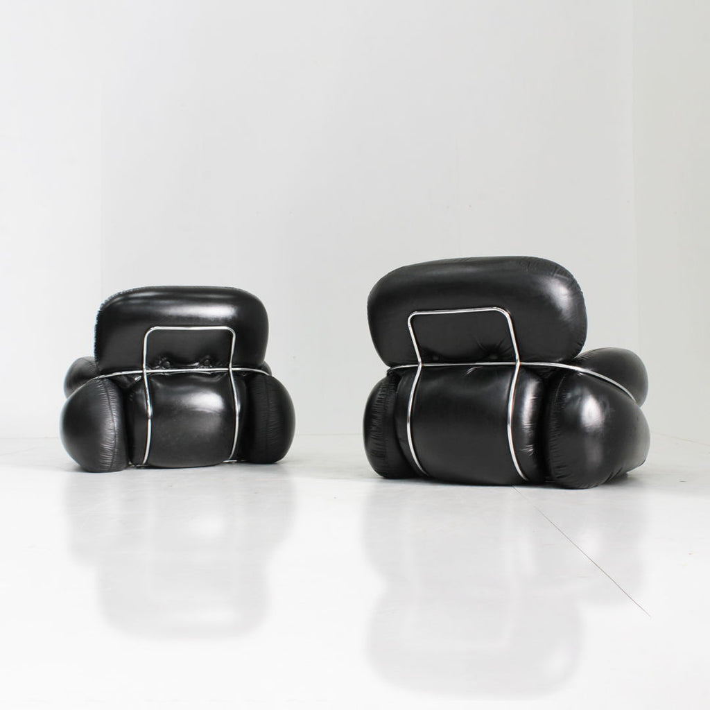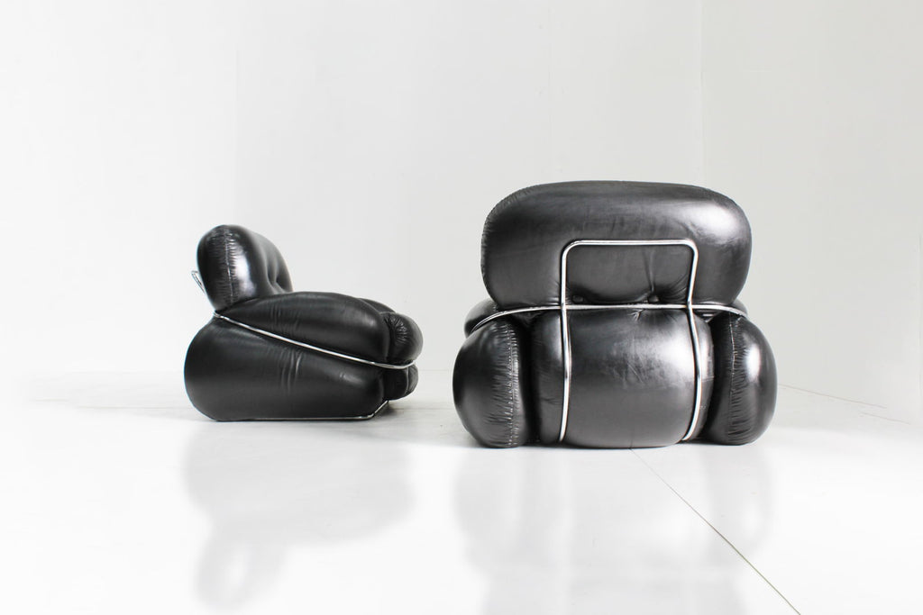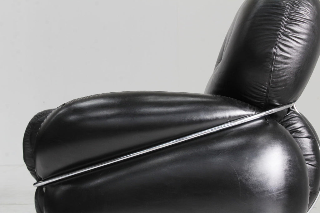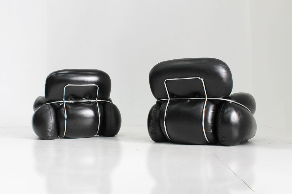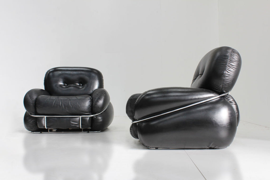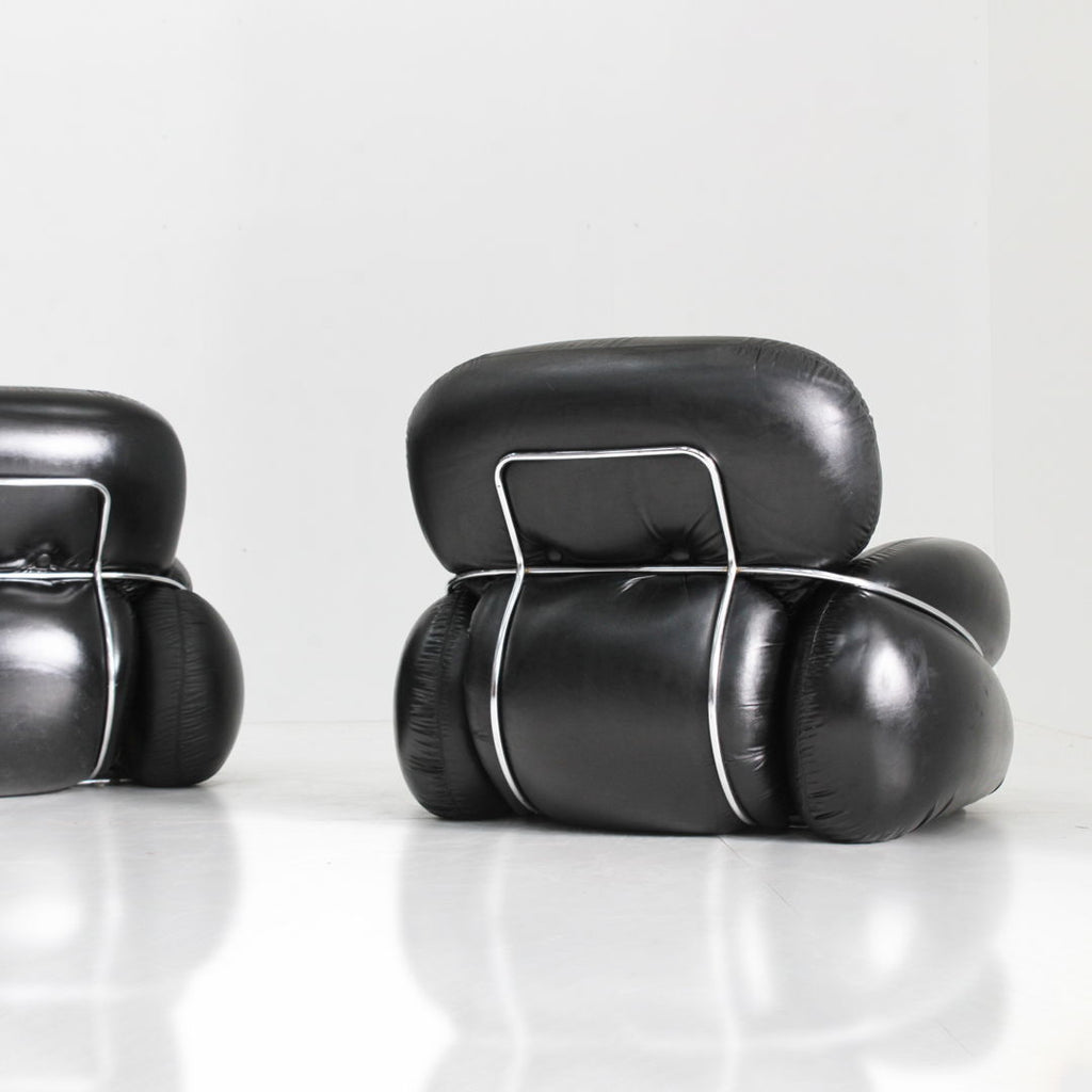 Set of 2 Italian Okay armchairs designed by Adriano Piazzesi in the 1970s. Italiand design in black leather with chrome structure. These beautiful chairs are in a good condition with some minor signs of wear.