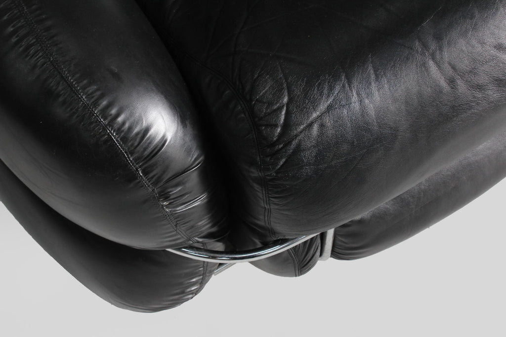 Adriano Piazzesi의 1970년대 Ok 안락의자 2개 세트 1970년대 Adriano Piazzesi가 디자인한 이탈리아의 Ok 안락의자 2개 세트. 블랙 가죽과 크롬 구조의 이탈리안 디자인. 이 아름다운 의자는 약간의 사용 흔적이 있지만 상태가 좋습니다. 크기: 폭 105cm, 깊이 100cm, 높이 80cm 창작자: Adriano Piazzesi 디자인 기간:1970~1979 제조국: 이탈리아 식별 표시:이 작품은 위에서 언급한 디자이너/제작자의 작품입니다. 저작자 표시가 없습니다 스타일: Vintage, Mid-Century 상세 상태: 좋음 — 이 빈티지/앤티크 상품은 긁힘 및 기타 세월의 흔적과 같은 약간의 사용감이 있을 수 있습니다. 어울리는 3인용 소파도 가능합니다. 전체에 관심이 있으시면 문의해 주세요. 세트, 안락의자 2개 + 소파