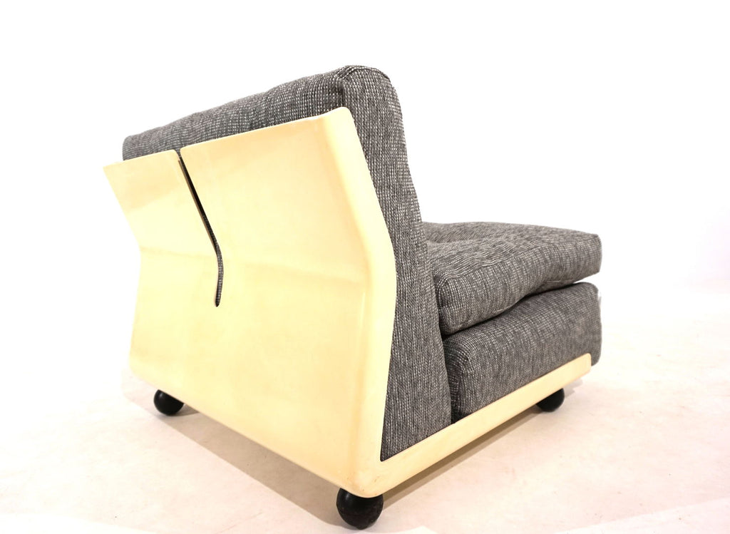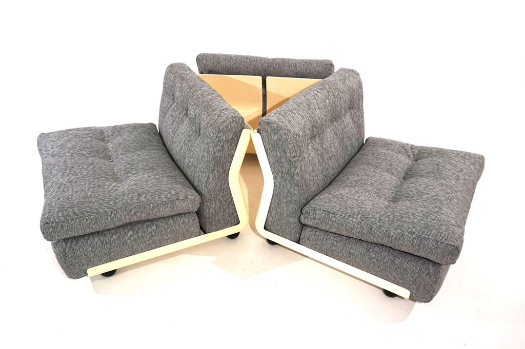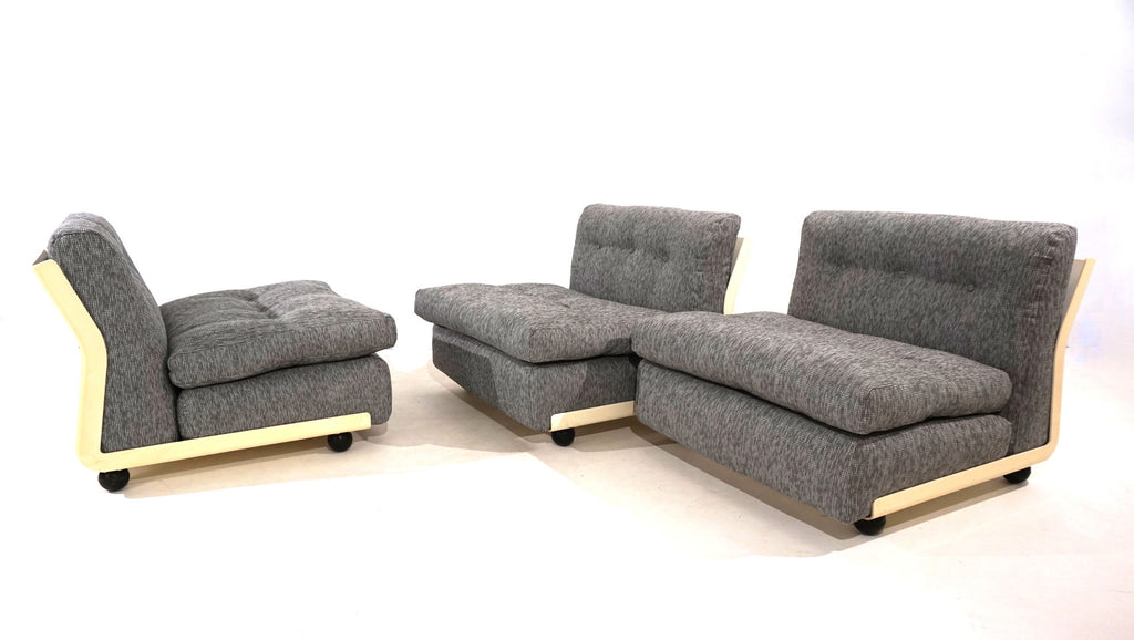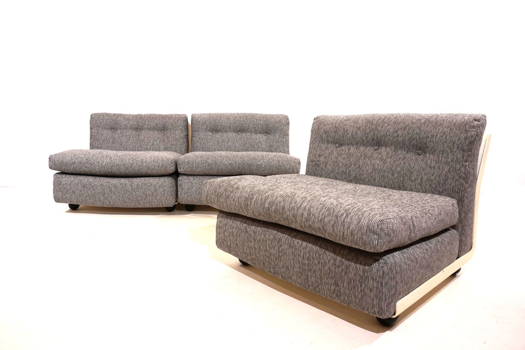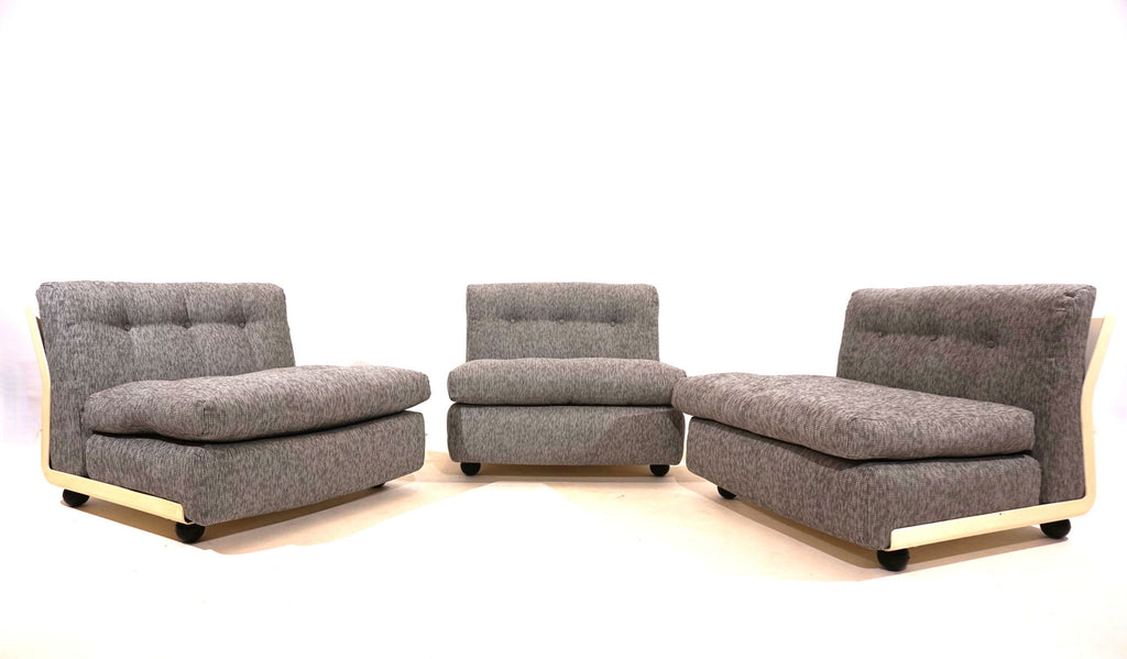 A set of three Amanta modular armchairs in a high-quality platinum/silver boucle fabric with light fiberglass shells. The armchairs have been newly upholstered and covered and offer first-class seating comfort. The back shells only show minimal signs of wear and slight, even discoloration. An Amanta set in very good condition. The three elements can be set up individually as a 3-seater or 2-seater sofa or individually. The Italian manufacturer C&B Italia was founded by Cesare Cassina and Piero Busnelli and was fully taken over by Busnelli in 1973. At that time the company was renamed B&B Italia. The Amanta armchair was designed by Mario Bellini for C&B Italia in 1963 and is one of his most famous designs.