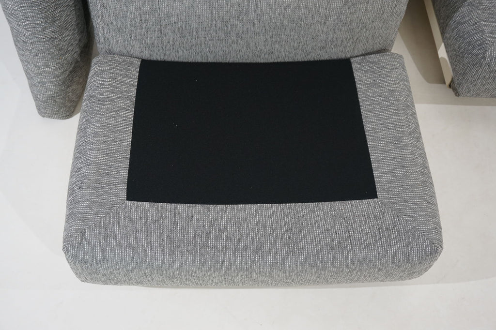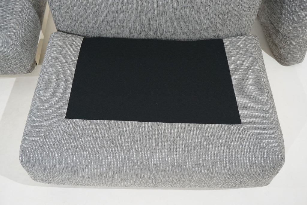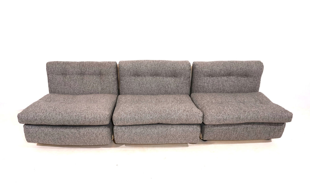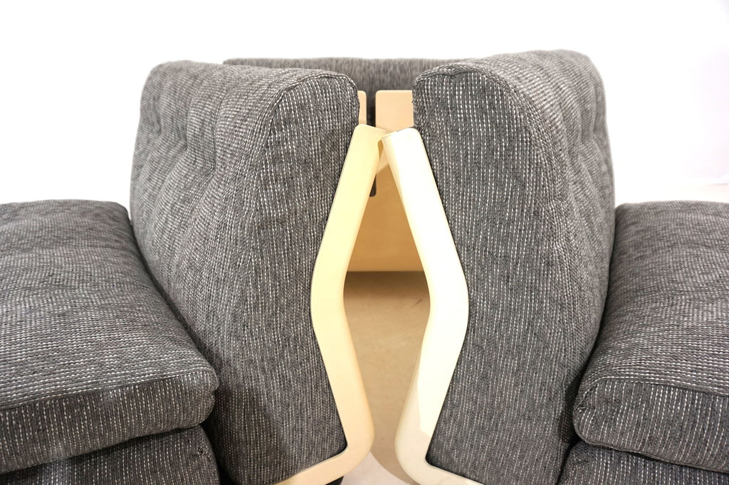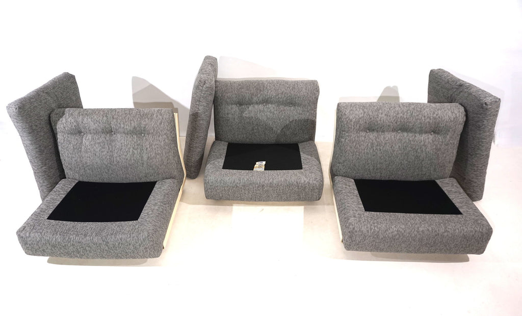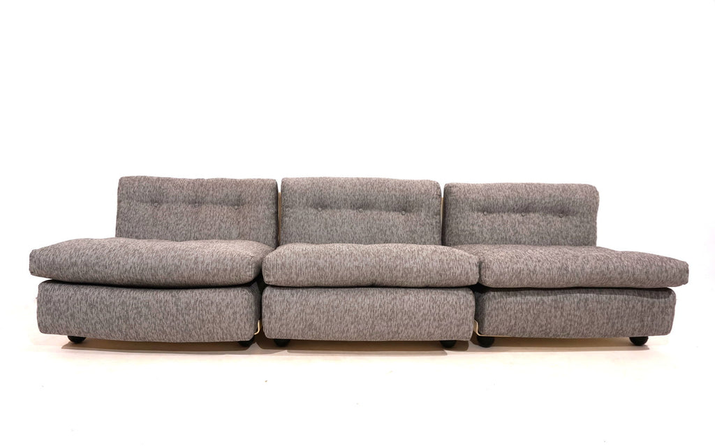 A set of three Amanta modular armchairs in a high-quality platinum/silver boucle fabric with light fiberglass shells. The armchairs have been newly upholstered and covered and offer first-class seating comfort. The back shells only show minimal signs of wear and slight, even discoloration. An Amanta set in very good condition. The three elements can be set up individually as a 3-seater or 2-seater sofa or individually. The Italian manufacturer C&B Italia was founded by Cesare Cassina and Piero Busnelli and was fully taken over by Busnelli in 1973. At that time the company was renamed B&B Italia. The Amanta armchair was designed by Mario Bellini for C&B Italia in 1963 and is one of his most famous designs.