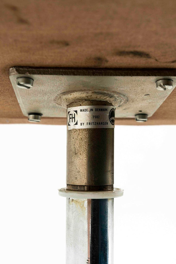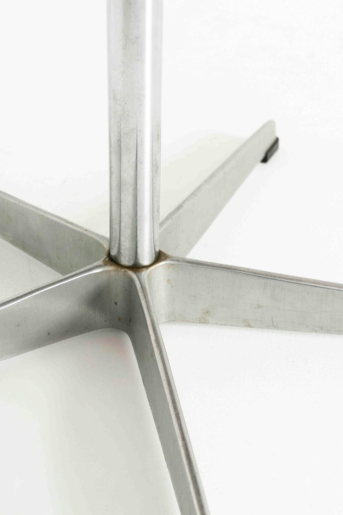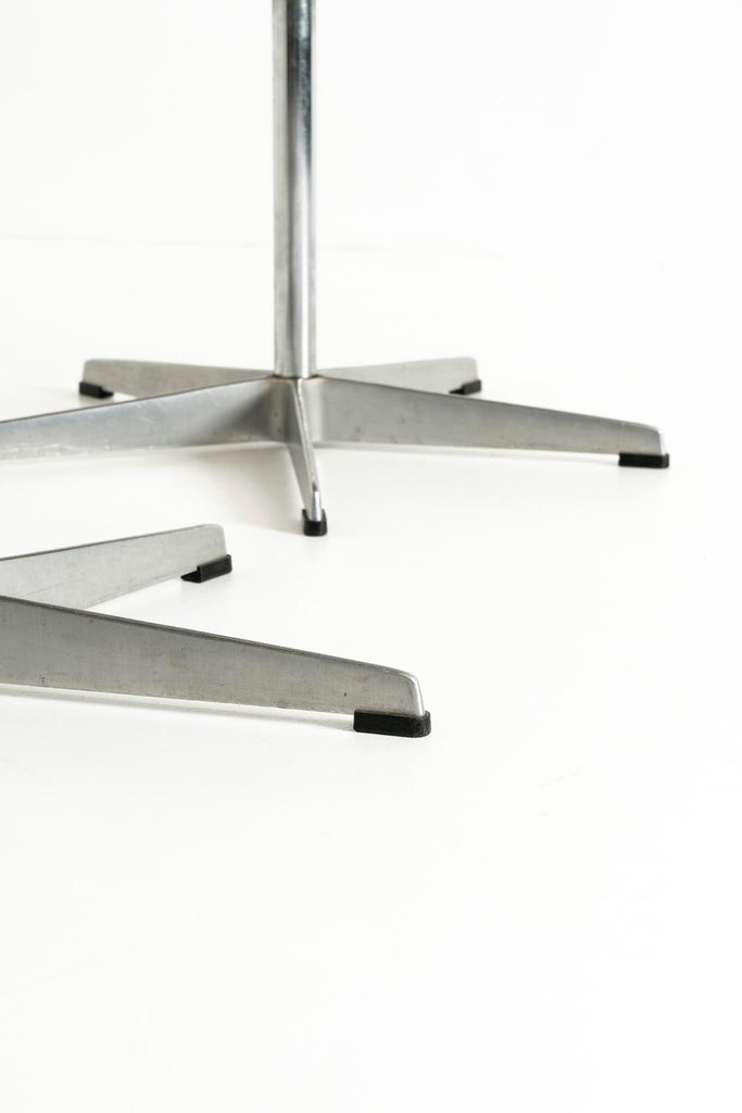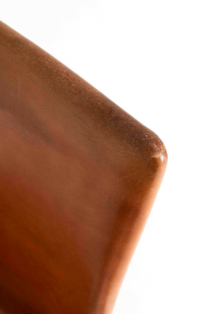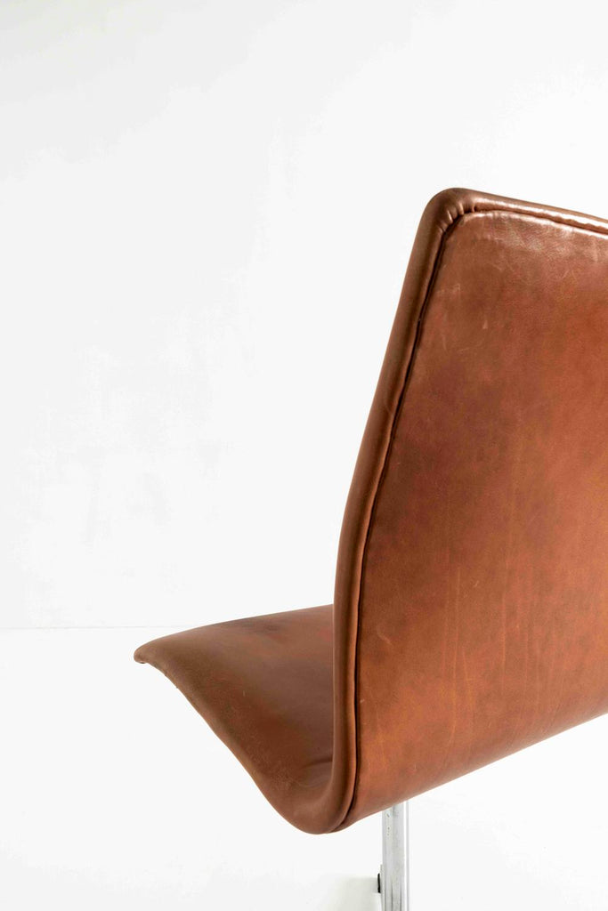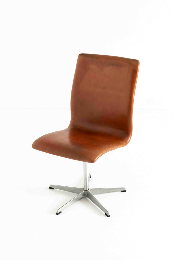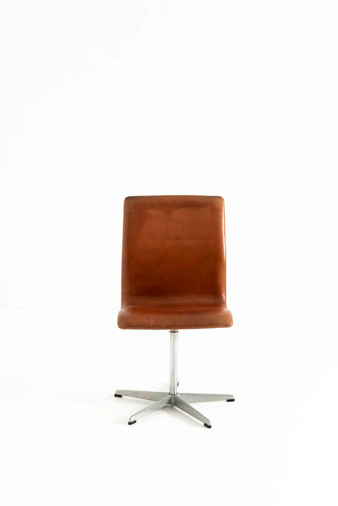 갈색 가죽 커버와 금속 프레임이 있는 5개의 'Oxford Chairs' 회전식 식탁 의자 세트. 모델 3171이 있는 이 의자는 1965년에 설계되었으며 나중에 Fritz Hansen에 의해 실행됩니다. 의자에는 멋진 녹청이 있고 명확하게 표시되어 있습니다. 사용감으로 약간의 사용감이 있지만 가죽 상태는 여전히 좋습니다. 멋진 식당 또는 사무실 설정. 언급된 가격은 총 5개의 의자 세트 가격입니다.