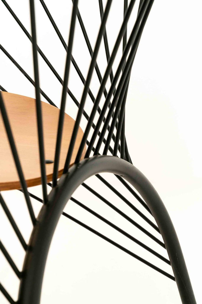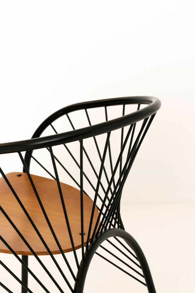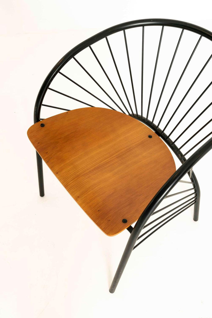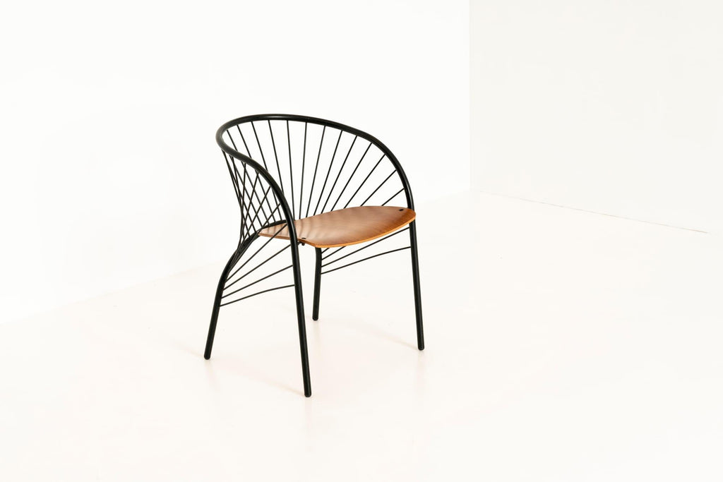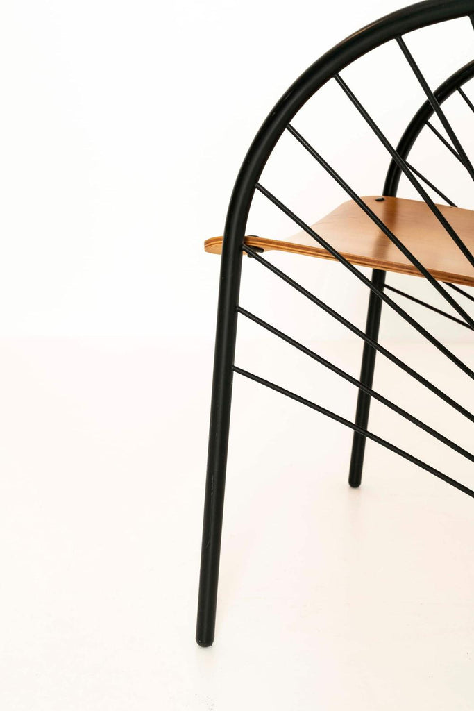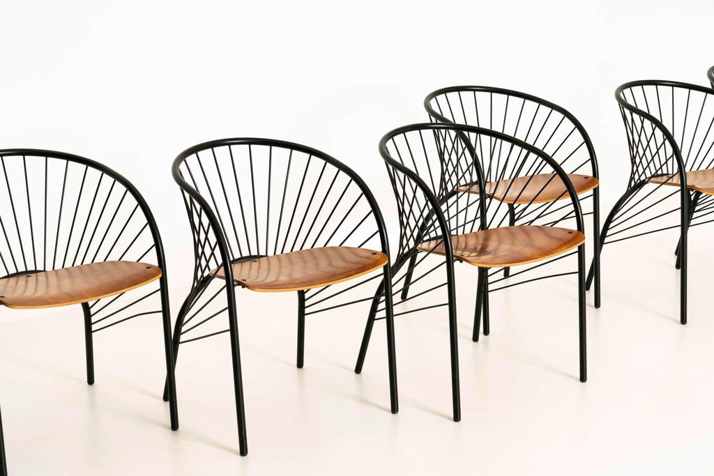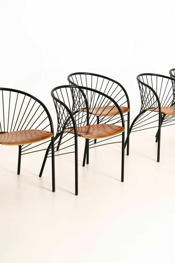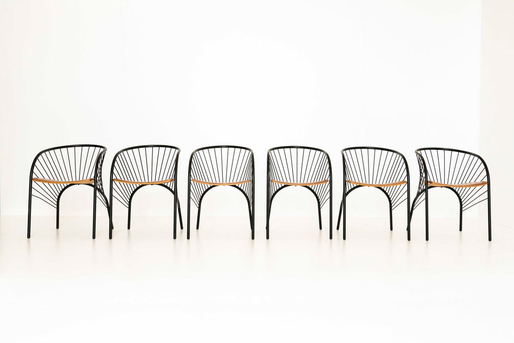 1984년 이탈리아 레지스 프로티에르(Regis Protiere)의 팔루코(Pallucco)용 '리지' 이탈리아 빈티지 다이닝 체어 6개로 구성된 매우 세련된 세트입니다. 이 의자는 검은색 래커 금속으로 만들어졌으며 나무로 된 좌석 공간이 있습니다. 그 '취약한' 디자인은 포스트모던 디자인의 좋은 예입니다.