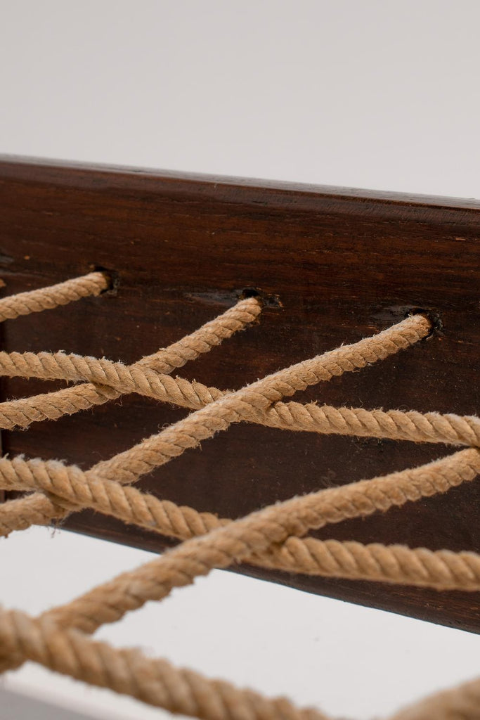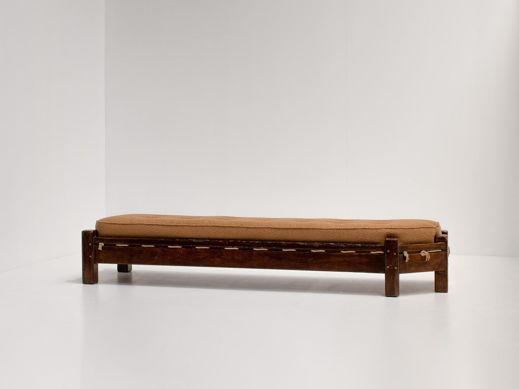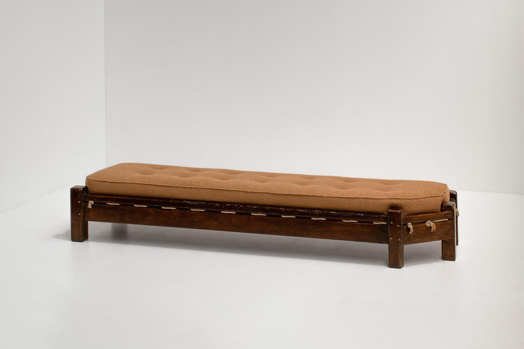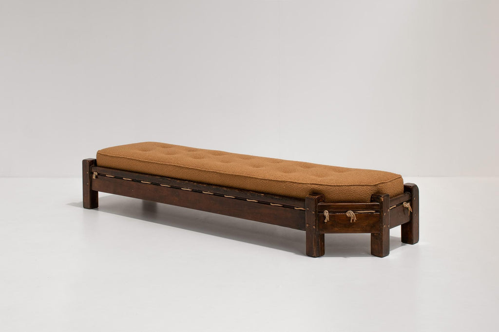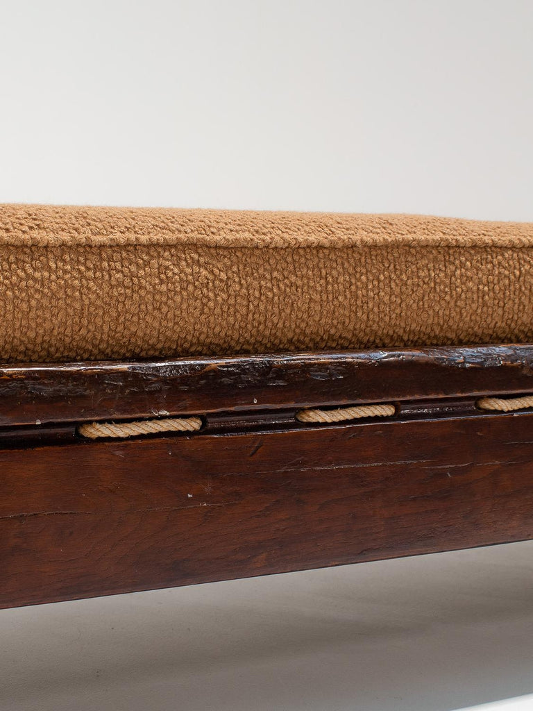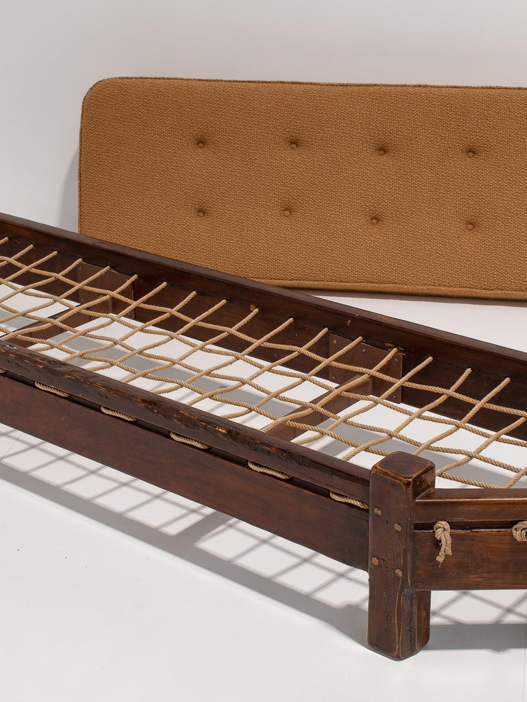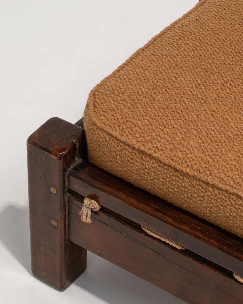 견고한 나무 프레임과 로프 구조의 정교한 데이베드로 Charlotte Perriand와 일부 브라질 미드 센츄리 디자인을 연상시키는 이 매력적인 베드는 원시적인 구조의 나무 프레임으로 되어 있습니다. 나무파트는 어두운 얼룩과 새틴 마감 처리되었고, 거친 로프와의 조합은 제품의 견고함을 강조하지만 동시에 데이베드에 매우 세련되고 우아한 느낌을 줍니다. 쿠션은 완전히 새로 만들어졌으며 머스타드 브라운 색상의 부클레(bouclé)로 업홀스터리 되었습니다.