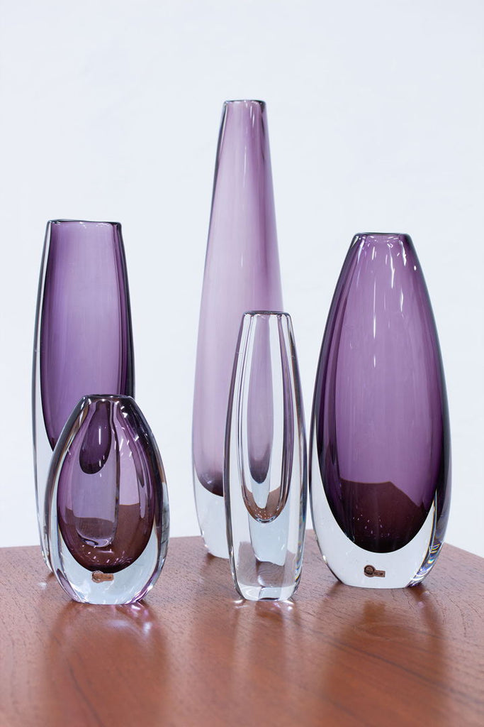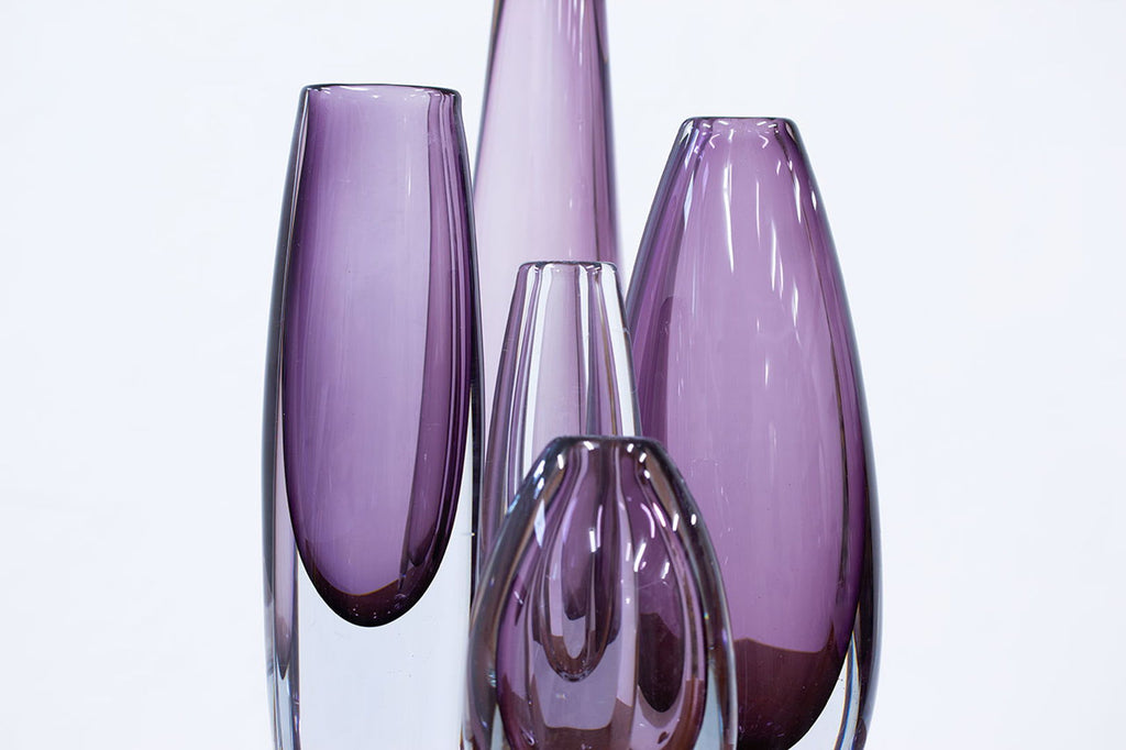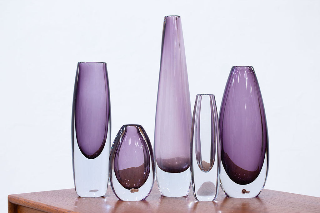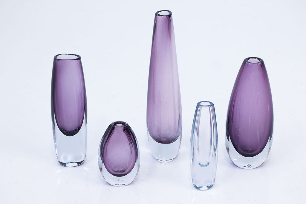 5개의 "솜메르소(sommerso)" 꽃병 그룹. Gunnar Nylund와 Asta Strömberg가 디자인했습니다. 1950년대 스웨덴의 Strömbergshyttan에서 제조되었습니다. 투명 기술로 포장된 컬러 유리. 모든 서명이 새겨져 있거나 라벨이 붙어 있습니다. 사용 흔적과 세월에 따른 녹청이 있는 매우 좋은 상태입니다. 높이 14~34×폭 6~11×깊이 4~8cm