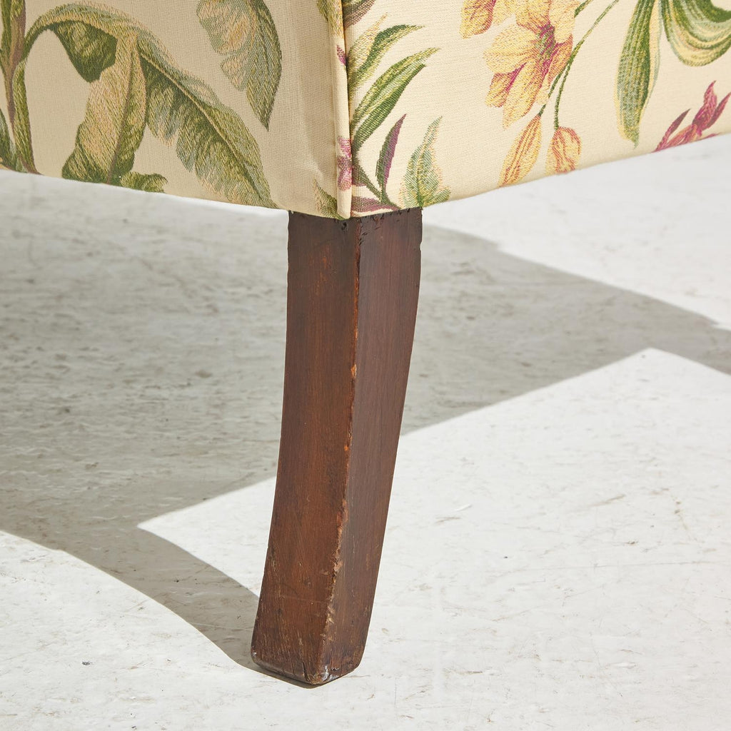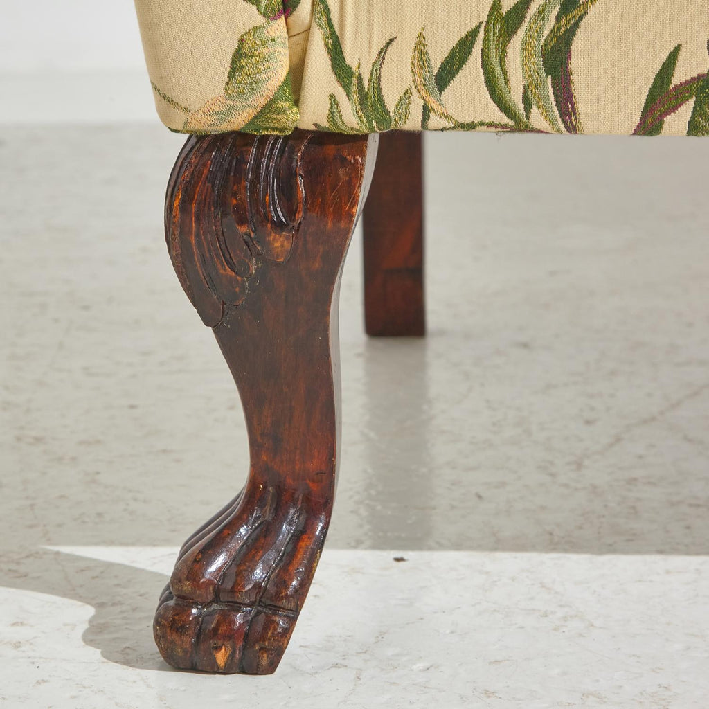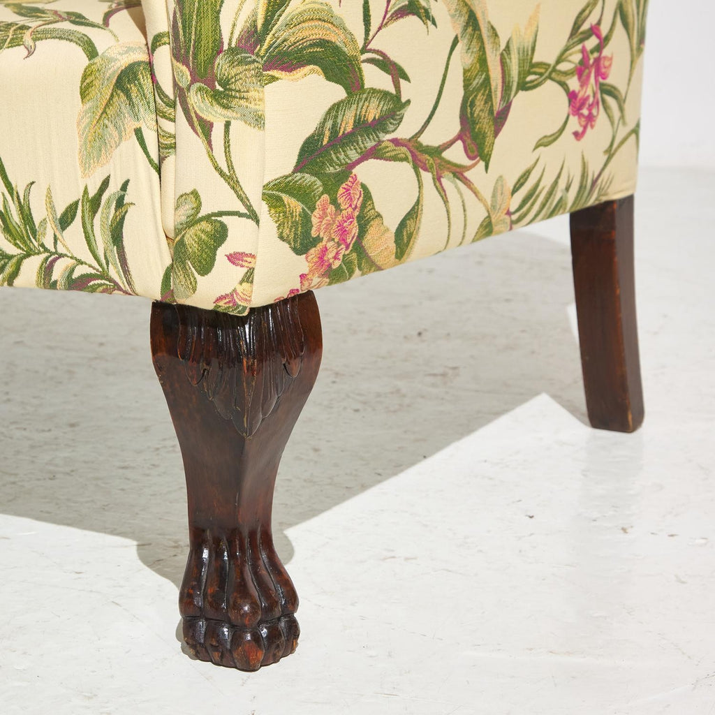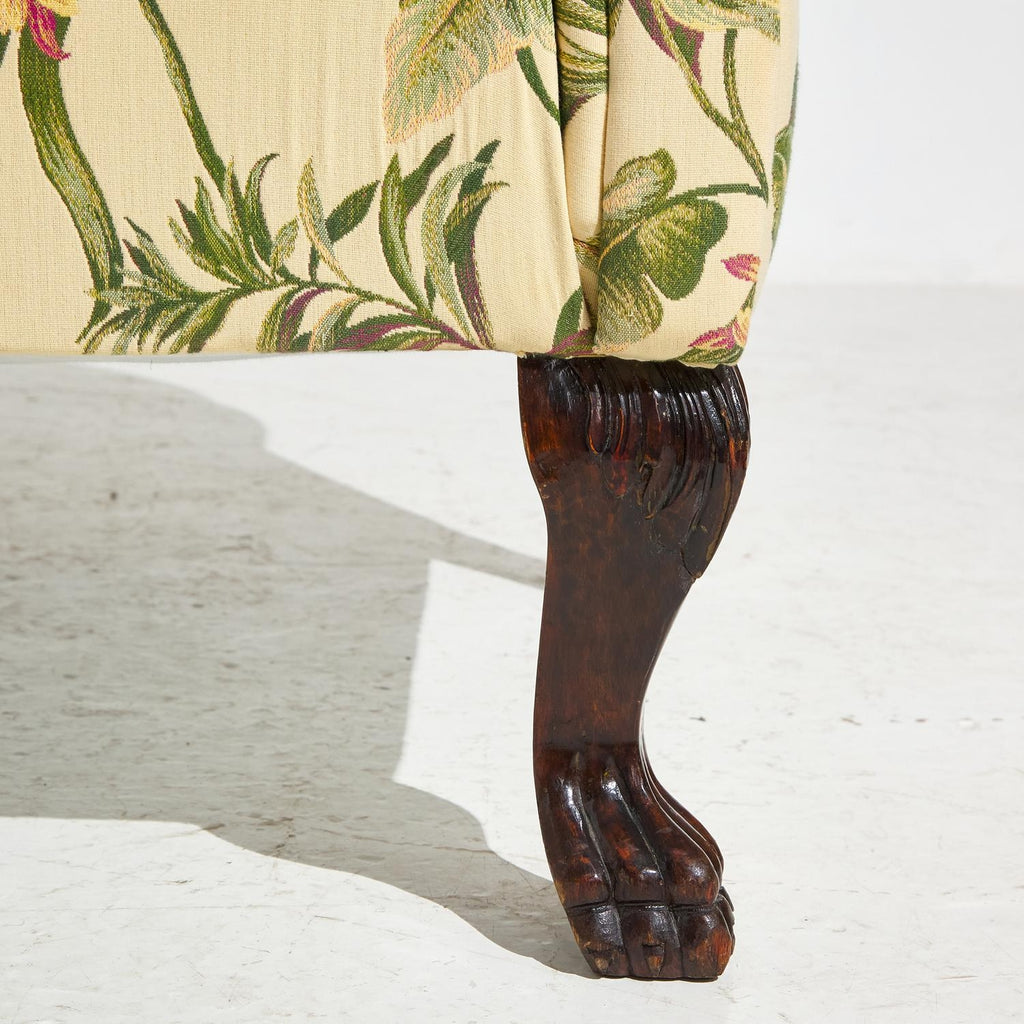 텍스타일 커버와 마호가니 다리가 있는 2인용 소파. 마호가니 다리에 약간의 긁힘과 마모가 있고 실내 장식품에 얼룩이 있습니다.
