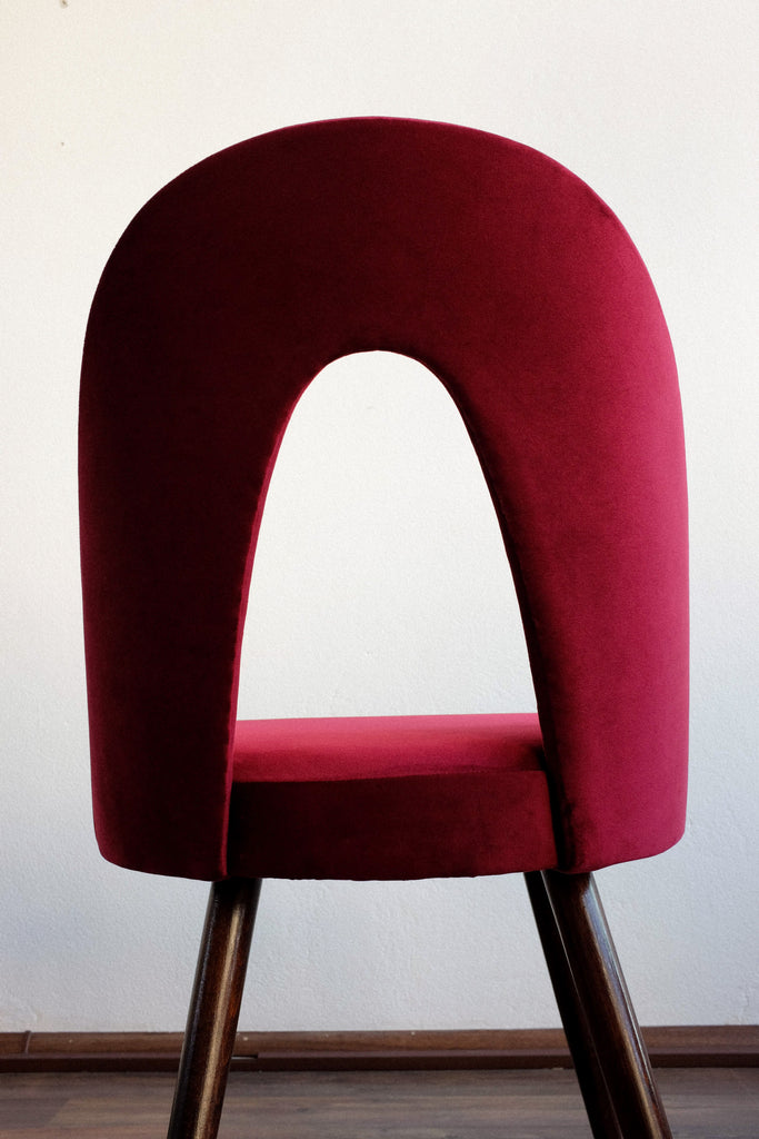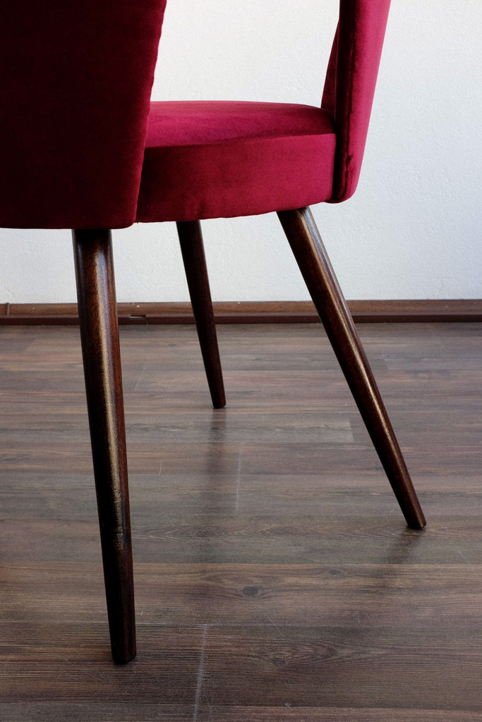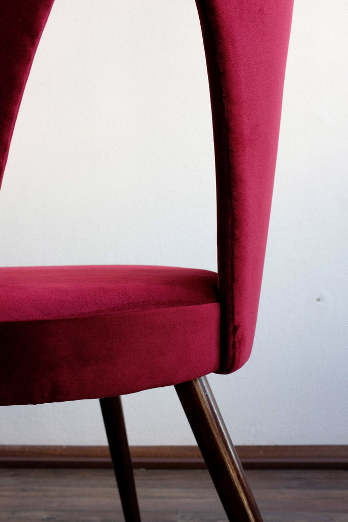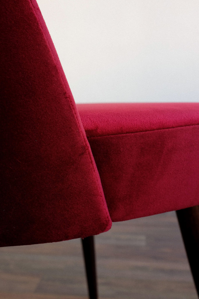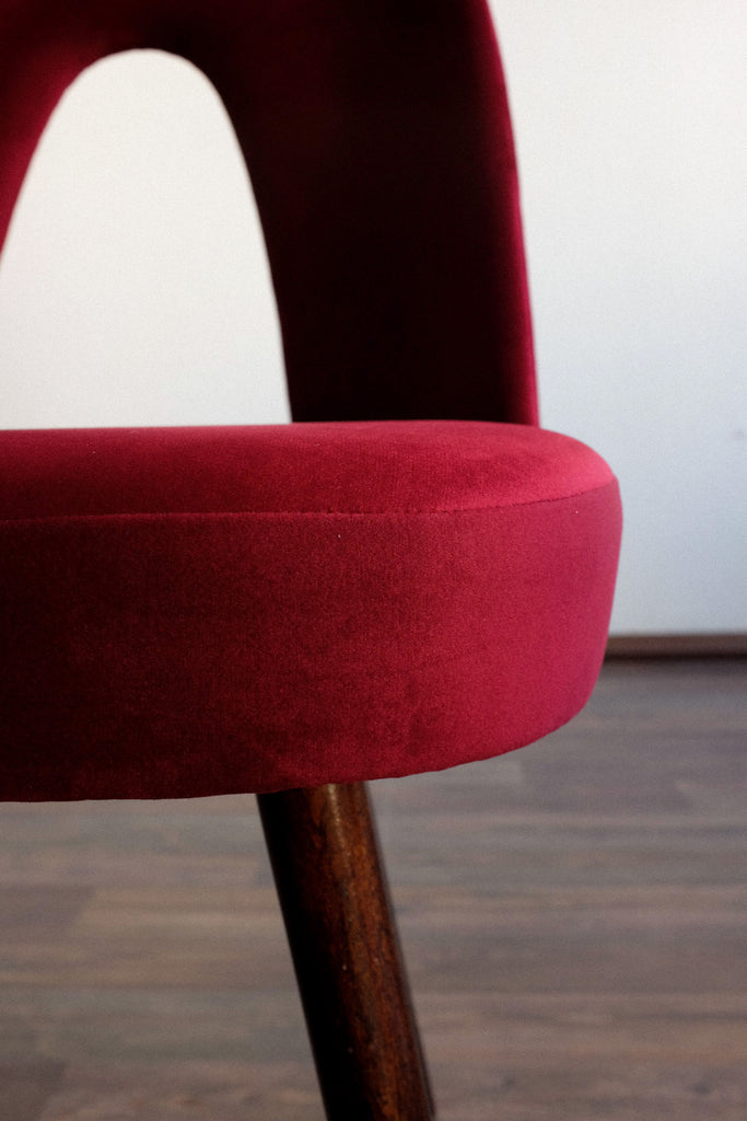 나무는 복원되었고 의자는 Rioma Spain에서 버건디 벨벳으로 다시 덮개를 씌웠습니다.