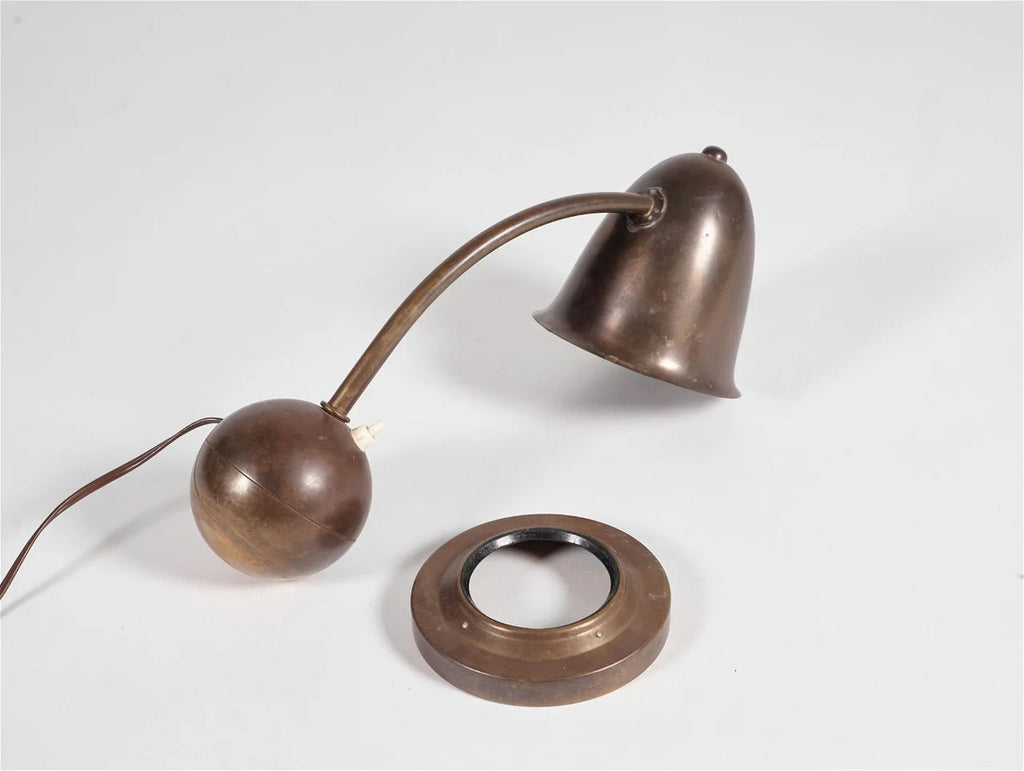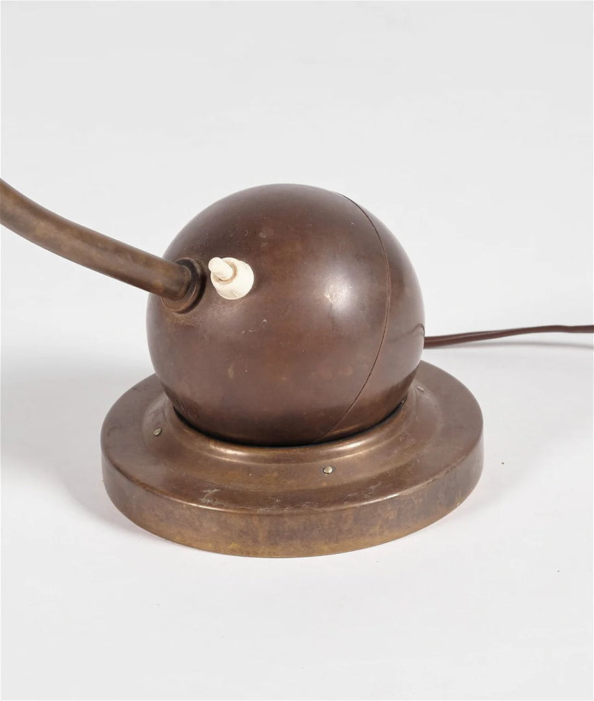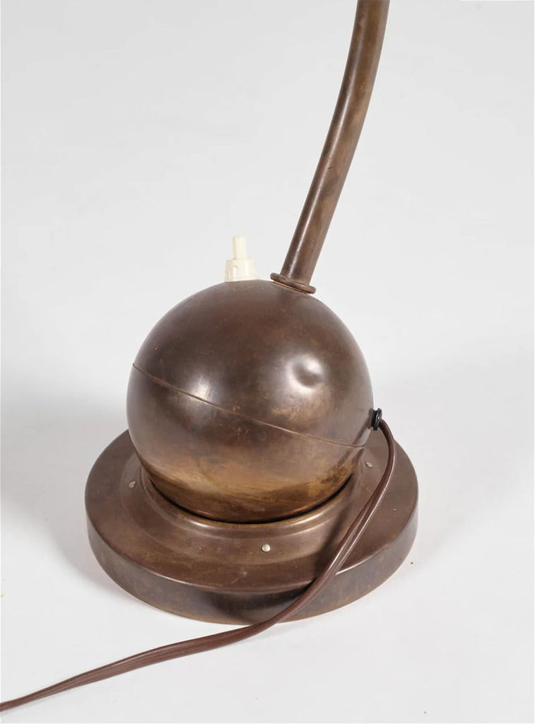 The lamp is made of brass and has a beautiful patina. The base can be placed on the ring in different positions.
