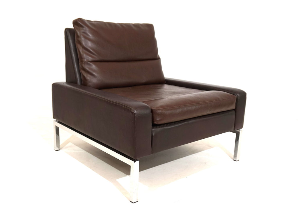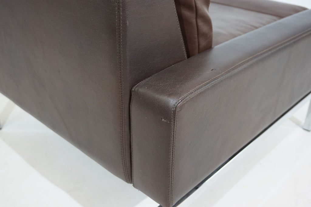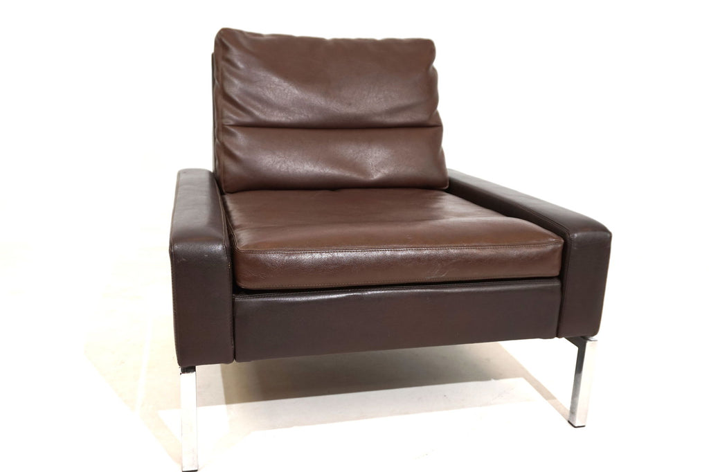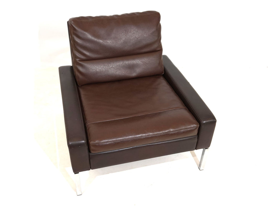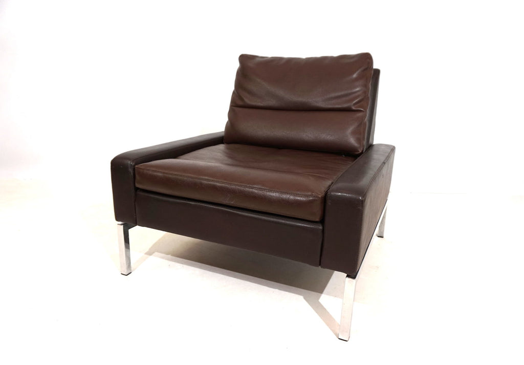 The lounge chair, made of dark brown faux leather with light brown seat and back cushions, is in good condition. The leather cover of the cushions shows hardly any signs of wear, the seating comfort is impeccable and the chrome frame is in good condition. The rear area of the right armrest has a small cut or abrasion. The clear lines of this armchair and the lightness of the chrome frame make up the timeless design. The German designer Hans Peter Piel designed the 800 series for Wilkhahn in the 1960s. The Wilkhahn company was founded as a chair factory by Friedrich Hahne and Christian Wilkening more than 100 years ago. In 1946, contact with the German Workshops was established with the designers Georg Leowald and Herbert Hirche, who worked in the tradition of the Bauhaus. Since then, Wilkhahn has been one of the premium manufacturers of office furniture.