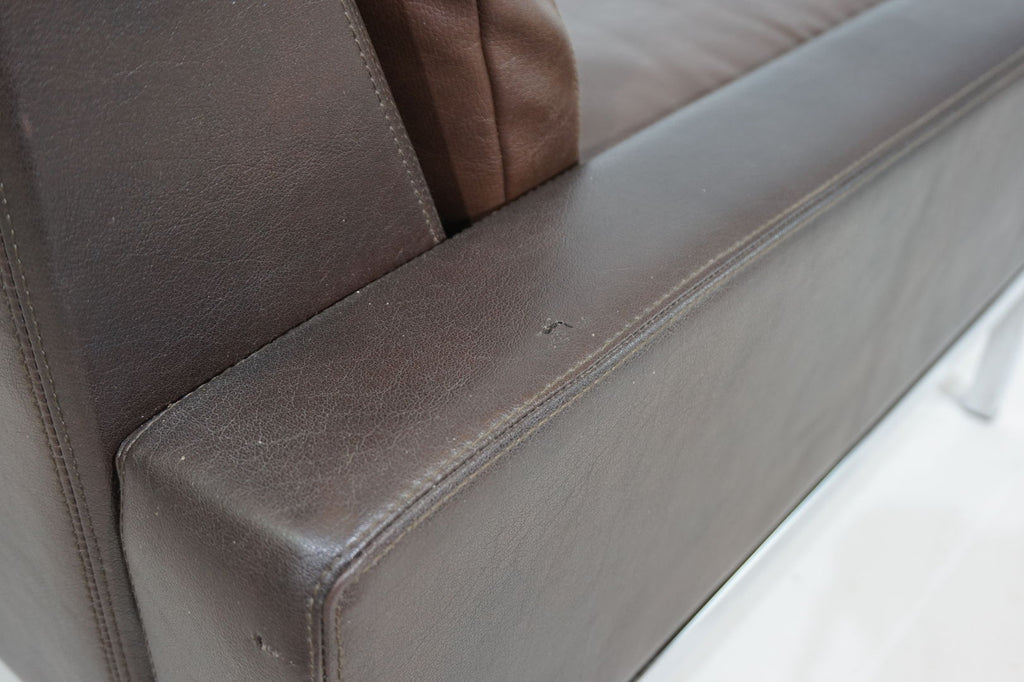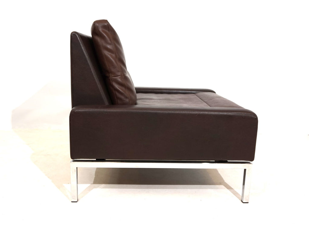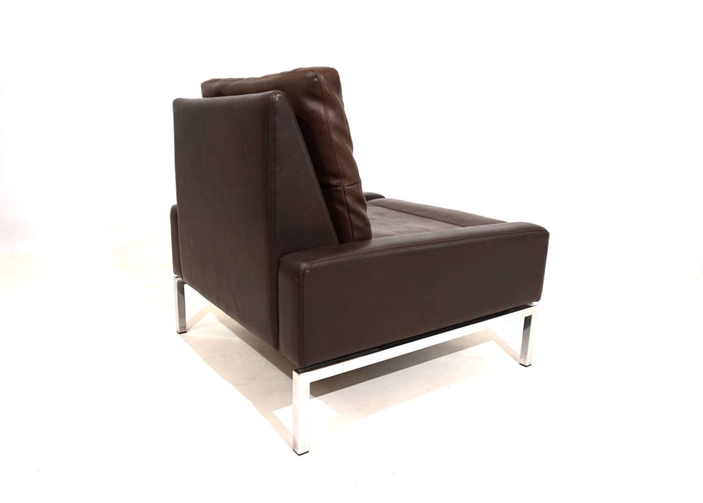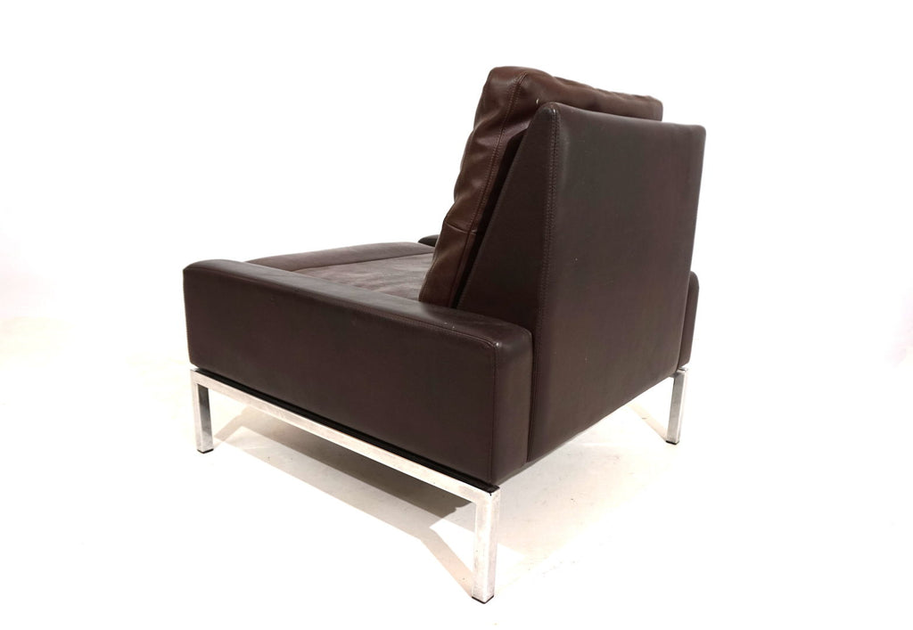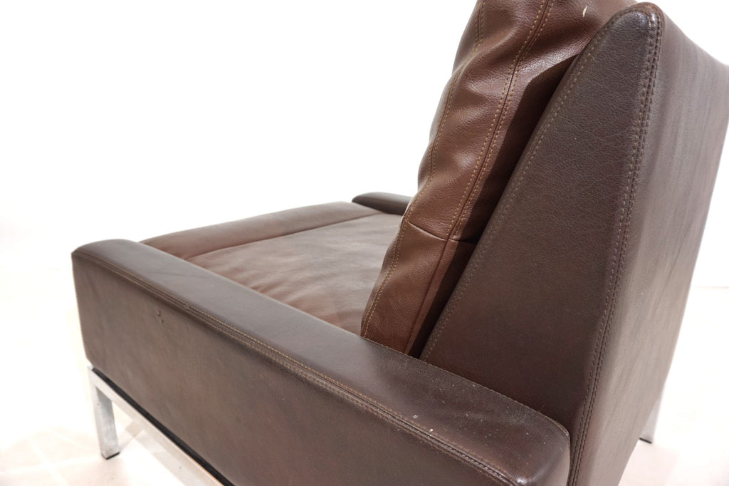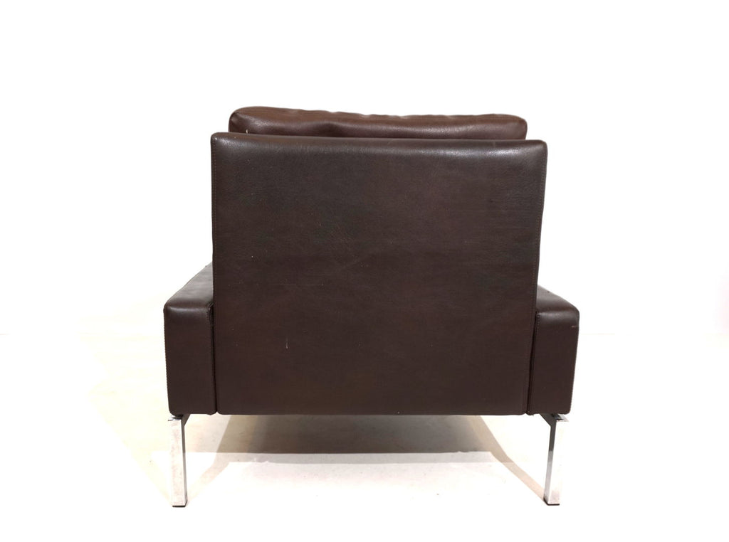 The lounge chair, made of dark brown faux leather with light brown seat and back cushions, is in good condition. The leather cover of the cushions shows hardly any signs of wear, the seating comfort is impeccable and the chrome frame is in good condition. The rear area of the right armrest has a small cut or abrasion. The clear lines of this armchair and the lightness of the chrome frame make up the timeless design. The German designer Hans Peter Piel designed the 800 series for Wilkhahn in the 1960s. The Wilkhahn company was founded as a chair factory by Friedrich Hahne and Christian Wilkening more than 100 years ago. In 1946, contact with the German Workshops was established with the designers Georg Leowald and Herbert Hirche, who worked in the tradition of the Bauhaus. Since then, Wilkhahn has been one of the premium manufacturers of office furniture.